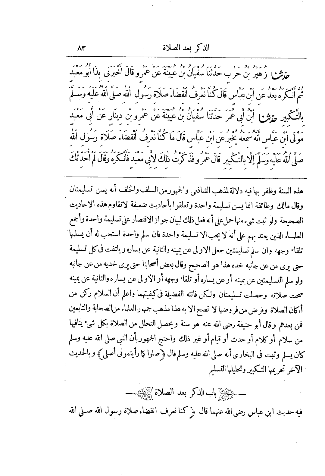 هَذِهِ السُّنَّةَ وَظَفِرَ بِهَا فِيهِ دَلَالَةٌ لِمَذْهَبِ الشَّافِعِيِّ وَالْجُمْهُورِ مِنَ السَّلَفِ وَالْخَلَفِ أَنَّهُ يُسَنُّ تَسْلِيمَتَانِ وَقَالَ مَالِكٌ وَطَائِفَةٌ إِنَّمَا يُسَنُّ تَسْلِيمَةٌ وَاحِدَةٌ وَتَعَلَّقُوا بِأَحَادِيثَ ضَعِيفَةٍ لَا تُقَاوِمُ هَذِهِ الْأَحَادِيثَ الصَّحِيحَةَ وَلَوْ ثَبَتَ شَيْءٌ مِنْهَا حُمِلَ عَلَى أَنَّهُ فَعَلَ ذَلِكَ لِبَيَانِ جَوَازِ الِاقْتِصَارِ عَلَى تَسْلِيمَةٍ وَاحِدَةٍ وَأَجْمَعَ الْعُلَمَاءُ الَّذِينَ يُعْتَدُّ بِهِمْ عَلَى أَنَّهُ لَا يَجِبُ إِلَّا تَسْلِيمَةٌ وَاحِدَةٌ فَإِنْ سَلَّمَ وَاحِدَةً اسْتُحِبَّ لَهُ أَنْ يُسَلِّمَهَا تِلْقَاءَ وَجْهِهِ وَإِنْ سَلَّمَ تَسْلِيمَتَيْنِ جَعَلَ الْأُولَى عَنْ يَمِينِهِ وَالثَّانِيَةَ عَنْ يَسَارِهِ وَيَلْتَفِتُ فِي كُلِّ تَسْلِيمَةٍ حَتَّى يَرَى مَنْ عَنْ جَانِبِهِ خَدَّهُ هَذَا هُوَ الصَّحِيحُ وَقَالَ بَعْضُ أَصْحَابِنَا حَتَّى يَرَى خَدَّيْهِ مَنْ عَنْ جَانِبِهِ وَلَوْ سَلَّمَ التَّسْلِيمَتَيْنِ عَنْ يَمِينِهِ أَوْ عَنْ يَسَارِهِ أَوْ تِلْقَاءَ وَجْهِهِ أَوِ الْأُولَى عَنْ يَسَارِهِ وَالثَّانِيَةَ عَنْ يَمِينِهِ صَحَّتْ صَلَاتُهُ وَحَصَلَتْ تَسْلِيمَتَانِ وَلَكِنْ فَاتَتْهُ الْفَضِيلَةُ فِي كَيْفِيَّتِهِمَا وَاعْلَمْ أَنَّ السَّلَامَ رُكْنٌ مِنْ أَرْكَانِ الصَّلَاةِ وَفَرْضٌ مِنْ فُرُوضِهَا لَا تَصِحُّ إِلَّا بِهِ هَذَا مَذْهَبُ جُمْهُورِ الْعُلَمَاءِ مِنَ الصَّحَابَةِ وَالتَّابِعِينَ فَمَنْ بَعْدَهُمْ وَقَالَ أَبُو حَنِيفَةَ رَضِيَ اللَّهُ عَنْهُ هُوَ سُنَّةٌ وَيَحْصُلُ التَّحَلُّلُ مِنَ الصَّلَاةِ بِكُلِّ شَيْءٍ يُنَافِيهَا مِنْ سَلَامٍ أَوْ كَلَامٍ أَوْ حَدَثٍ أَوْ قِيَامٍ أَوْ غَيْرِ ذَلِكَ وَاحْتَجَّ الْجُمْهُورُ بِأَنَّ النَّبِيَّ صَلَّى اللَّهُ عَلَيْهِ وَسَلَّمَ كَانَ يُسَلِّمُ وَثَبَتَ فِي الْبُخَارِيِّ أَنَّهُ صَلَّى اللَّهُ عَلَيْهِ وَسَلَّمَ قَالَ صَلُّوا كَمَا رَأَيْتُمُونِي أُصَلِّي وَبِالْحَدِيثِ الْآخَرِ تَحْرِيمُهَا التَّكْبِيرُ وَتَحْلِيلُهَا التَّسْلِيمُ