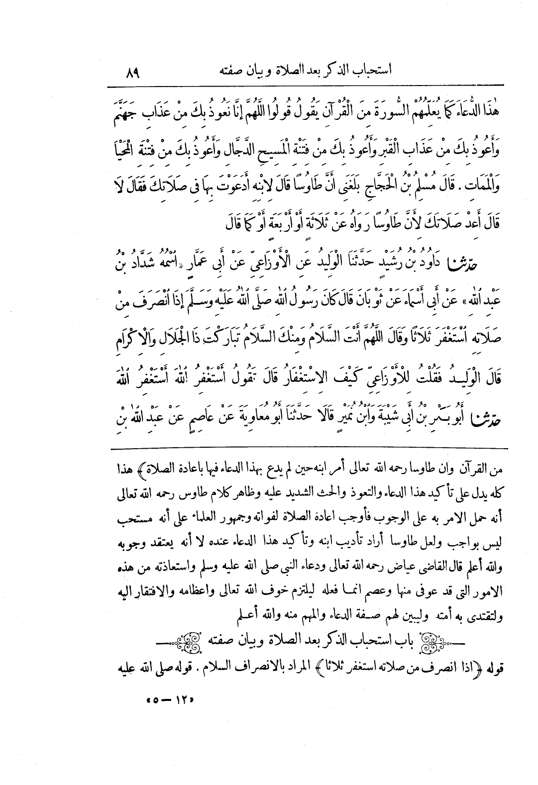 مِنَ الْقُرْآنِ وَإِنَّ طَاوُسًا رَحِمَهُ اللَّهُ تَعَالَى أَمَرَ ابْنَهُ حِينَ لَمْ يَدْعُ بِهَذَا الدُّعَاءِ فِيهَا بِإِعَادَةِ الصَّلَاةِ هَذَا كُلُّهُ يَدُلُّ عَلَى تَأْكِيدِ هَذَا الدُّعَاءِ وَالتَّعَوُّذِ وَالْحَثِّ الشَّدِيدِ عَلَيْهِ وَظَاهِرُ كَلَامِ طَاوُسٍ رَحِمَهُ اللَّهُ تَعَالَى أَنَّهُ حَمَلَ الْأَمْرَ بِهِ عَلَى الْوُجُوبِ فَأَوْجَبَ إِعَادَةَ الصَّلَاةِ لِفَوَاتِهِ وَجُمْهُورُ الْعُلَمَاءِ عَلَى أَنَّهُ مُسْتَحَبٌّ لَيْسَ بِوَاجِبٍ وَلَعَلَّ طَاوُسًا أَرَادَ تَأْدِيبَ ابْنَهُ وَتَأْكِيدَ هَذَا الدُّعَاءِ عِنْدَهُ لَا أَنَّهُ يَعْتَقِدُ وُجُوبَهُ وَاللَّهُ أَعْلَمُ قَالَ الْقَاضِي عِيَاضٌ رَحِمَهُ اللَّهُ تَعَالَى وَدُعَاءُ النَّبِيِّ صَلَّى اللَّهُ عَلَيْهِ وَسَلَّمَ وَاسْتِعَاذَتُهُ مِنْ هَذِهِ الْأُمُورِ الَّتِي قَدْ عُوفِيَ مِنْهَا وَعُصِمَ إِنَّمَا فَعَلَهُ لِيَلْتَزِمَ خَوْفَ اللَّهِ تَعَالَى وَإِعْظَامَهُ وَالِافْتِقَارَ إِلَيْهِ وَلِتَقْتَدِيَ بِهِ أُمَّتُهُ وَلِيُبَيِّنَ لَهُمْ صِفَةَ الدُّعَاءِ وَالْمُهِمَّ مِنْهُ وَاللَّهُ أَعْلَمُ