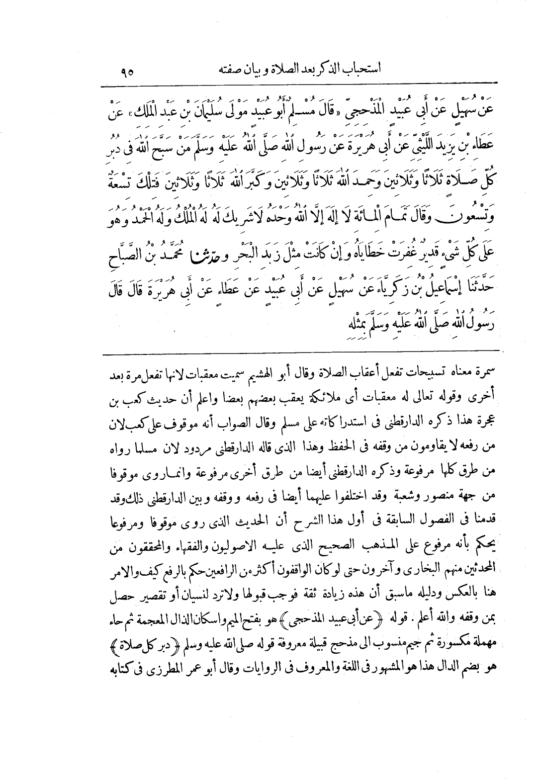 [597] قَوْلُهُ عَنْ أَبِي عُبَيْدٍ الْمَذْحِجِيِّ هُوَ بِفَتْحِ الْمِيمِ وَإِسْكَانِ الذَّالِ الْمُعْجَمَةِ ثُمَّ حَاءٍ مُهْمَلَةٍ مَكْسُورَةٍ ثُمَّ جِيمٍ مَنْسُوبٌ إِلَى مَذْحِجٍ قَبِيلَةٍ مَعْرُوفَةٍ قَوْلُهُ صَلَّى اللَّهُ عَلَيْهِ وَسَلَّمَ دُبُرَ كُلِّ صَلَاةٍ هُوَ بِضَمِّ الدَّالِ هَذَا هُوَ الْمَشْهُورُ فِي اللُّغَةِ وَالْمَعْرُوفُ فِي الرِّوَايَاتِ وَقَالَ أَبُو عُمَرَ الْمُطَرِّزِيُّ فِي كِتَابِهِ