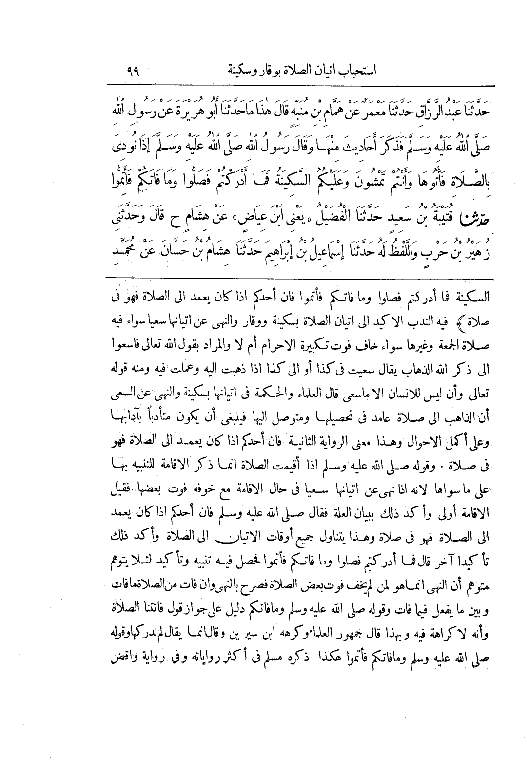 السَّكِينَةُ فَمَا أَدْرَكْتُمْ فَصَلُّوا وَمَا فَاتَكُمْ فَأَتِمُّوا فَإِنَّ أَحَدَكُمْ إِذَا كَانَ يَعْمِدُ إِلَى الصَّلَاةِ فهو في صلاة فِيهِ النَّدْبُ الْأَكِيدُ إِلَى إِتْيَانِ الصَّلَاةِ بِسَكِينَةٍ وَوَقَارٍ وَالنَّهْيُ عَنْ إِتْيَانِهَا سَعْيًا سَوَاءٌ فِيهِ صَلَاةُ الْجُمُعَةِ وَغَيْرُهَا سَوَاءٌ خَافَ فَوْتَ تَكْبِيرَةِ الْإِحْرَامِ أَمْ لَا وَالْمُرَادُ بِقَوْلِ اللَّهِ تَعَالَى فاسعوا إلى ذكر الله الذَّهَابُ يُقَالُ سَعَيْتُ فِي كَذَا أَوْ إِلَى كَذَا إِذَا ذَهَبْتُ إِلَيْهِ وَعَمِلْتُ فِيهِ وَمِنْهُ قَوْلُهُ تَعَالَى وَأَنْ لَيْسَ لِلْإِنْسَانِ إِلَّا مَا سَعَى قَالَ الْعُلَمَاءُ وَالْحِكْمَةُ فِي إِتْيَانِهَا بِسَكِينَةٍ وَالنَّهْيُ عن السعي أن الذاهب إلى صلاة عامد في تحصيلها ومتوصل إِلَيْهَا فَيَنْبَغِي أَنْ يَكُونَ مُتَأَدِّبًا بِآدَابِهَا وَعَلَى أَكْمَلِ الْأَحْوَالِ وَهَذَا مَعْنَى الرِّوَايَةِ الثَّانِيَةِ فَإِنَّ أَحَدَكُمْ إِذَا كَانَ يَعْمِدُ إِلَى الصَّلَاةِ فَهُوَ فِي صَلَاةٍ وَقَوْلُهُ صَلَّى اللَّهُ عَلَيْهِ وَسَلَّمَ إِذَا أُقِيمَتِ الصَّلَاةُ إِنَّمَا ذَكَرَ الْإِقَامَةَ لِلتَّنْبِيهِ بِهَا عَلَى مَا سِوَاهَا لِأَنَّهُ إِذَا نَهَى عَنْ إِتْيَانِهَا سَعْيًا فِي حَالِ الْإِقَامَةِ مَعَ خوفه فوت بعضها فقيل الْإِقَامَةِ أَوْلَى وَأَكَّدَ ذَلِكَ بِبَيَانِ الْعِلَّةِ فَقَالَ صَلَّى اللَّهُ عَلَيْهِ وَسَلَّمَ فَإِنَّ أَحَدَكُمْ إِذَا كَانَ يَعْمِدُ إِلَى الصَّلَاةِ فَهُوَ فِي صَلَاةٍ وَهَذَا يَتَنَاوَلُ جَمِيعَ أَوْقَاتِ الْإِتْيَانِ إِلَى الصَّلَاةِ وَأَكَّدَ ذَلِكَ تَأْكِيدًا آخَرَ قَالَ فَمَا أَدْرَكْتُمْ فَصَلُّوا وَمَا فَاتَكُمْ فَأَتِمُّوا فَحَصَلَ فِيهِ تَنْبِيهٌ وَتَأْكِيدٌ لِئَلَّا يَتَوَهَّمَ مُتَوَهِّمٌ أَنَّ النَّهْيَ إِنَّمَا هُوَ لِمَنْ لَمْ يَخَفْ فَوْتَ بَعْضِ الصَّلَاةِ فَصَرَّحَ بِالنَّهْيِ وَإِنْ فَاتَ مِنَ الصَّلَاةِ مَا فَاتَ وَبَيَّنَ مَا يُفْعَلُ فِيمَا فَاتَ وَقَوْلُهُ صَلَّى اللَّهُ عَلَيْهِ وَسَلَّمَ وَمَا فَاتَكُمْ دَلِيلٌ عَلَى جَوَازِ قَوْلِ فَاتَتْنَا الصَّلَاةُ وَأَنَّهُ لَا كَرَاهَةَ فِيهِ وَبِهَذَا قَالَ جُمْهُورُ الْعُلَمَاءِ وَكَرِهَهُ بن سِيرِينَ وَقَالَ إِنَّمَا يُقَالُ لَمْ نُدْرِكْهَا وَقَوْلُهُ صَلَّى اللَّهُ عَلَيْهِ وَسَلَّمَ وَمَا فَاتَكُمْ فَأَتِمُّوا هَكَذَا ذَكَرَهُ مُسْلِمٌ فِي أَكْثَرِ رِوَايَاتِهِ وَفِي رواية واقض