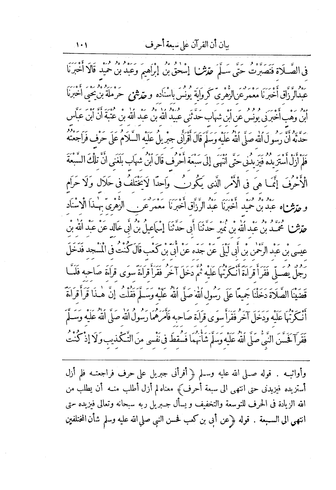 [819] قَوْلُهُ صَلَّى اللَّهُ عَلَيْهِ وَسَلَّمَ أَقْرَأَنِي جِبْرِيلُ عَلَى حَرْفٍ فَرَاجَعْتُهُ فَلَمْ أَزَلْ أَسْتَزِيدُهُ فَيَزِيدُنِي حَتَّى انْتَهَى إِلَى سَبْعَةِ أَحْرُفٍ مَعْنَاهُ لَمْ أَزَلْ أَطْلُبُ مِنْهُ أَنْ يَطْلُبَ مِنَ اللَّهِ الزِّيَادَةَ فِي الْحَرْفِ لِلتَّوْسِعَةِ وَالتَّخْفِيفِ وَيَسْأَلَ جِبْرِيلُ رَبَّهُ سُبْحَانَهُ وَتَعَالَى فَيَزِيدُهُ حَتَّى انْتَهَى إِلَى السَّبْعَةِ