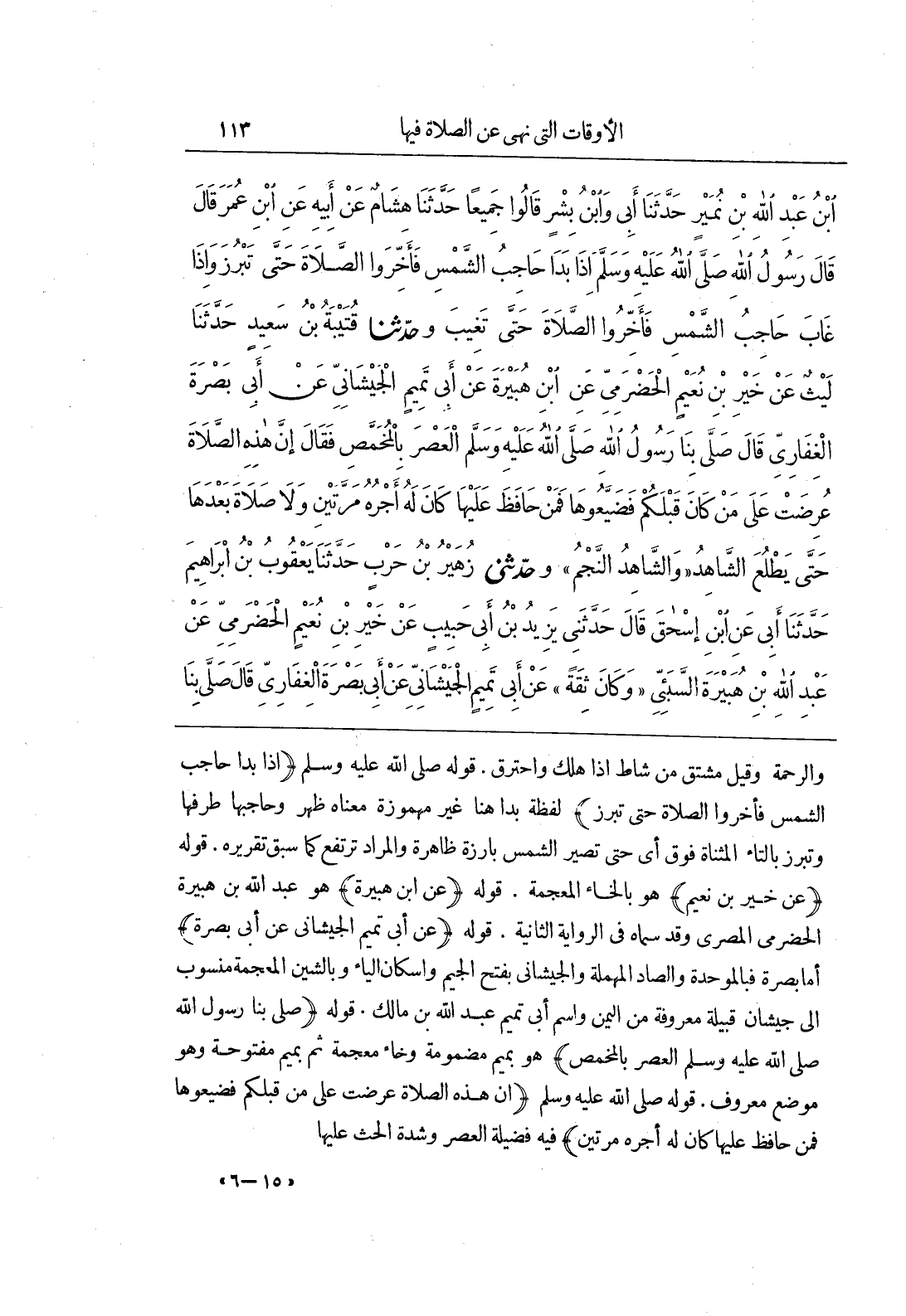 [830] قَوْلُهُ عَنْ خَيْرِ بْنِ نُعَيْمٍ هُوَ بِالْخَاءِ المعجمة قوله عن بن هُبَيْرَةَ هُوَ عَبْدُ اللَّهِ بْنُ هُبَيْرَةَ الْحَضْرَمِيُّ الْمِصْرِيُّ وَقَدْ سَمَّاهُ فِي الرِّوَايَةِ الثَّانِيَةِ قَوْلُهُ عَنْ أَبِي تَمِيمٍ الْجَيْشَانِيِّ عَنْ أَبِي بَصْرَةَ أَمَّا بَصْرَةُ فَبِالْمُوَحَّدَةِ وَالصَّادِ الْمُهْمَلَةِ وَالْجَيْشَانِيُّ بِفَتْحِ الْجِيمِ وَإِسْكَانِ الْيَاءِ وَبِالشِّينِ الْمُعْجَمَةِ مَنْسُوبٌ إِلَى جَيْشَانَ قَبِيلَةٍ مَعْرُوفَةٍ مِنَ الْيَمَنِ وَاسْمُ أَبِي تَمِيمٍ عَبْدُ اللَّهِ بْنُ مَالِكٍ قَوْلُهُ صَلَّى بِنَا رَسُولُ اللَّهِ صَلَّى اللَّهُ عَلَيْهِ وَسَلَّمَ الْعَصْرَ بِالْمُخْمَصِ هُوَ بِمِيمٍ مَضْمُومَةٍ وَخَاءٍ مُعْجَمَةٍ ثُمَّ بِمِيمٍ مَفْتُوحَةٍ وَهُوَ مَوْضِعٌ مَعْرُوفٌ قَوْلُهُ صَلَّى اللَّهُ عَلَيْهِ وَسَلَّمَ إِنَّ هَذِهِ الصَّلَاةَ عُرِضَتْ عَلَى مَنْ قَبْلَكُمْ فَضَيَّعُوهَا فَمَنْ حَافَظَ عَلَيْهَا كَانَ لَهُ أَجْرُهُ مَرَّتَيْنِ فِيهِ فَضِيلَةُ الْعَصْرِ وَشِدَّةُ الْحَثِّ عَلَيْهَا
