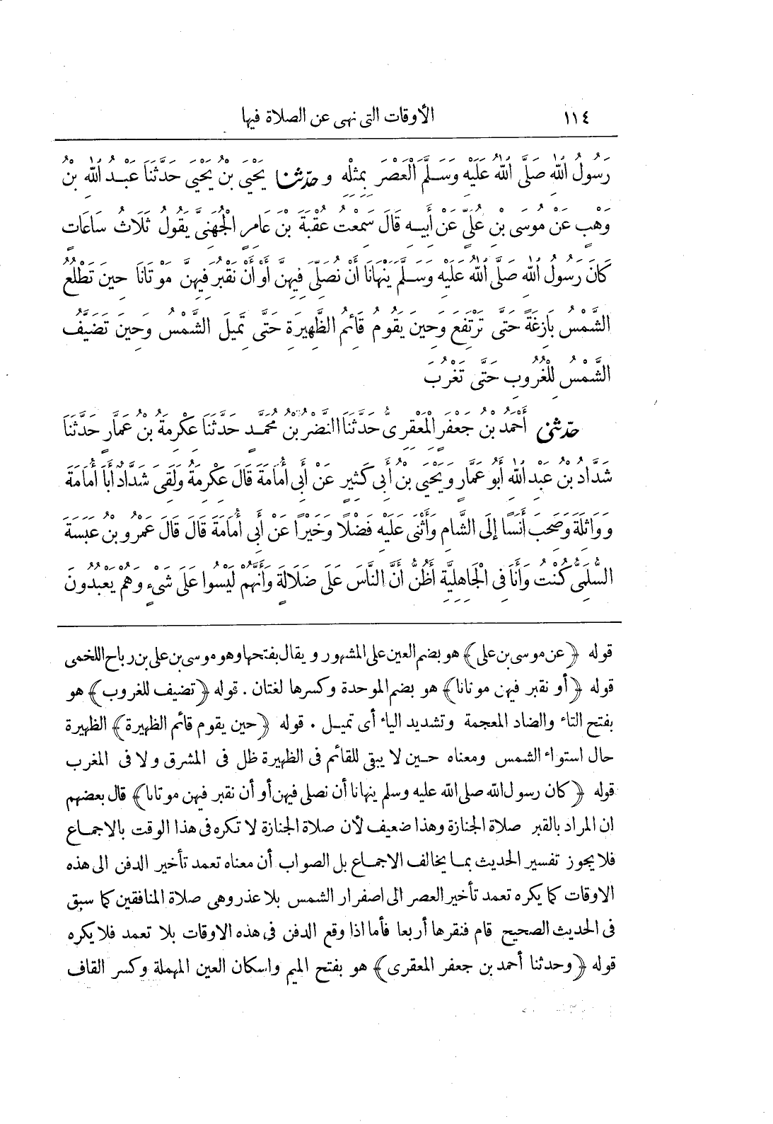 [831] قَوْلُهُ عَنْ مُوسَى بْنِ عُلَيٍّ هُوَ بِضَمِّ الْعَيْنِ عَلَى الْمَشْهُورِ وَيُقَالُ بِفَتْحِهَا وَهُوَ مُوسَى بْنُ عُلَيِّ بْنِ رَبَاحٍ اللَّخْمِيُّ قَوْلُهُ أَوْ نَقْبُرَ فِيهِنَّ مَوْتَانَا هُوَ بِضَمِّ الْمُوَحَّدَةِ وَكَسْرِهَا لُغَتَانِ قَوْلُهُ تَضَيَّفَ لِلْغُرُوبِ هُوَ بِفَتْحِ التَّاءِ وَالضَّادِ الْمُعْجَمَةِ وَتَشْدِيدِ الْيَاءِ أَيْ تَمِيلُ قَوْلُهُ حِينَ يَقُومُ قَائِمُ الظَّهِيرَةِ الظَّهِيرَةُ حَالُ اسْتِوَاءِ الشَّمْسِ وَمَعْنَاهُ حِينَ لَا يَبْقَى لِلْقَائِمِ فِي الظَّهِيرَةِ ظِلٌّ فِي الْمَشْرِقِ وَلَا فِي الْمَغْرِبِ قَوْلُهُ كَانَ رَسُولُ اللَّهِ صَلَّى اللَّهُ عَلَيْهِ وسلم ينهانا أن نصلي فيهن أو أن نَقْبُرَ فِيهِنَّ مَوْتَانَا قَالَ بَعْضُهُمْ إِنَّ الْمُرَادَ بِالْقَبْرِ صَلَاةُ الْجِنَازَةِ وَهَذَا ضَعِيفٌ لِأَنَّ صَلَاةَ الْجِنَازَةِ لَا تُكْرَهُ فِي هَذَا الْوَقْتِ بِالْإِجْمَاعِ فَلَا يَجُوزُ تَفْسِيرُ الْحَدِيثِ بِمَا يُخَالِفُ الْإِجْمَاعَ بَلِ الصَّوَابُ أَنَّ مَعْنَاهُ تَعَمُّدُ تَأْخِيرِ الدَّفْنِ إِلَى هَذِهِ الْأَوْقَاتِ كَمَا يُكْرَهُ تَعَمُّدُ تَأْخِيرِ الْعَصْرِ إِلَى اصْفِرَارِ الشَّمْسِ بِلَا عُذْرٍ وَهِيَ صَلَاةُ الْمُنَافِقِينَ كَمَا سَبَقَ فِي الْحَدِيثِ الصَّحِيحِ قَامَ فَنَقَرَهَا أَرْبَعًا فَأَمَّا إِذَا وَقَعَ الدَّفْنُ فِي هَذِهِ الْأَوْقَاتِ بِلَا تَعَمُّدٍ فَلَا يُكْرَهُ