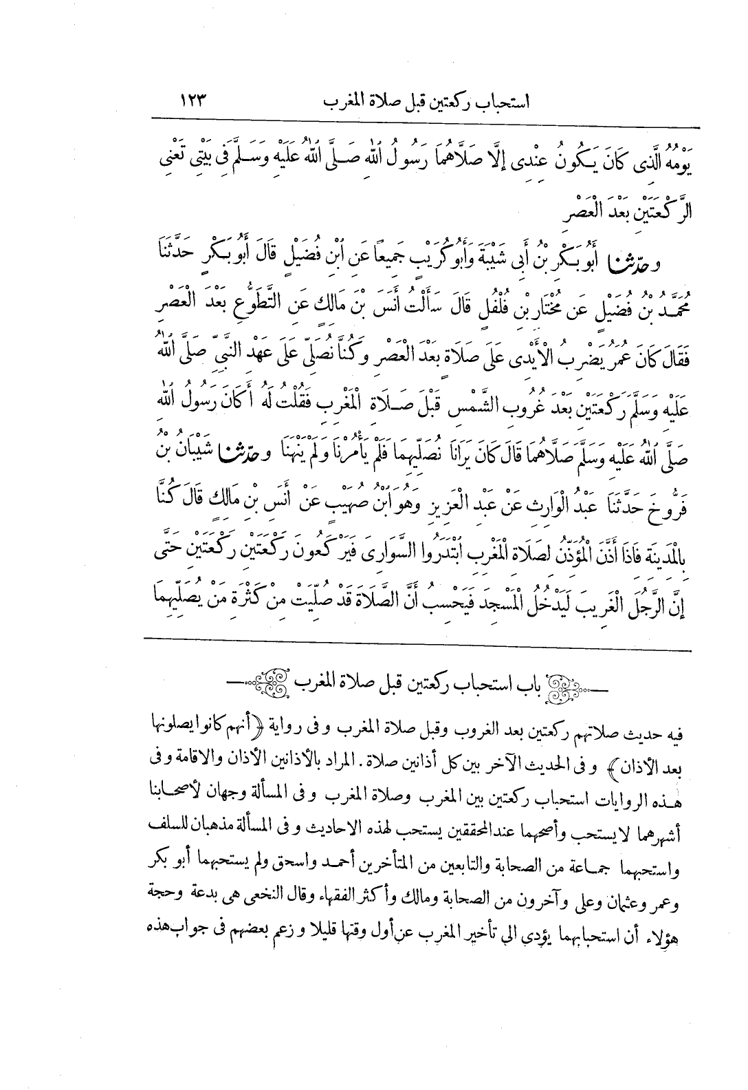 [836] فِيهِ حَدِيثُ صَلَاتِهِمْ رَكْعَتَيْنِ بَعْدَ الْغُرُوبِ وَقَبْلَ صَلَاةِ الْمَغْرِبِ وَفِي رِوَايَةٍ أَنَّهُمْ كَانُوا يُصَلُّونَهَا بَعْدَ الْأَذَانِ وَفِي الْحَدِيثِ الْآخَرِ بَيْنَ كُلِّ أَذَانَيْنِ صلاة المراد بالأذانين الأذان وَالْإِقَامَةِ وَفِي هَذِهِ الرِّوَايَاتِ اسْتِحْبَابُ رَكْعَتَيْنِ بَيْنَ الْمَغْرِبِ وَصَلَاةِ الْمَغْرِبِ وَفِي الْمَسْأَلَةِ وَجْهَانِ لِأَصْحَابِنَا أَشْهَرُهُمَا لَا يُسْتَحَبُّ وَأَصَحُّهُمَا عِنْدَ الْمُحَقِّقِينَ يُسْتَحَبُّ لِهَذِهِ الْأَحَادِيثِ وَفِي الْمَسْأَلَةِ مَذْهَبَانِ لِلسَّلَفِ وَاسْتَحَبَّهُمَا جَمَاعَةٌ مِنَ الصَّحَابَةِ وَالتَّابِعِينَ مِنَ الْمُتَأَخِّرِينَ أَحْمَدُ واسحق وَلَمْ يَسْتَحِبَّهُمَا أَبُو بَكْرٍ وَعُمَرُ وَعُثْمَانُ وَعَلِيٌّ وَآخَرُونَ مِنَ الصَّحَابَةِ وَمَالِكٌ وَأَكْثَرُ الْفُقَهَاءِ وَقَالَ النَّخَعِيُّ هِيَ بِدْعَةٌ وَحُجَّةُ هَؤُلَاءِ أَنَّ اسْتِحْبَابَهُمَا يُؤَدِّي إِلَى تَأْخِيرِ الْمَغْرِبِ عَنْ أَوَّلِ وَقْتِهَا قَلِيلًا وَزَعَمَ بَعْضُهُمْ فِي جَوَابِ هَذِهِ