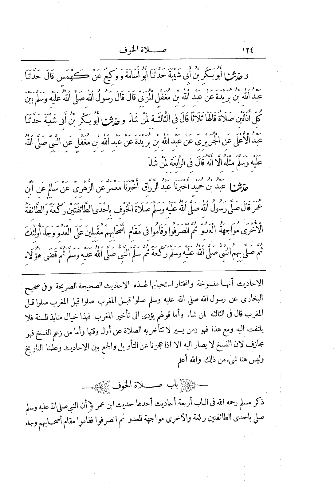 [839] ذَكَرَ مُسْلِمٌ رَحِمَهُ اللَّهُ فِي الْبَابِ أَرْبَعَةَ أَحَادِيثٍ أَحَدُهَا حديث بن عُمَرَ أَنَّ النَّبِيَّ صَلَّى اللَّهُ عَلَيْهِ وَسَلَّمَ صَلَّى بِإِحْدَى الطَّائِفَتَيْنِ رَكْعَةً وَالْأُخْرَى مُوَاجِهَةٌ لِلْعَدُوِّ ثُمَّ انْصَرَفُوا فَقَامُوا مَقَامَ أَصْحَابِهِمْ وَجَاءَ