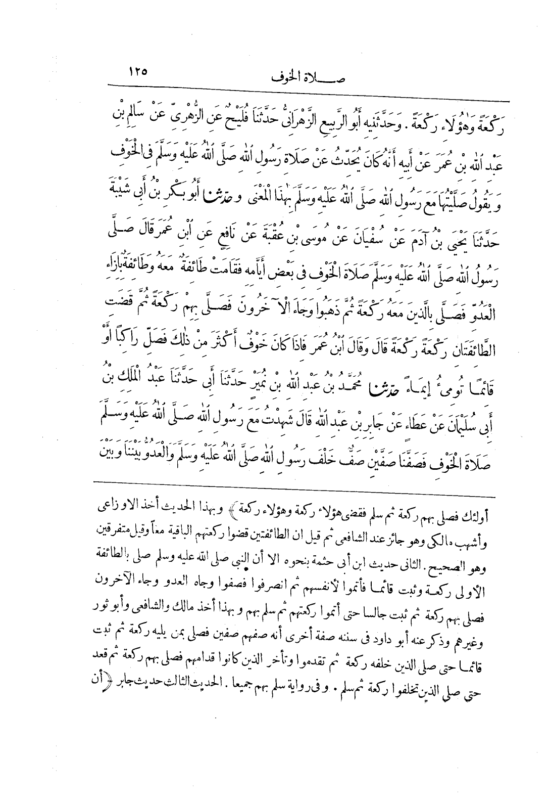 أُولَئِكَ فَصَلَّى بِهِمْ رَكْعَةً ثُمَّ سَلَّمَ فَقَضَى هَؤُلَاءِ رَكْعَةً وَهَؤُلَاءِ رَكْعَةً وَبِهَذَا الْحَدِيثِ أَخَذَ الأوزاعي وأشهب مالكي وَهُوَ جَائِزٌ عِنْدَ الشَّافِعِيِّ ثُمَّ قِيلَ إِنَّ الطَّائِفَتَيْنِ قَضَوْا رَكْعَتَهُمُ الْبَاقِيَةَ مَعًا وَقِيلَ مُتَفَرِّقِينَ وهو الصحيح الثاني حديث بن أَبِي حَثْمَةَ بِنَحْوِهِ إِلَّا أَنَّ النَّبِيَّ صَلَّى اللَّهُ عَلَيْهِ وَسَلَّمَ صَلَّى بِالطَّائِفَةِ الْأُولَى رَكْعَةً وَثَبَتَ قَائِمًا فَأَتَمُّوا لِأَنْفُسِهِمْ ثُمَّ انْصَرَفُوا فَصَفُّوا وِجَاهَ الْعَدُوِّ وَجَاءَ الْآخَرُونَ فَصَلَّى بِهِمْ رَكْعَةً ثُمَّ ثَبَتَ جَالِسًا حَتَّى أَتَمُّوا رَكْعَتَهُمْ ثُمَّ سَلَّمَ بِهِمْ وَبِهَذَا أَخَذَ مَالِكٌ وَالشَّافِعِيُّ وَأَبُو ثَوْرٍ وَغَيْرُهُمْ وَذَكَرَ عَنْهُ أَبُو دَاوُدَ فِي سُنَنِهِ صِفَةً أُخْرَى أَنَّهُ صَفَّهُمْ صَفَّيْنِ فَصَلَّى بِمَنْ يَلِيهِ رَكْعَةً ثُمَّ ثَبَتَ قَائِمًا حَتَّى صَلَّى الَّذِينَ خَلْفَهُ رَكْعَةً ثُمَّ تَقَدَّمُوا وَتَأَخَّرَ الَّذِينَ كَانُوا قُدَّامَهُمْ فَصَلَّى بِهِمْ رَكْعَةً ثُمَّ قَعَدَ حَتَّى صَلَّى الَّذِينَ تَخَلَّفُوا رَكْعَةً ثُمَّ سَلَّمَ وَفِي رِوَايَةٍ سَلَّمَ بِهِمْ جَمِيعًا الْحَدِيثُ الثَّالِثُ حَدِيثُ جَابِرٍ أَنَّ