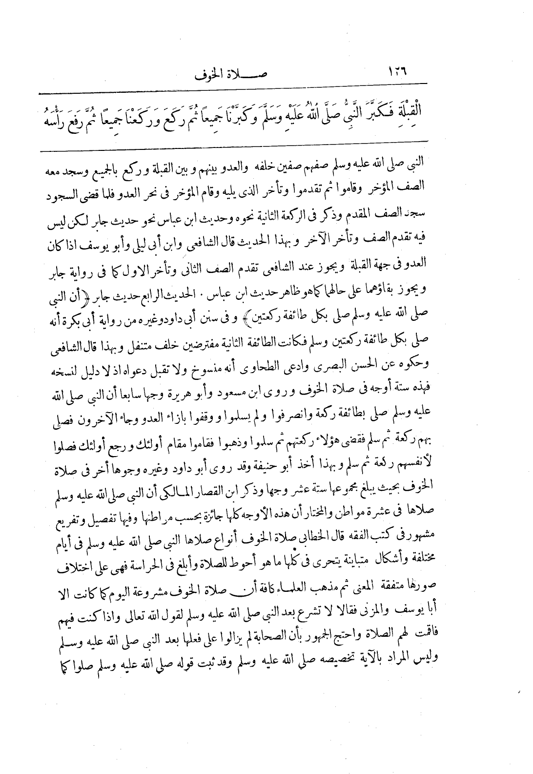 [840] الْحَدِيثُ الرَّابِعُ حَدِيثُ جَابِرٍ أَنَّ النَّبِيَّ صَلَّى اللَّهُ عَلَيْهِ وَسَلَّمَ صَلَّى بِكُلِّ طَائِفَةٍ رَكْعَتَيْنِ وَفِي سُنَنِ أَبِي دَاوُدَ وَغَيْرِهِ مِنْ رِوَايَةِ أَبِي بَكْرَةَ أَنَّهُ صَلَّى بِكُلِّ طَائِفَةٍ رَكْعَتَيْنِ وَسَلَّمَ فَكَانَتِ الطَّائِفَةُ الثَّانِيَةُ مُفْتَرِضِينَ خَلْفَ مُتَنَفِّلٍ وَبِهَذَا قَالَ الشَّافِعِيُّ وَحَكَوْهُ عَنِ الْحَسَنِ الْبَصْرِيِّ وَادَّعَى الطَّحَاوِيُّ أَنَّهُ مَنْسُوخٌ وَلَا تُقْبَلُ دَعْوَاهُ إِذْ لَا دَلِيلَ لِنَسْخِهِ فَهَذِهِ سِتَّةُ أوجه في صلاة الخوف وروى بن مَسْعُودٍ وَأَبُو هُرَيْرَةَ وَجْهًا سَابِعًا أَنَّ النَّبِيَّ صَلَّى اللَّهُ عَلَيْهِ وَسَلَّمَ صَلَّى بِطَائِفَةٍ رَكْعَةً وَانْصَرَفُوا وَلَمْ يُسَلِّمُوا وَوَقَفُوا بِإِزَاءِ الْعَدُوِّ وَجَاءَ الْآخَرُونَ فَصَلَّى بِهِمْ رَكْعَةً ثُمَّ سَلَّمَ فَقَضَى هَؤُلَاءِ رَكْعَتَهُمْ ثُمَّ سَلَّمُوا وَذَهَبُوا فَقَامُوا مَقَامَ أُولَئِكَ وَرَجَعَ أُولَئِكَ فَصَلُّوا لِأَنْفُسِهِمْ رَكْعَةً ثُمَّ سَلَّمَ وَبِهَذَا أَخَذَ أَبُو حَنِيفَةَ وَقَدْ رَوَى أَبُو دَاوُدَ وَغَيْرُهُ وُجُوهًا أُخَرَ فِي صَلَاةِ الْخَوْفِ بِحَيْثُ يَبْلُغُ مَجْمُوعُهَا سِتَّةَ عَشَرَ وَجْهًا وذكر بن الْقَصَّارِ الْمَالِكِيُّ أَنَّ النَّبِيَّ صَلَّى اللَّهُ عَلَيْهِ وَسَلَّمَ صَلَّاهَا فِي عَشَرَةِ مَوَاطِنَ وَالْمُخْتَارُ أَنَّ هَذِهِ الْأَوْجُهَ كُلَّهَا جَائِزَةٌ بِحَسَبِ مَوَاطِنِهَا وَفِيهَا تَفْصِيلٌ وَتَفْرِيعٌ مَشْهُورٌ فِي كُتُبِ الْفِقْهِ قَالَ الْخَطَّابِيُّ صَلَاةُ الْخَوْفِ أَنْوَاعٌ صَلَّاهَا النَّبِيُّ صَلَّى اللَّهُ عَلَيْهِ وَسَلَّمَ فِي أَيَّامٍ مُخْتَلِفَةٍ وَأَشْكَالٍ مُتَبَايِنَةٍ يَتَحَرَّى فِي كُلِّهَا مَا هُوَ أَحْوَطُ لِلصَّلَاةِ وَأَبْلَغُ فِي الْحِرَاسَةِ فَهِيَ عَلَى اخْتِلَافِ صُوَرِهَا مُتَّفِقَةُ الْمَعْنَى ثُمَّ مَذْهَبُ الْعُلَمَاءِ كَافَّةً أَنَّ صَلَاةَ الْخَوْفِ مَشْرُوعَةٌ الْيَوْمَ كَمَا كَانَتْ إِلَّا أَبَا يُوسُفَ وَالْمُزَنِيَّ فَقَالَا لَا تُشْرَعُ بَعْدَ النَّبِيِّ صَلَّى اللَّهُ عَلَيْهِ وَسَلَّمَ لِقَوْلِ اللَّهِ تَعَالَى وَإِذَا كُنْتَ فِيهِمْ فَأَقَمْتَ لَهُمُ الصَّلَاةَ وَاحْتَجَّ الْجُمْهُورُ بِأَنَّ الصَّحَابَةَ لَمْ يَزَالُوا عَلَى فِعْلِهَا بَعْدَ النَّبِيِّ صَلَّى اللَّهُ عَلَيْهِ وَسَلَّمَ وَلَيْسَ الْمُرَادُ بِالْآيَةِ تَخْصِيصَهُ صَلَّى اللَّهُ عَلَيْهِ وَسَلَّمَ وَقَدْ ثَبَتَ قَوْلُهُ صَلَّى اللَّهُ عَلَيْهِ وَسَلَّمَ صَلُّوا كَمَا