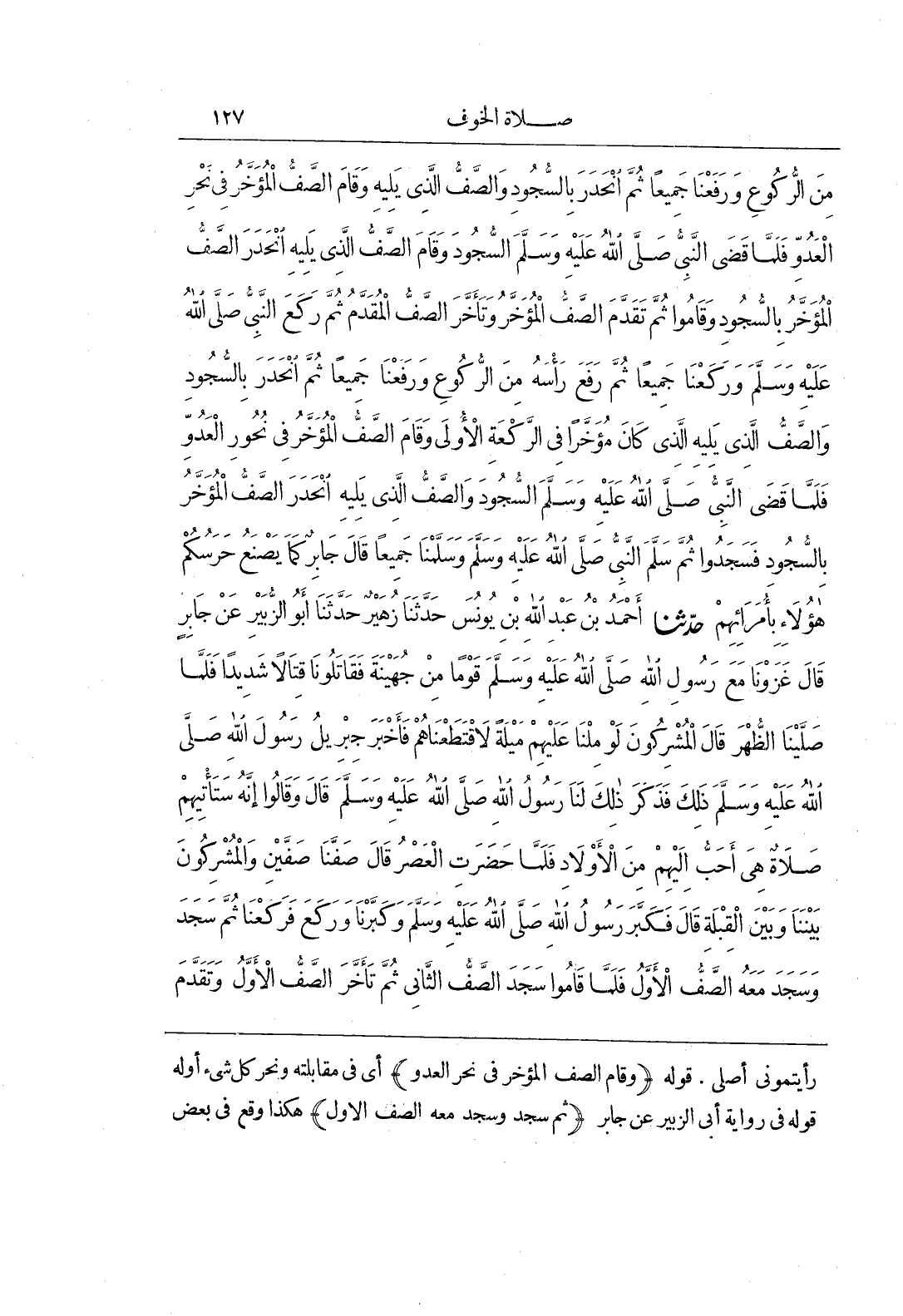 رَأَيْتُمُونِي أُصَلِّي قَوْلُهُ وَقَامَ الصَّفُّ الْمُؤَخَّرُ فِي نَحْرِ الْعَدُوِّ أَيْ فِي مُقَابَلَتِهِ وَنَحْرُ كُلِّ شي أَوَّلُهُ قَوْلُهُ فِي رِوَايَةِ أَبِي الزُّبَيْرِ عَنْ جَابِرٍ ثُمَّ سَجَدَ وَسَجَدَ مَعَهُ الصَّفُّ الْأَوَّلُ هَكَذَا وَقَعَ فِي بَعْضِ