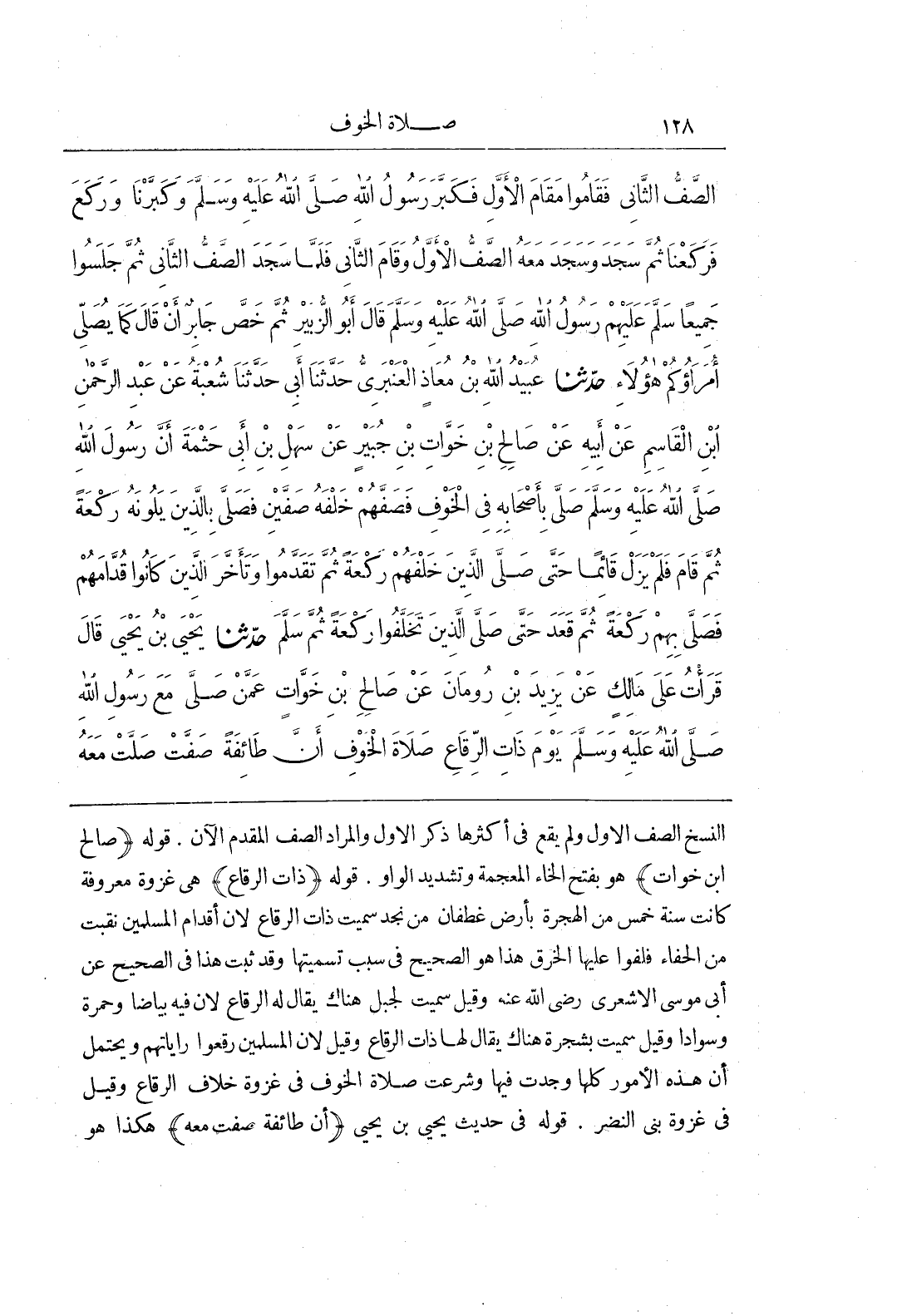 [841] قَوْلُهُ صَالِحُ بْنُ خَوَّاتٍ هُوَ بِفَتْحِ الْخَاءِ الْمُعْجَمَةِ وَتَشْدِيدِ الْوَاوِ قَوْلُهُ ذَاتُ الرِّقَاعِ هِيَ غَزْوَةٌ مَعْرُوفَةٌ كَانَتْ سَنَةَ خَمْسٍ مِنَ الْهِجْرَةِ بِأَرْضِ غَطَفَانَ مِنْ نَجْدٍ سُمِّيَتْ ذَاتَ الرِّقَاعِ لِأَنَّ أَقْدَامَ الْمُسْلِمِينَ نُقِّبَتْ مِنَ الْحَفَاءِ فَلَفُّوا عَلَيْهَا الْخِرَقَ هَذَا هُوَ الصَّحِيحُ فِي سَبَبِ تَسْمِيَتِهَا وَقَدْ ثَبَتَ هَذَا فِي الصَّحِيحِ عَنْ أَبِي مُوسَى الْأَشْعَرِيِّ رَضِيَ اللَّهُ عَنْهُ وَقِيلَ سُمِّيَتْ لِجَبَلٍ هُنَاكَ يُقَالُ لَهُ الرِّقَاعُ لِأَنَّ فِيهِ بَيَاضًا وَحُمْرَةً وَسَوَادًا وَقِيلَ سُمِّيَتْ بِشَجَرَةٍ هُنَاكَ يُقَالُ لَهَا ذَاتُ الرِّقَاعِ وَقِيلَ لِأَنَّ الْمُسْلِمِينَ رَقَعُوا رَايَاتِهِمْ وَيَحْتَمِلُ أَنَّ هَذِهِ الْأُمُورَ كُلَّهَا وجدت فيها وَشُرِعَتْ صَلَاةُ الْخَوْفِ فِي غَزْوَةٍ خِلَافَ الرِّقَاعِ وَقِيلَ فِي غَزْوَةِ بَنِي النَّضْرِ