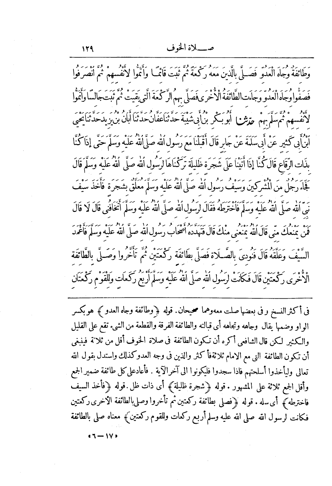 [843] قَوْلُهُ شَجَرَةٌ ظَلِيلَةٌ أَيْ ذَاتُ ظِلٍّ قَوْلُهُ فَأَخَذَ السَّيْفَ فَاخْتَرَطَهُ أَيْ سَلَّهُ قَوْلُهُ فَصَلَّى بِطَائِفَةٍ رَكْعَتَيْنِ ثُمَّ تَأَخَّرُوا وَصَلَّى بِالطَّائِفَةِ الْأُخْرَى رَكْعَتَيْنِ فَكَانَتْ لِرَسُولِ اللَّهِ صَلَّى اللَّهُ عَلَيْهِ وَسَلَّمَ أَرْبَعَ رَكَعَاتٍ وَلِلْقَوْمِ رَكْعَتَيْنِ مَعْنَاهُ صَلَّى بالطائفة