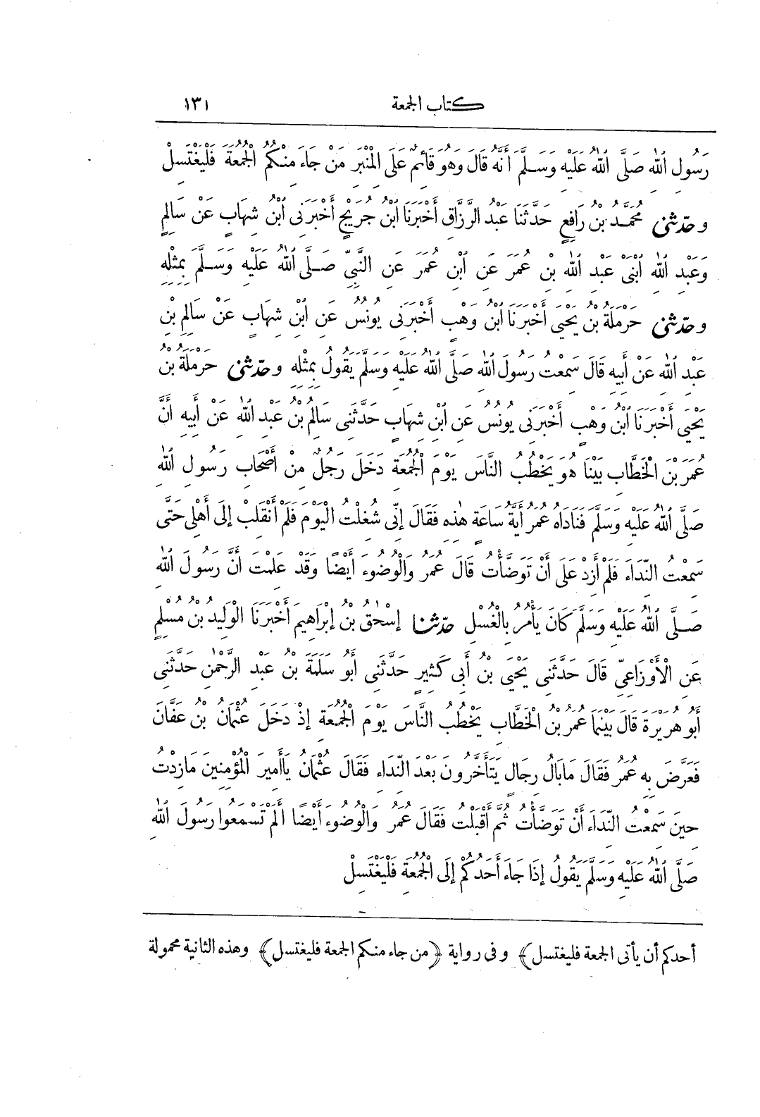 أَحَدُكُمْ أَنْ يَأْتِيَ الْجُمُعَةَ فَلْيَغْتَسِلْ وَفِي رِوَايَةٍ مَنْ جَاءَ مِنْكُمُ الْجُمُعَةَ فَلْيَغْتَسِلْ وَهَذِهِ الثَّانِيَةُ محمولة