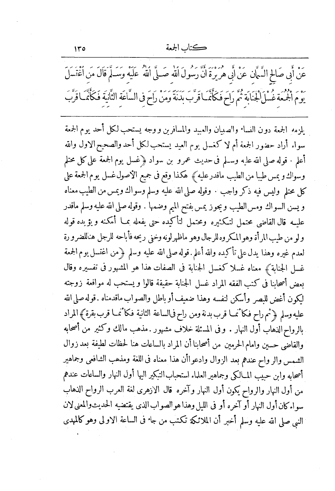 [850] قَوْلُهُ صَلَّى اللَّهُ عَلَيْهِ وَسَلَّمَ مَنِ اغْتَسَلَ يَوْمَ الْجُمُعَةِ غُسْلَ الْجَنَابَةِ مَعْنَاهُ غُسْلًا كَغُسْلِ الْجَنَابَةِ فِي الصِّفَاتِ هَذَا هُوَ الْمَشْهُورُ فِي تَفْسِيرِهِ وَقَالَ بَعْضُ أَصْحَابِنَا فِي كُتُبِ الْفِقْهِ الْمُرَادُ غُسْلُ الْجَنَابَةِ حَقِيقَةً قَالُوا وَيُسْتَحَبُّ لَهُ مُوَاقَعَةُ زَوْجَتِهِ لِيَكُونَ أَغَضَّ لِلْبَصَرِ وَأَسْكَنَ لِنَفْسِهِ وَهَذَا ضَعِيفٌ أَوْ بَاطِلٌ وَالصَّوَابُ مَا قَدَّمْنَاهُ قَوْلُهُ صَلَّى اللَّهُ عَلَيْهِ وَسَلَّمَ ثُمَّ رَاحَ فَكَأَنَّمَا قَرَّبَ بَدَنَةً وَمَنْ رَاحَ فِي السَّاعَةِ الثَّانِيَةِ فَكَأَنَّمَا قَرَّبَ بَقَرَةً الْمُرَادُ بِالرَّوَاحِ الذَّهَابُ أَوَّلَ النَّهَارِ وَفِي الْمَسْأَلَةِ خِلَافٌ مَشْهُورٌ مَذْهَبُ مَالِكٍ وَكَثِيرٍ مِنْ أَصْحَابِهِ وَالْقَاضِي حُسَيْنٍ وَإِمَامِ الْحَرَمَيْنِ مِنْ أَصْحَابِنَا أَنَّ الْمُرَادَ بِالسَّاعَاتِ هُنَا لَحَظَاتٌ لَطِيفَةٌ بَعْدَ زَوَالِ الشَّمْسِ وَالرَّوَاحُ عِنْدَهُمْ بَعْدَ الزَّوَالِ وَادَّعَوْا أَنَّ هَذَا مَعْنَاهُ فِي اللُّغَةِ ومذهب الشافعي وجماهير أصحابه وبن حَبِيبٍ الْمَالِكِيِّ وَجَمَاهِيرِ الْعُلَمَاءِ اسْتِحْبَابُ التَّبْكِيرِ إِلَيْهَا أَوَّلَ النَّهَارِ وَالسَّاعَاتُ عِنْدَهُمْ مِنْ أَوَّلِ النَّهَارِ وَالرَّوَاحُ يَكُونُ أَوَّلَ النَّهَارِ وَآخِرَهُ قَالَ الْأَزْهَرِيُّ لُغَةُ الْعَرَبِ الرَّوَاحُ الذَّهَابُ سَوَاءٌ كَانَ أَوَّلَ النَّهَارِ أَوْ آخِرَهُ أَوْ فِي اللَّيْلِ وَهَذَا هُوَ الصَّوَابُ الَّذِي يَقْتَضِيهِ الْحَدِيثُ وَالْمَعْنَى لِأَنَّ النَّبِيَّ صَلَّى اللَّهُ عَلَيْهِ وَسَلَّمَ أَخْبَرَ أَنَّ الْمَلَائِكَةَ تَكْتُبُ مَنْ جَاءَ فِي السَّاعَةِ الْأُولَى وهو كالمهدي