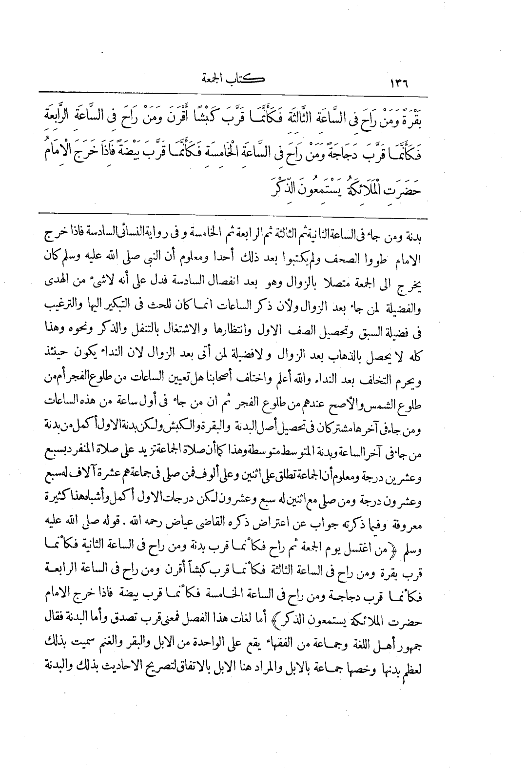 بَدَنَةً وَمَنْ جَاءَ فِي السَّاعَةِ الثَّانِيَةِ ثُمَّ الثَّالِثَةِ ثُمَّ الرَّابِعَةِ ثُمَّ الْخَامِسَةِ وَفِي رِوَايَةِ النَّسَائِيِّ السَّادِسَةِ فَإِذَا خَرَجَ الْإِمَامُ طَوَوْا الصُّحُفَ وَلَمْ يَكْتُبُوا بَعْدَ ذَلِكَ أَحَدًا وَمَعْلُومٌ أَنَّ النَّبِيَّ صَلَّى اللَّهُ عَلَيْهِ وَسَلَّمَ كَانَ يَخْرُجُ إِلَى الْجُمُعَةِ مُتَّصِلًا بِالزَّوَالِ وَهُوَ بَعْدَ انْفِصَالِ السَّادِسَةِ فَدَلَّ عَلَى أَنَّهُ لَا شَيْءَ مِنَ الْهَدْيِ وَالْفَضِيلَةِ لِمَنْ جَاءَ بَعْدَ الزَّوَالِ وَلِأَنَّ ذِكْرَ السَّاعَاتِ إِنَّمَا كَانَ لِلْحَثِّ فِي التَّبْكِيرِ إِلَيْهَا وَالتَّرْغِيبِ فِي فَضِيلَةِ السَّبْقِ وَتَحْصِيلِ الصَّفِّ الْأَوَّلِ وَانْتِظَارِهَا وَالِاشْتِغَالِ بِالتَّنَفُّلِ وَالذِّكْرِ وَنَحْوِهِ وَهَذَا كُلُّهُ لَا يَحْصُلُ بِالذَّهَابِ بَعْدَ الزَّوَالِ وَلَا فَضِيلَةَ لِمَنْ أَتَى بَعْدَ الزَّوَالِ لِأَنَّ النِّدَاءَ يَكُونُ حِينَئِذٍ وَيَحْرُمُ التَّخَلُّفُ بَعْدَ النِّدَاءِ وَاللَّهُ أَعْلَمُ وَاخْتَلَفَ أَصْحَابُنَا هَلْ تَعْيِينُ السَّاعَاتِ مِنْ طُلُوعِ الْفَجْرِ أَمْ مِنْ طُلُوعِ الشَّمْسِ وَالْأَصَحُّ عِنْدَهُمْ مِنْ طُلُوعِ الْفَجْرِ ثُمَّ إِنَّ مَنْ جَاءَ فِي أَوَّلِ سَاعَةٍ مِنْ هَذِهِ السَّاعَاتِ وَمَنْ جَاءَ فِي آخِرِهَا مُشْتَرَكَانِ فِي تَحْصِيلِ أَصْلِ الْبَدَنَةِ وَالْبَقَرَةِ وَالْكَبْشِ وَلَكِنْ بَدَنَةُ الْأَوَّلِ أَكْمَلُ مِنْ بَدَنَةِ مَنْ جَاءَ فِي آخِرِ السَّاعَةِ وَبَدَنَةُ الْمُتَوَسِّطِ مُتَوَسِّطَةٌ وَهَذَا كَمَا أَنَّ صَلَاةَ الْجَمَاعَةِ تَزِيدُ عَلَى صَلَاةِ الْمُنْفَرِدِ بِسَبْعٍ وَعِشْرِينَ دَرَجَةً وَمَعْلُومٌ أَنَّ الْجَمَاعَةَ تُطْلَقُ عَلَى اثْنَيْنِ وَعَلَى أُلُوفٍ فَمَنْ صَلَّى فِي جَمَاعَةٍ هُمْ عَشَرَةُ آلَافٍ لَهُ سَبْعٌ وَعِشْرُونَ دَرَجَةً وَمَنْ صَلَّى مَعَ اثْنَيْنِ لَهُ سَبْعٌ وَعِشْرُونَ لكن درجات الأول أكمل وأشباه هذا كثيرة مَعْرُوفَةٌ وَفِيمَا ذَكَرْتُهُ جَوَابٌ عَنِ اعْتِرَاضٍ ذَكَرَهُ الْقَاضِي عِيَاضٌ رَحِمَهُ اللَّهُ قَوْلُهُ صَلَّى اللَّهُ عَلَيْهِ وَسَلَّمَ مَنِ اغْتَسَلَ يَوْمَ الْجُمُعَةِ ثُمَّ رَاحَ فَكَأَنَّمَا قَرَّبَ بَدَنَةً وَمَنْ رَاحَ فِي السَّاعَةِ الثَّانِيَةِ فَكَأَنَّمَا قَرَّبَ بَقَرَةً وَمَنْ رَاحَ فِي السَّاعَةِ الثَّالِثَةِ فَكَأَنَّمَا قَرَّبَ كَبْشًا أَقْرَنَ وَمَنْ رَاحَ فِي السَّاعَةِ الرَّابِعَةِ فَكَأَنَّمَا قَرَّبَ دَجَاجَةً وَمَنْ رَاحَ فِي السَّاعَةِ الْخَامِسَةِ فَكَأَنَّمَا قَرَّبَ بَيْضَةً فَإِذَا خَرَجَ الْإِمَامُ حَضَرَتِ الْمَلَائِكَةُ يَسْتَمِعُونَ الذِّكْرَ أَمَّا لُغَاتُ هَذَا الْفَصْلِ فَمَعْنَى قَرَّبَ تَصَدَّقَ وَأَمَّا الْبَدَنَةُ فَقَالَ جُمْهُورُ أَهْلِ اللُّغَةِ وَجَمَاعَةٌ مِنَ الْفُقَهَاءِ يَقَعُ عَلَى الْوَاحِدَةِ مِنَ الْإِبِلِ وَالْبَقَرِ وَالْغَنَمِ سُمِّيَتْ بِذَلِكَ لِعِظَمِ بَدَنِهَا وَخَصَّهَا جَمَاعَةٌ بِالْإِبِلِ وَالْمُرَادُ هُنَا الْإِبِلُ بِالِاتِّفَاقِ لِتَصْرِيحِ الْأَحَادِيثِ بِذَلِكَ وَالْبَدَنَةُ