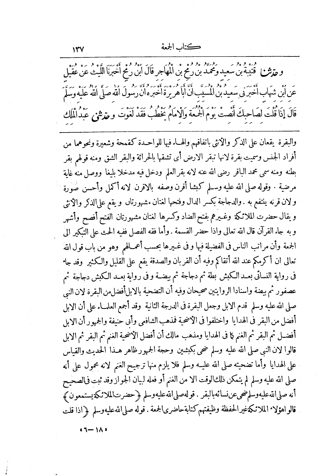 وَالْبَقَرَةُ يَقَعَانِ عَلَى الذَّكَرِ وَالْأُنْثَى بِاتِّفَاقِهِمْ وَالْهَاءُ فِيهَا لِلْوَاحِدَةِ كَقَمْحَةٍ وَشَعِيرَةٍ وَنَحْوِهُمَا مِنْ أَفْرَادِ الْجِنْسِ وَسُمِّيَتْ بَقَرَةٌ لِأَنَّهَا تَبْقُرُ الْأَرْضَ أَيْ تَشُقُّهَا بِالْحِرَاثَةِ وَالْبَقْرُ الشَّقُّ وَمِنْهُ قَوْلُهُمْ بَقَرَ بَطْنَهُ وَمِنْهُ سُمِّيَ مُحَمَّدٌ الْبَاقِرُ رَضِيَ اللَّهُ عَنْهُ لِأَنَّهُ بَقَرَ الْعِلْمَ وَدَخَلَ فِيهِ مَدْخَلًا بَلِيغًا وَوَصَلَ مِنْهُ غَايَةً مَرْضِيَّةً وَقَوْلُهُ صَلَّى اللَّهُ عَلَيْهِ وَسَلَّمَ كَبْشًا أَقْرَنَ وَصَفَهُ بِالْأَقْرَنِ لِأَنَّهُ أَكْمَلُ وَأَحْسَنُ صُورَةً وَلِأَنَّ قَرْنَهُ يُنْتَفَعُ بِهِ وَالدَّجَاجَةُ بِكَسْرِ الدَّالِ وَفَتْحِهَا لُغَتَانِ مَشْهُورَتَانِ وَيَقَعُ عَلَى الذَّكَرِ وَالْأُنْثَى وَيُقَالُ حَضَرَتِ الْمَلَائِكَةُ وَغَيْرُهُمْ بِفَتْحِ الضَّادِ وَكَسْرِهَا لُغَتَانِ مَشْهُورَتَانِ الْفَتْحُ أَفْصَحُ وَأَشْهَرُ وَبِهِ جَاءَ الْقُرْآنُ قَالَ اللَّهُ تعالى وإذا حضر القسمة وَأَمَّا فِقْهُ الْفَصْلِ فَفِيهِ الْحَثُّ عَلَى التَّبْكِيرِ إِلَى الْجُمُعَةِ وَأَنَّ مَرَاتِبَ النَّاسِ فِي الْفَضِيلَةِ فِيهَا وَفِي غَيْرِهَا بِحَسَبِ أَعْمَالِهِمْ وَهُوَ مِنْ بَابِ قَوْلِ اللَّهِ تَعَالَى إِنَّ أَكْرَمَكُمْ عِنْدَ اللَّهِ أَتْقَاكُمْ وَفِيهِ أَنَّ الْقُرْبَانَ وَالصَّدَقَةَ يَقَعُ عَلَى الْقَلِيلِ وَالْكَثِيرِ وَقَدْ جَاءَ فِي رِوَايَةِ النَّسَائِيِّ بَعْدَ الْكَبْشِ بَطَّةٌ ثُمَّ دَجَاجَةٌ ثُمَّ بَيْضَةٌ وَفِي رِوَايَةٍ بَعْدَ الْكَبْشِ دَجَاجَةٌ ثُمَّ عُصْفُورٌ ثُمَّ بَيْضَةٌ وَإِسْنَادَا الرِّوَايَتَيْنِ صَحِيحَانِ وَفِيهِ أَنَّ التَّضْحِيَةَ بِالْإِبِلِ أَفْضَلُ مِنَ الْبَقَرَةِ لِأَنَّ النَّبِيَّ صَلَّى اللَّهُ عَلَيْهِ وَسَلَّمَ قَدَّمَ الْإِبِلَ وَجَعَلَ الْبَقَرَةَ فِي الدَّرَجَةِ الثَّانِيَةِ وَقَدْ أَجْمَعَ الْعُلَمَاءُ عَلَى أَنَّ الْإِبِلَ أَفْضَلُ مِنَ الْبَقَرِ فِي الْهَدَايَا وَاخْتَلَفُوا فِي الْأُضْحِيَّةِ فَمَذْهَبُ الشَّافِعِيِّ وَأَبِي حَنِيفَةَ وَالْجُمْهُورِ أَنَّ الْإِبِلَ أَفْضَلُ ثُمَّ الْبَقَرَ ثُمَّ الْغَنَمَ كَمَا فِي الْهَدَايَا وَمَذْهَبُ مَالِكٍ أَنَّ أَفْضَلَ الْأُضْحِيَّةِ الْغَنَمُ ثُمَّ الْبَقَرُ ثُمَّ الْإِبِلُ قَالُوا لِأَنَّ النَّبِيَّ صَلَّى اللَّهُ عَلَيْهِ وَسَلَّمَ ضَحَّى بِكَبْشَيْنِ وَحُجَّةُ الْجُمْهُورِ ظَاهِرُ هَذَا الْحَدِيثِ وَالْقِيَاسُ عَلَى الْهَدَايَا وَأَمَّا تَضْحِيَتُهُ صَلَّى اللَّهُ عَلَيْهِ وَسَلَّمَ فَلَا يَلْزَمُ مِنْهَا تَرْجِيحُ الْغَنَمِ لِأَنَّهُ مَحْمُولٌ عَلَى أَنَّهُ صَلَّى اللَّهُ عَلَيْهِ وَسَلَّمَ لَمْ يَتَمَكَّنْ ذَلِكَ الْوَقْتَ إِلَّا مِنَ الْغَنَمِ أَوْ فَعَلَهُ لِبَيَانِ الْجَوَازِ وَقَدْ ثَبَتَ فِي الصَّحِيحِ أَنَّهُ صَلَّى اللَّهُ عَلَيْهِ وَسَلَّمَ ضَحَّى عَنْ نِسَائِهِ بِالْبَقَرِ قَوْلُهُ صَلَّى اللَّهُ عليه وسلم حضرت الملائكة يستمعون قالوا هولاء الْمَلَائِكَةُ غَيْرُ الْحَفَظَةِ وَظِيفَتُهُمْ كِتَابَةُ حَاضِرِي الْجُمُعَةِ