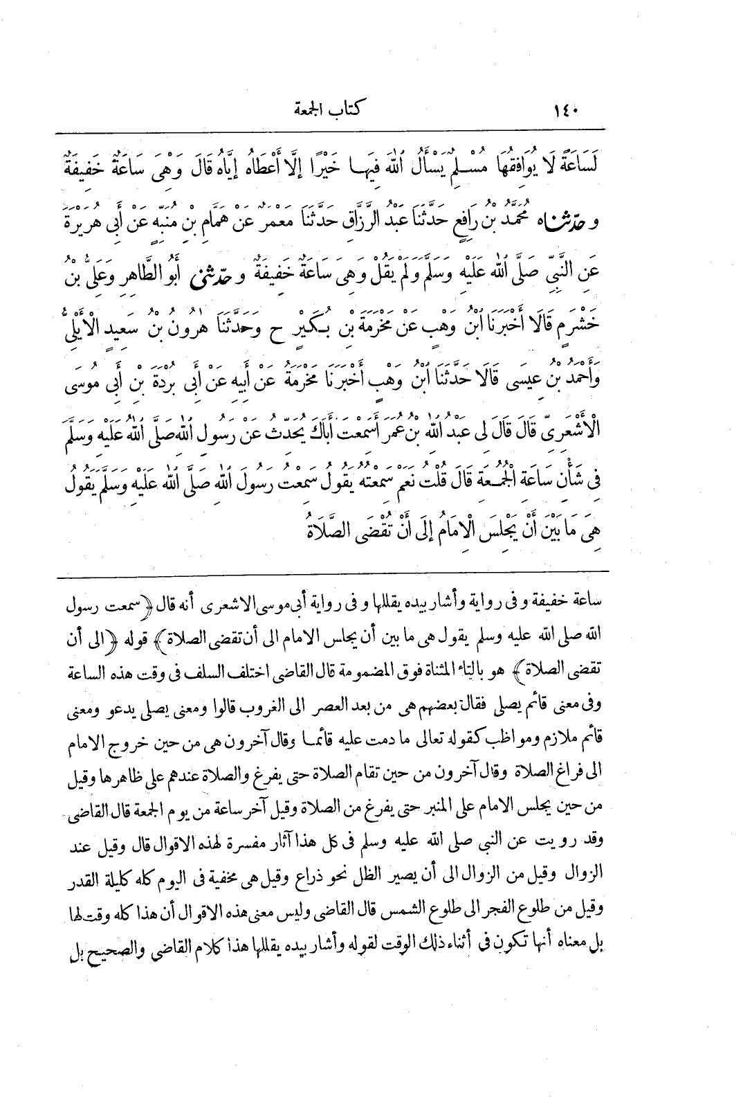سَاعَةٌ خَفِيفَةٌ وَفِي رِوَايَةٍ وَأَشَارَ بِيَدِهِ يُقَلِّلُهَا وَفِي رِوَايَةِ أَبِي مُوسَى الْأَشْعَرِيِّ أَنَّهُ قَالَ سَمِعْتُ رَسُولَ اللَّهِ صَلَّى اللَّهُ عَلَيْهِ وَسَلَّمَ يَقُولُ هِيَ مَا بَيْنَ أَنْ يَجْلِسَ الْإِمَامُ إِلَى أَنْ تُقْضَى الصَّلَاةُ قَوْلُهُ إِلَى أَنْ تُقْضَى الصَّلَاةُ هُوَ بِالتَّاءِ الْمُثَنَّاةِ فَوْقُ الْمَضْمُومَةِ قَالَ الْقَاضِي اخْتَلَفَ السَّلَفُ فِي وَقْتِ هَذِهِ السَّاعَةِ وَفِي مَعْنَى قَائِمٌ يُصَلِّي فَقَالَ بَعْضُهُمْ هِيَ مِنْ بَعْدِ الْعَصْرِ إِلَى الْغُرُوبِ قَالُوا وَمَعْنَى يُصَلِّي يَدْعُو وَمَعْنَى قَائِمٌ مُلَازِمٌ وَمُوَاظِبٌ كَقَوْلِهِ تَعَالَى مَا دُمْتَ عَلَيْهِ قَائِمًا وَقَالَ آخَرُونَ هِيَ مِنْ حِينِ خُرُوجِ الْإِمَامِ إِلَى فَرَاغِ الصَّلَاةِ وَقَالَ آخَرُونَ مِنْ حِينَ تُقَامُ الصَّلَاةُ حَتَّى يَفْرُغَ وَالصَّلَاةُ عِنْدَهُمْ عَلَى ظَاهِرِهَا وَقِيلَ مِنْ حِينَ يَجْلِسُ الْإِمَامُ عَلَى الْمِنْبَرِ حَتَّى يَفْرُغَ مِنَ الصَّلَاةِ وَقِيلَ آخِرَ سَاعَةٍ مِنْ يَوْمِ الْجُمُعَةِ قَالَ الْقَاضِي وَقَدْ رُوِيَتْ عَنِ النَّبِيِّ صَلَّى اللَّهُ عَلَيْهِ وَسَلَّمَ فِي كُلِّ هَذَا آثَارٌ مُفَسِّرَةٌ لِهَذِهِ الْأَقْوَالِ قَالَ وَقِيلَ عِنْدَ الزَّوَالِ وَقِيلَ مِنَ الزَّوَالِ إِلَى أَنْ يَصِيرَ الظِّلُّ نَحْوَ ذِرَاعٍ وَقِيلَ هِيَ مَخْفِيَّةٌ فِي الْيَوْمِ كُلِّهِ كَلَيْلَةِ الْقَدْرِ وَقِيلَ مِنْ طُلُوعِ الْفَجْرِ إِلَى طُلُوعِ الشَّمْسِ قَالَ الْقَاضِي وَلَيْسَ مَعْنَى هَذِهِ الْأَقْوَالِ أَنَّ هَذَا كُلَّهُ وَقْتٌ لَهَا بَلْ مَعْنَاهُ أَنَّهَا تَكُونُ فِي أَثْنَاءِ ذَلِكَ الْوَقْتِ لِقَوْلِهِ وَأَشَارَ بِيَدِهِ يُقَلِّلُهَا هَذَا كَلَامُ الْقَاضِي وَالصَّحِيحُ بَلِ