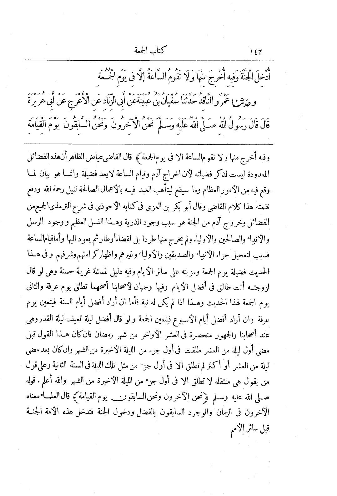 وَفِيهِ أُخْرِجَ مِنْهَا وَلَا تَقُومُ السَّاعَةُ إِلَّا فِي يَوْمِ الْجُمُعَةِ قَالَ الْقَاضِي عِيَاضٌ الظَّاهِرُ أَنَّ هَذِهِ الْفَضَائِلَ الْمَعْدُودَةَ لَيْسَتْ لِذِكْرِ فَضِيلَتِهِ لِأَنَّ إِخْرَاجَ آدَمَ وَقِيَامَ السَّاعَةِ لَا يُعَدُّ فَضِيلَةً وَإِنَّمَا هُوَ بَيَانٌ لِمَا وَقَعَ فِيهِ مِنَ الْأُمُورِ الْعِظَامِ وَمَا سَيَقَعُ لِيَتَأَهَّبَ الْعَبْدُ فِيهِ بِالْأَعْمَالِ الصَّالِحَةِ لِنَيْلِ رَحْمَةِ اللَّهِ وَدَفْعِ نِقْمَتِهِ هَذَا كَلَامُ الْقَاضِي وَقَالَ أَبُو بَكْرِ بن العزى فِي كِتَابِهِ الْأَحْوَذِيِّ فِي شَرْحِ التِّرْمِذِيِّ الْجَمِيعُ مِنَ الْفَضَائِلِ وَخُرُوجُ آدَمَ مِنَ الْجَنَّةِ هُوَ سَبَبُ وُجُودِ الذُّرِّيَّةِ وَهَذَا النَّسْلِ الْعَظِيمِ وَوُجُودِ الرُّسُلِ وَالْأَنْبِيَاءِ وَالصَّالِحِينَ وَالْأَوْلِيَاءِ وَلَمْ يَخْرُجْ مِنْهَا طَرْدًا بَلْ لِقَضَاءِ أَوْطَارٍ ثُمَّ يَعُودُ إِلَيْهَا وَأَمَّا قِيَامُ السَّاعَةِ فَسَبَبٌ لِتَعْجِيلِ جَزَاءِ الْأَنْبِيَاءِ وَالصِّدِّيقِينَ وَالْأَوْلِيَاءِ وَغَيْرِهِمْ وَإِظْهَارِ كَرَامَتِهِمْ وَشَرَفِهِمْ وَفِي هَذَا الْحَدِيثِ فَضِيلَةُ يَوْمِ الْجُمُعَةِ وَمَزِيَّتُهُ عَلَى سائر الأيام وفيه دليل لمسئلة غَرِيبَةٍ حَسَنَةٍ وَهِيَ لَوْ قَالَ لِزَوْجَتِهِ أَنْتَ طَالِقٌ فِي أَفْضَلِ الْأَيَّامِ وَفِيهَا وَجْهَانِ لِأَصْحَابِنَا أَصَحُّهُمَا تَطْلُقُ يَوْمَ عَرَفَةَ وَالثَّانِي يَوْمَ الْجُمُعَةِ لِهَذَا الْحَدِيثِ وَهَذَا إِذَا لَمْ يَكُنْ لَهُ نِيَّةٌ فَأَمَّا إِنْ أَرَادَ أَفْضَلَ أَيَّامِ السَّنَةِ فَيَتَعَيَّنُ يَوْمُ عَرَفَةَ وَإِنْ أَرَادَ أَفْضَلَ أَيَّامِ الْأُسْبُوعِ فَيَتَعَيَّنُ الْجُمُعَةُ وَلَوْ قَالَ أَفْضَلُ لَيْلَةٍ تَعَيَّنَتْ لَيْلَةُ الْقَدْرِ وَهِيَ عِنْدَ أَصْحَابِنَا وَالْجُمْهُورِ مُنْحَصِرَةٌ فِي الْعَشْرِ الْأَوَاخِرِ مِنْ شَهْرِ رَمَضَانَ فَإِنْ كَانَ هَذَا الْقَوْلُ قَبْلَ مُضِيِّ أَوَّلِ ليلة من العشر طلقت فِي أَوَّلِ جُزْءٍ مِنَ اللَّيْلَةِ الْأَخِيرَةِ مِنَ الشَّهْرِ وَإِنْ كَانَ بَعْدَ مُضِيِّ لَيْلَةٍ مِنَ الْعَشْرِ أَوْ أكْثَرَ لَمْ تَطْلُقْ إِلَّا فِي أَوَّلِ جُزْءٍ مِنْ مِثْلِ تِلْكَ اللَّيْلَةِ فِي السَّنَةِ الثَّانِيَةِ وَعَلَى قَوْلِ مَنْ يَقُولُ هِيَ مُنْتَقِلَةٌ لَا تَطْلُقُ إِلَّا فِي أَوَّلِ جُزْءٍ مِنَ اللَّيْلَةِ الْأَخِيرَةِ مِنَ الشَّهْرِ وَاللَّهُ أَعْلَمُ