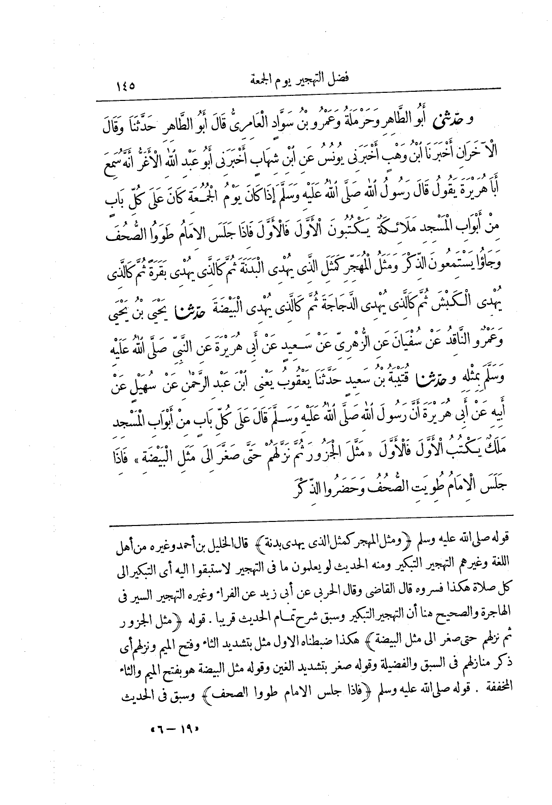 وَكَذَا نَقَلَهُ الْقَاضِي عِيَاضٌ عَنِ الْجُمْهُورِ وَوَقَعَ فِي بَعْضِ الْأُصُولِ الْمُعْتَمَدَةِ بِبِلَادِنَا انْتَصَتَ وَكَذَا نَقَلَهُ الْقَاضِي عَنِ الْبَاجِيِّ وَآخَرُونَ انْتَصَتَ بِزِيَادَةِ تَاءٍ مُثَنَّاةٍ فَوْقُ قَالَ وَهُوَ وَهْمٌ قُلْتُ لَيْسَ هُوَ وَهْمًا بَلْ هِيَ لُغَةٌ صَحِيحَةٌ قَالَ الْأَزْهَرِيُّ فِي شَرْحِ أَلْفَاظِ الْمُخْتَصَرِ يُقَالُ أنصت ونصت وانتصت ثلاث لغات وقوله ص فَاسْتَمَعَ وَأَنْصَتَ هُمَا شَيْئَانِ مُتَمَايِزَانِ وَقَدْ يَجْتَمِعَانِ فَالِاسْتِمَاعُ الْإِصْغَاءُ وَالْإِنْصَاتُ السُّكُوتُ وَلِهَذَا قَالَ اللَّهُ تَعَالَى وَإِذَا قُرِئَ الْقُرْآنُ فَاسْتَمِعُوا لَهُ وَأَنْصِتُوا وَقَوْلُهُ حَتَّى يَفْرُغَ مِنْ خُطْبَتِهِ هَكَذَا هُوَ فِي الْأُصُولِ مِنْ غَيْرِ ذِكْرِ الْإِمَامِ وَعَادَ الضمير إليه للعلم به وَإِنْ لَمْ يَكُنْ مَذْكُورًا وَقَوْلُهُ صَلَّى اللَّهُ عَلَيْهِ وَسَلَّمَ وَفَضْلَ ثَلَاثَةِ أَيَّامٍ وَزِيَادَةَ ثَلَاثَةِ أَيَّامٍ هُوَ بِنَصْبِ فَضْلَ وَزِيَادَةَ عَلَى الظَّرْفِ قَالَ الْعُلَمَاءُ مَعْنَى الْمَغْفِرَةِ لَهُ مَا بَيْنَ الْجُمُعَتَيْنِ وَثَلَاثَةِ أَيَّامٍ أَنَّ الْحَسَنَةَ بِعَشْرِ أَمْثَالِهَا وَصَارَ يَوْمُ الْجُمُعَةِ الَّذِي فَعَلَ فِيهِ هَذِهِ الْأَفْعَالَ الْجَمِيلَةَ فِي مَعْنَى الْحَسَنَةِ الَّتِي تُجْعَلُ بِعَشْرِ أَمْثَالِهَا قَالَ بَعْضُ أَصْحَابِنَا وَالْمُرَادُ بِمَا بَيْنَ الْجُمُعَتَيْنِ مِنْ صَلَاةِ الْجُمُعَةِ وَخُطْبَتِهَا إِلَى مِثْلِ الْوَقْتِ مِنَ الْجُمُعَةِ الثَّانِيَةِ حَتَّى تَكُونَ سَبْعَةَ أَيَّامٍ بِلَا زِيَادَةٍ وَلَا نُقْصَانٍ وَيُضَمُّ إِلَيْهَا ثَلَاثَةٌ فَتَصِيرُ عَشَرَةً قَوْلُهُ صَلَّى اللَّهُ عليه وسلم ومن مس الحصا لغا فيه النهى عن مس الحصا وَغَيْرِهِ مِنْ أَنْوَاعِ الْعَبَثِ فِي حَالَةِ الْخُطْبَةِ وَفِيهِ إِشَارَةٌ إِلَى إِقْبَالِ الْقَلْبِ وَالْجَوَارِحِ عَلَى الْخُطْبَةِ وَالْمُرَادُ بِاللَّغْوِ هُنَا الْبَاطِلُ الْمَذْمُومُ الْمَرْدُودُ وقد سبق بيانه قريبا