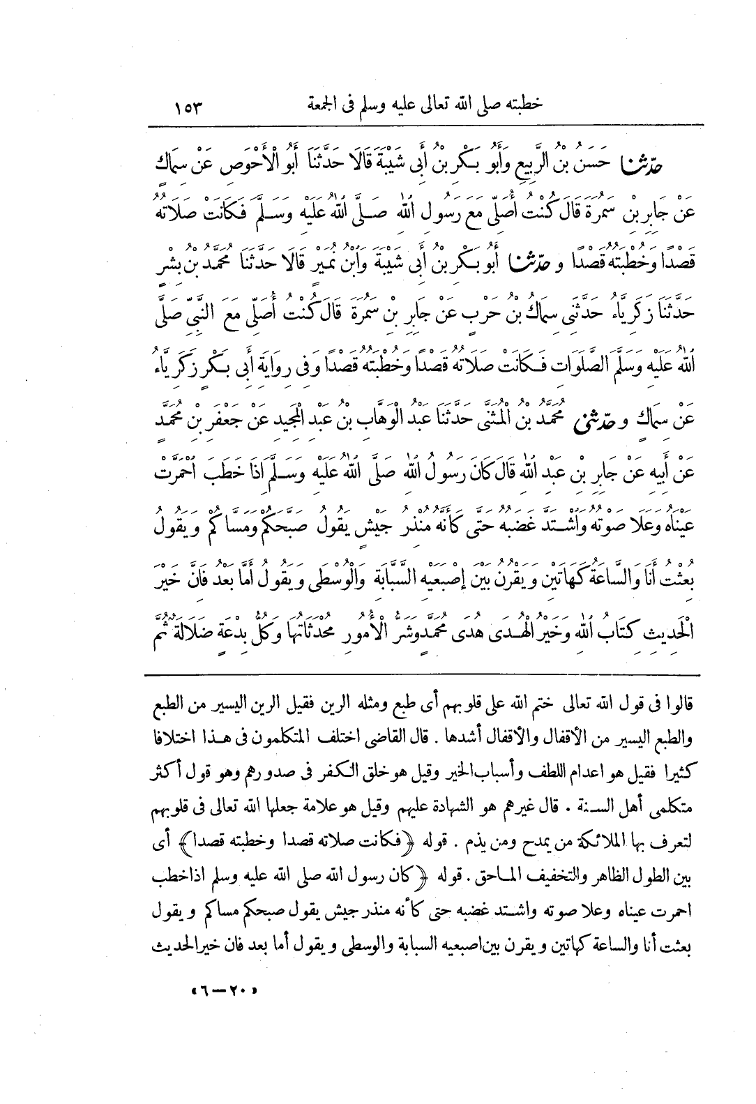 [867] قَوْلُهُ كَانَ رَسُولُ اللَّهِ صَلَّى اللَّهُ عَلَيْهِ وسلم إذا خَطَبَ احْمَرَّتْ عَيْنَاهُ وَعَلَا صَوْتُهُ وَاشْتَدَّ غَضَبُهُ حتى كأنه منذر جيش يقول صبحكم مساكم وَيَقُولُ بُعِثْتُ أَنَا وَالسَّاعَةُ كَهَاتَيْنِ وَيَقْرُنُ بَيْنَ إِصْبَعَيْهِ السَّبَّابَةِ وَالْوُسْطَى وَيَقُولُ أَمَّا بَعْدُ فَإِنَّ خير الحديث