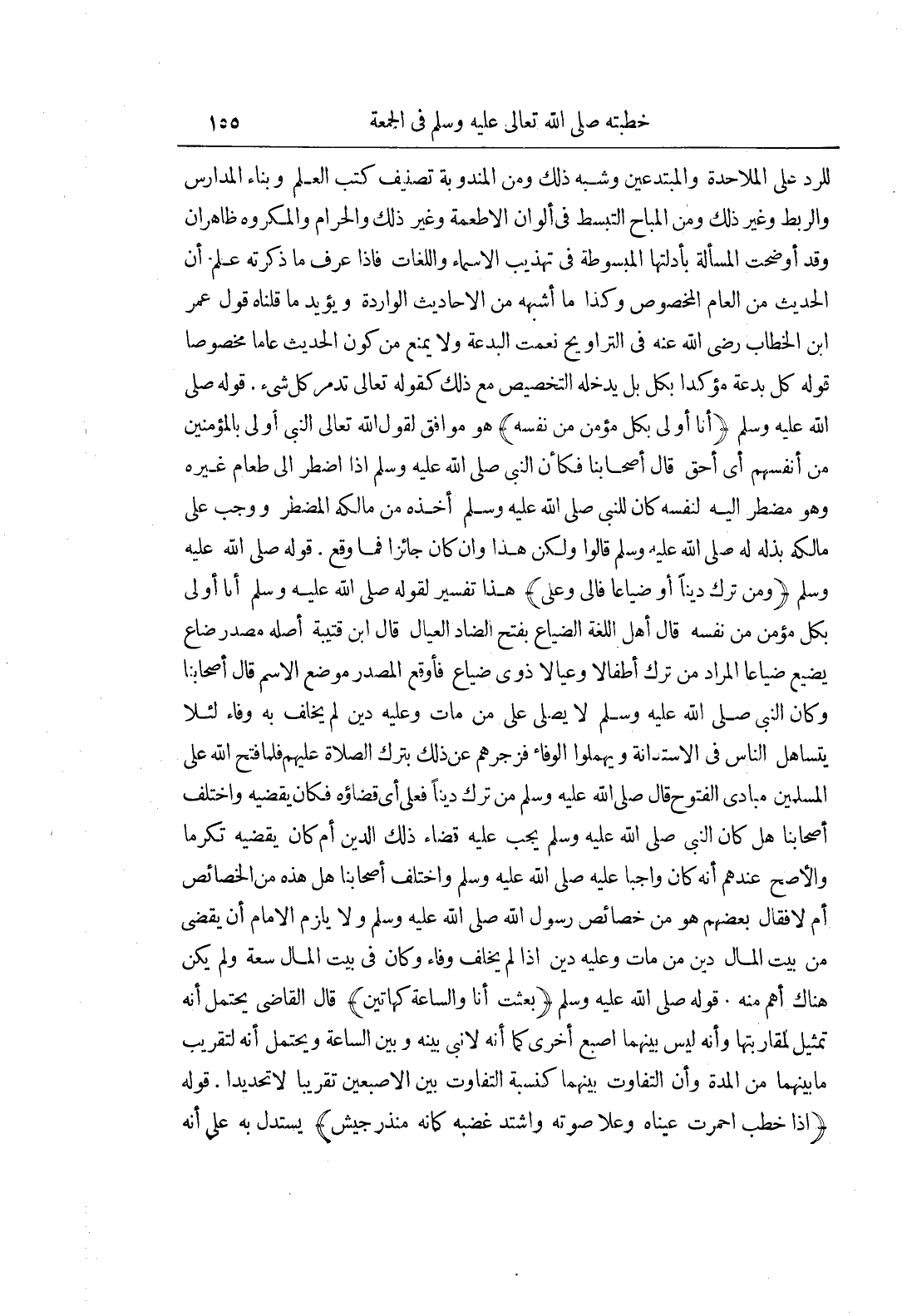 لِلرَّدِّ عَلَى الْمَلَاحِدَةِ وَالْمُبْتَدِعِينَ وَشِبْهُ ذَلِكَ وَمِنَ الْمَنْدُوبَةِ تَصْنِيفُ كُتُبِ الْعِلْمِ وَبِنَاءُ الْمَدَارِسِ وَالرُّبُطِ وَغَيْرُ ذَلِكَ وَمِنَ الْمُبَاحِ التَّبَسُّطُ فِي أَلْوَانِ الْأَطْعِمَةِ وَغَيْرُ ذَلِكَ وَالْحَرَامُ وَالْمَكْرُوهُ ظَاهِرَانِ وَقَدْ أَوْضَحْتُ الْمَسْأَلَةَ بِأَدِلَّتِهَا الْمَبْسُوطَةِ فِي تَهْذِيبِ الْأَسْمَاءِ وَاللُّغَاتِ فَإِذَا عُرِفَ مَا ذَكَرْتُهُ عُلِمَ أَنَّ الْحَدِيثَ مِنَ الْعَامِّ الْمَخْصُوصِ وَكَذَا مَا أَشْبَهَهُ مِنَ الْأَحَادِيثِ الْوَارِدَةِ وَيُؤَيِّدُ مَا قُلْنَاهُ قَوْلُ عمر بن الخطاب رضي الله عنه في التَّرَاوِيحِ نِعْمَتِ الْبِدْعَةُ وَلَا يَمْنَعُ مِنْ كَوْنِ الْحَدِيثِ عَامًّا مَخْصُوصًا قَوْلُهُ كُلُّ بِدْعَةٍ مُؤَكَّدًا بِكُلِّ بَلْ يَدْخُلُهُ التَّخْصِيصُ مَعَ ذَلِكَ كَقَوْلِهِ تَعَالَى تُدَمِّرُ كُلَّ شَيْءٍ قَوْلُهُ صَلَّى اللَّهُ عَلَيْهِ وَسَلَّمَ أَنَا أَوْلَى بِكُلِّ مُؤْمِنٍ مِنْ نَفْسِهِ هُوَ مُوَافِقٌ لِقَوْلِ اللَّهِ تَعَالَى النَّبِيُّ أولى بالمؤمنين من أنفسهم أَيْ أَحَقُّ قَالَ أَصْحَابُنَا فَكَأَنَّ النَّبِيَّ صَلَّى اللَّهُ عَلَيْهِ وَسَلَّمَ إِذَا اضْطُرَّ إِلَى طَعَامِ غَيْرِهِ وَهُوَ مُضْطَرٌّ إِلَيْهِ لِنَفْسِهِ كَانَ لِلنَّبِيِّ صَلَّى اللَّهُ عَلَيْهِ وَسَلَّمَ أَخْذُهُ مِنْ مَالِكِهِ الْمُضْطَرِّ وَوَجَبَ عَلَى مَالِكِهِ بَذْلُهُ لَهُ صَلَّى اللَّهُ عَلَيْهِ وَسَلَّمَ قَالُوا وَلَكِنَّ هَذَا وَإِنْ كَانَ جَائِزًا فَمَا وَقَعَ قَوْلُهُ صَلَّى اللَّهُ عَلَيْهِ وَسَلَّمَ وَمَنْ تَرَكَ دَيْنًا أَوْ ضَيَاعًا فَإِلَيَّ وَعَلَيَّ هَذَا تَفْسِيرٌ لِقَوْلِهِ صَلَّى اللَّهُ عَلَيْهِ وَسَلَّمَ أَنَا أَوْلَى بِكُلِّ مُؤْمِنٍ مِنْ نَفْسِهِ قَالَ أَهْلُ اللُّغَةِ الضَّيَاعُ بِفَتْحِ الضَّادِ العيال قال بن قُتَيْبَةَ أَصْلُهُ مَصْدَرُ ضَاعَ يَضِيعُ ضَيَاعًا الْمُرَادُ مَنْ تَرَكَ أَطْفَالًا وَعِيَالًا ذَوِي ضَيَاعٍ فَأَوْقَعَ الْمَصْدَرَ مَوْضِعَ الِاسْمِ قَالَ أَصْحَابُنَا وَكَانَ النَّبِيُّ صَلَّى اللَّهُ عَلَيْهِ وَسَلَّمَ لَا يُصَلِّي عَلَى مَنْ مَاتَ وَعَلَيْهِ دَيْنٌ لَمْ يُخَلِّفْ بِهِ وَفَاءً لِئَلَّا يَتَسَاهَلَ النَّاسُ فِي الِاسْتِدَانَةِ وَيُهْمِلُوا الوفاء فزجرهم عن ذَلِكَ بِتَرْكِ الصَّلَاةِ عَلَيْهِمْ فَلَمَّا فَتَحَ اللَّهُ عَلَى الْمُسْلِمِينَ مَبَادِي الْفُتُوحِ قَالَ صَلَّى اللَّهُ عَلَيْهِ وَسَلَّمَ مَنْ تَرَكَ دَيْنًا فَعَلَيَّ أَيْ قَضَاؤُهُ فَكَانَ يَقْضِيهِ وَاخْتَلَفَ أَصْحَابُنَا هَلْ كَانَ النَّبِيُّ صَلَّى اللَّهُ عَلَيْهِ وَسَلَّمَ يَجِبُ عَلَيْهِ قَضَاءُ ذَلِكَ الدَّيْنِ أَمْ كَانَ يَقْضِيهِ تَكَرُّمًا وَالْأَصَحُّ عِنْدهُمْ أَنَّهُ كَانَ وَاجِبًا عَلَيْهِ صَلَّى اللَّهُ عَلَيْهِ وَسَلَّمَ وَاخْتَلَفَ أَصْحَابُنَا هَلْ هَذِهِ مِنَ الْخَصَائِصِ أَمْ لَا فَقَالَ بَعْضُهُمْ هُوَ مِنْ خَصَائِصِ رَسُولِ اللَّهِ صَلَّى اللَّهُ عَلَيْهِ وَسَلَّمَ وَلَا يَلْزَمُ الْإِمَامَ أَنْ يَقْضِيَ مِنْ بَيْتِ الْمَالِ دَيْنَ مَنْ مَاتَ وَعَلَيْهِ دَيْنٌ إِذَا لَمْ يُخَلِّفْ وَفَاءً وَكَانَ فِي بَيْتِ الْمَالِ سَعَةٌ وَلَمْ يَكُنْ هُنَاكَ أَهَمَّ مِنْهُ قَوْلُهُ صَلَّى اللَّهُ عَلَيْهِ وَسَلَّمَ بُعِثْتُ أَنَا وَالسَّاعَةُ كَهَاتَيْنِ قَالَ الْقَاضِي يَحْتَمِلُ أَنَّهُ تَمْثِيلٌ لِمُقَارَبَتِهَا وَأَنَّهُ لَيْسَ بَيْنَهُمَا إِصْبَعٌ أُخْرَى كَمَا أَنَّهُ لَا نَبِيَّ بَيْنَهُ وَبَيْنَ السَّاعَةِ وَيَحْتَمِلُ أَنَّهُ لِتَقْرِيبِ مَا بَيْنَهُمَا مِنَ الْمُدَّةِ وَأَنَّ التَّفَاوُتَ بَيْنَهُمَا كَنِسْبَةِ التَّفَاوُتِ بَيْنَ الْإِصْبَعَ