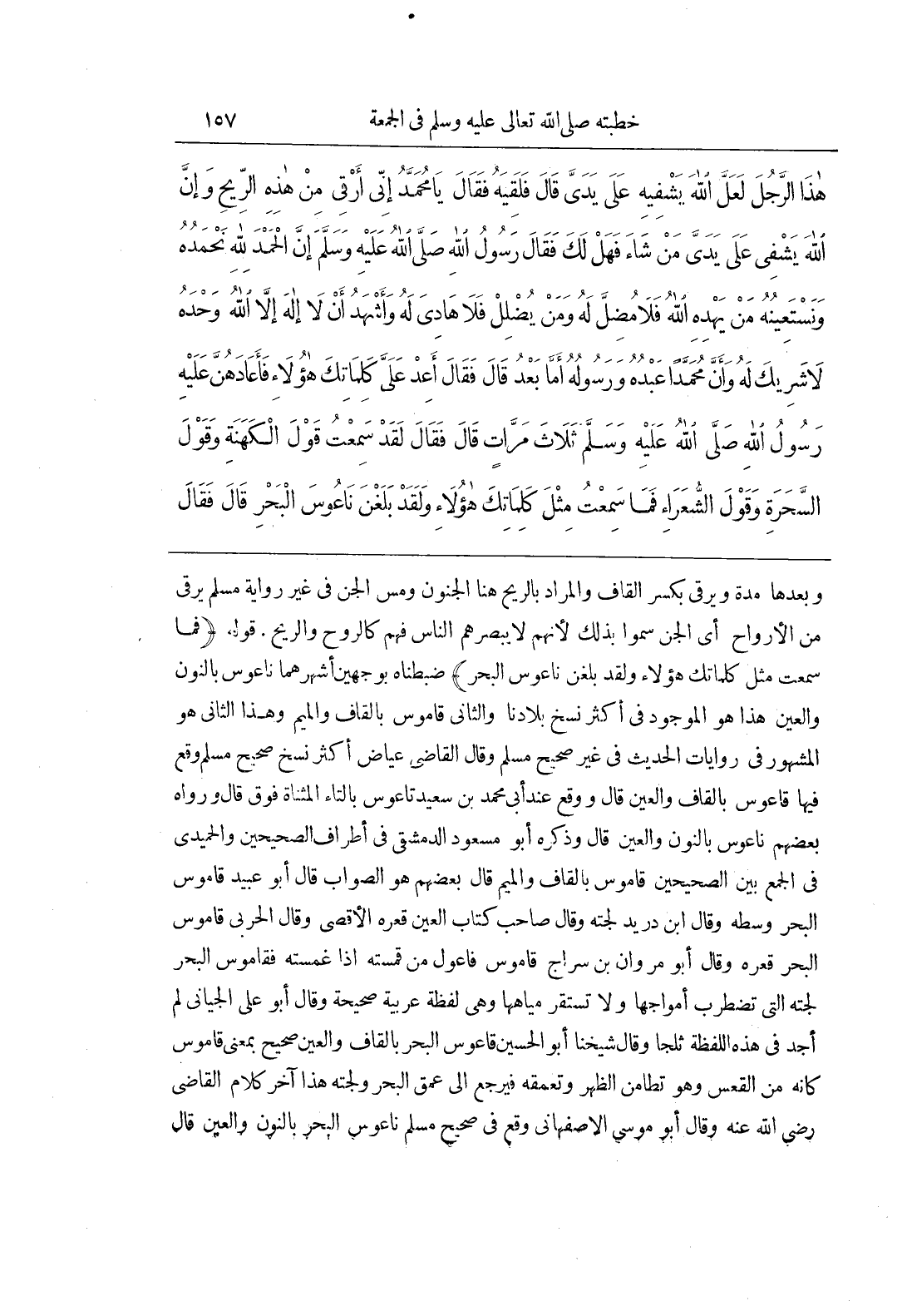 وَبَعْدَهَا مَدَّةٌ وَيَرْقِي بِكَسْرِ الْقَافِ وَالْمُرَادُ بِالرِّيحِ هُنَا الْجُنُونُ وَمَسُّ الْجِنِّ فِي غَيْرِ رِوَايَةِ مُسْلِمٍ يَرْقِي مِنَ الْأَرْوَاحِ أَيِ الْجِنِّ سُمُّوا بِذَلِكَ لِأَنَّهُمْ لَا يُبْصِرُهُمُ النَّاسُ فَهُمْ كَالرُّوحِ وَالرِّيحِ قَوْلُهُ فَمَا سَمِعْتُ مِثْلَ كَلِمَاتِكَ هَؤُلَاءِ وَلَقَدْ بَلَغْنَ نَاعُوسَ الْبَحْرِ ضَبَطْنَاهُ بِوَجْهَيْنِ أَشْهَرُهُمَا نَاعُوسُ بِالنُّونِ وَالْعَيْنِ هَذَا هُوَ الْمَوْجُودُ فِي أَكْثَرِ نُسَخِ بِلَادِنَا وَالثَّانِي قَامُوسُ بِالْقَافِ وَالْمِيمِ وَهَذَا الثَّانِي هُوَ الْمَشْهُورُ فِي رِوَايَاتِ الْحَدِيثِ فِي غَيْرِ صَحِيحِ مُسْلِمٍ وَقَالَ الْقَاضِي عِيَاضٌ أَكْثَرُ نُسَخِ صَحِيحِ مُسْلِمٍ وَقَعَ فِيهَا قَاعُوسُ بِالْقَافِ وَالْعَيْنِ قَالَ وَوَقَعَ عِنْدَ أَبِي مُحَمَّدِ بْنِ سَعِيدٍ تَاعُوسُ بِالتَّاءِ الْمُثَنَّاةِ فَوْقُ قَالَ وَرَوَاهُ بَعْضُهُمْ نَاعُوسُ بِالنُّونِ وَالْعَيْنِ قَالَ وَذَكَرَهُ أَبُو مَسْعُودٍ الدِّمَشْقِيُّ فِي أَطْرَافِ الصَّحِيحَيْنِ وَالْحُمَيْدِيُّ فِي الْجَمْعِ بَيْنَ الصَّحِيحَيْنِ قَامُوسُ بِالْقَافِ وَالْمِيمِ قَالَ بَعْضُهُمْ هُوَ الصَّوَابُ قَالَ أَبُو عُبَيْدٍ قاموس البحر وسطه وقال بن دُرَيْدٍ لُجَّتُهُ وَقَالَ صَاحِبُ كِتَابِ الْعَيْنِ قَعْرُهُ الْأَقْصَى وَقَالَ الْحَرْبِيُّ قَامُوسُ الْبَحْرِ قَعْرُهُ وَقَالَ أَبُو مَرْوَانَ بْنُ سَرَّاجٍ قَامُوسٌ فَاعُولٌ مِنْ قَمَسْتُهُ إِذَا غَمَسْتُهُ فَقَامُوسُ الْبَحْرِ لُجَّتُهُ الَّتِي تَضْطَرِبُ أَمْوَاجُهَا وَلَا تَسْتَقِرُّ مِيَاهُهَا وَهِيَ لَفْظَةٌ عَرَبِيَّةٌ صَحِيحَةٌ وَقَالَ أَبُو عَلِيٍّ الْجَيَّانِيُّ لَمْ أَجِدْ فِي هَذِهِ اللَّفْظَةِ ثَلْجًا وَقَالَ شَيْخُنَا أَبُو الْحُسَيْنِ قَاعُوسُ الْبَحْرِ بِالْقَافِ وَالْعَيْنِ صَحِيحٌ بِمَعْنَى قَامُوسٍ كَأَنَّهُ مِنَ الْقَعْسِ وَهُوَ تَطَامُنُ الظَّهْرِ وَتَعَمُّقُهُ فَيَرْجِعُ إِلَى عُمْقِ الْبَحْرِ وَلُجَّتِهِ هَذَا آخِرُ كَلَامِ الْقَاضِي رَضِيَ اللَّهُ عَنْهُ وَقَالَ أَبُو مُوسَى الْأَصْفَهَانِيُّ وَقَعَ فِي صَحِيحِ مُسْلِمٍ نَاعُوسُ الْبَحْرِ بِالنُّونِ وَالْعَيْنِ قَالَ