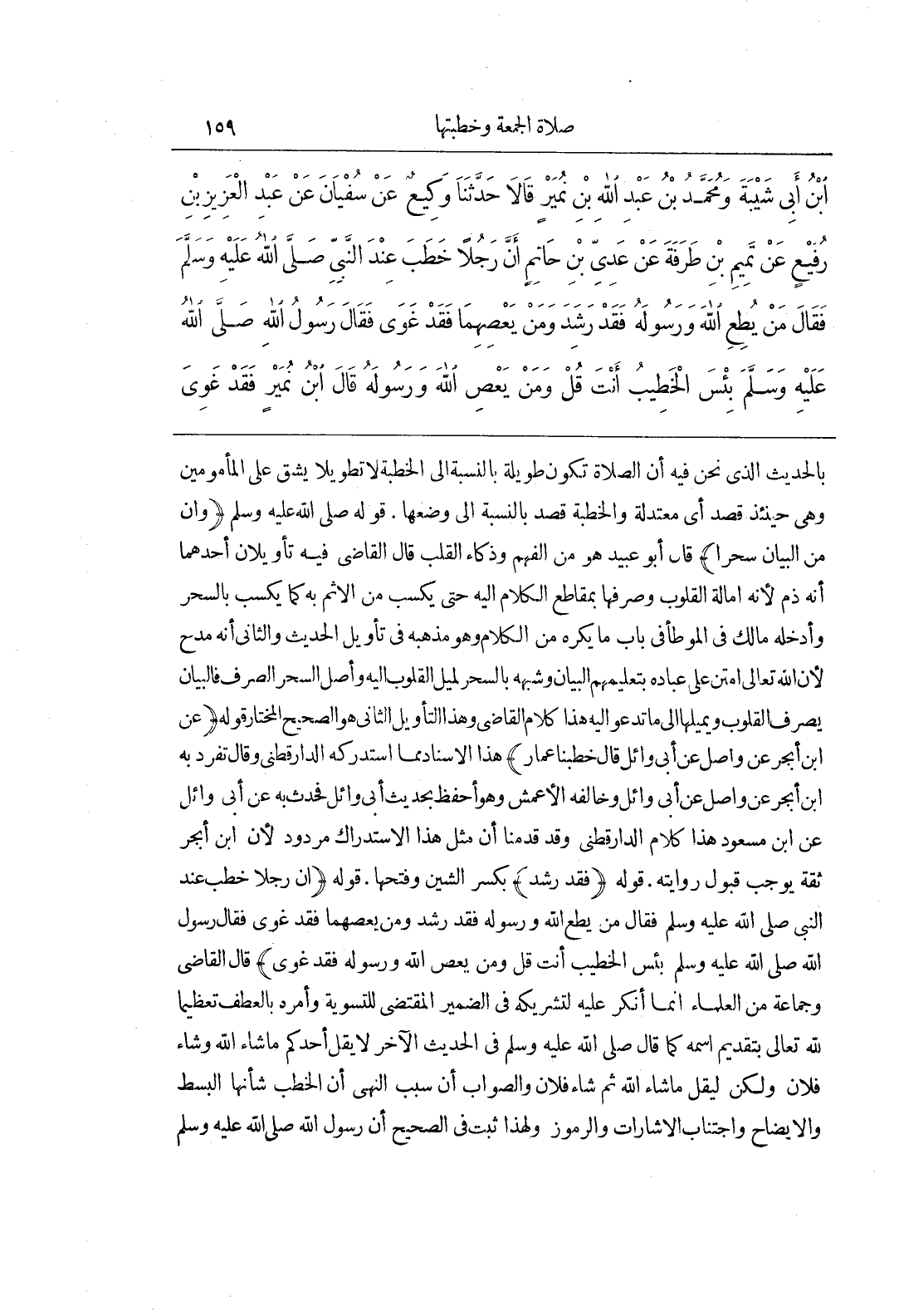 بِالْحَدِيثِ الَّذِي نَحْنُ فِيهِ أَنَّ الصَّلَاةَ تَكُونُ طَوِيلَةً بِالنِّسْبَةِ إِلَى الْخُطْبَةِ لَا تَطْوِيلًا يَشُقُّ عَلَى الْمَأْمُومِينَ وَهِيَ حِينَئِذٍ قَصْدٌ أَيْ مُعْتَدِلَةٌ وَالْخُطْبَةُ قَصْدٌ بِالنِّسْبَةِ إِلَى وَضْعِهَا قَوْلُهُ صَلَّى اللَّهُ عَلَيْهِ وَسَلَّمَ وَإِنَّ مِنَ الْبَيَانِ سِحْرًا قَالَ أَبُو عُبَيْدٍ هُوَ مِنَ الْفَهْمِ وَذَكَاءِ الْقَلْبِ قَالَ الْقَاضِي فِيهِ تَأْوِيلَانِ أَحَدُهُمَا أَنَّهُ ذَمٌّ لِأَنَّهُ إِمَالَةُ الْقُلُوبِ وَصَرْفُهَا بِمَقَاطِعِ الْكَلَامِ إِلَيْهِ حَتَّى يَكْسِبَ مِنَ الْإِثْمِ بِهِ كَمَا يَكْسِبُ بِالسِّحْرِ وَأَدْخَلَهُ مَالِكٌ فِي الْمُوَطَّأِ فِي بَابِ مَا يُكْرَهُ مِنَ الْكَلَامِ وَهُوَ مَذْهَبُهُ فِي تَأْوِيلِ الْحَدِيثِ وَالثَّانِي أَنَّهُ مَدْحٌ لِأَنَّ اللَّهَ تَعَالَى امْتَنَّ عَلَى عِبَادِهِ بِتَعْلِيمِهِمُ الْبَيَانَ وَشَبَّهَهُ بِالسِّحْرِ لِمَيْلِ الْقُلُوبِ إِلَيْهِ وَأَصْلُ السِّحْرِ الصَّرْفُ فَالْبَيَانُ يَصْرِفُ الْقُلُوبَ وَيَمِيلُهَا إِلَى مَا تَدْعُو إِلَيْهِ هَذَا كَلَامُ الْقَاضِي وَهَذَا التَّأْوِيلُ الثاني هو الصحيح المختار قوله عن بن أَبْجَرَ عَنْ وَاصِلٍ عَنْ أَبِي وَائِلٍ قَالَ خَطَبَنَا عَمَّارٌ هَذَا الْإِسْنَادُ مِمَّا اسْتَدْرَكَهُ الدَّارَقُطْنِيُّ وقال تفرد به بن أَبْجَرَ عَنْ وَاصِلٍ عَنْ أَبِي وَائِلٍ وَخَالَفَهُ الْأَعْمَشُ وَهُوَ أَحْفَظُ بِحَدِيثِ أَبِي وَائِلٍ فَحَدَّثَ به عن أبي وائل عن بن مَسْعُودٍ هَذَا كَلَامُ الدَّارَقُطْنِيِّ وَقَدْ قَدَّمْنَا أَنَّ مثل هذا الاستدراك مردود لأن بن أبجر ثقة يوجب قَبُولُ رِوَايَتِهِ