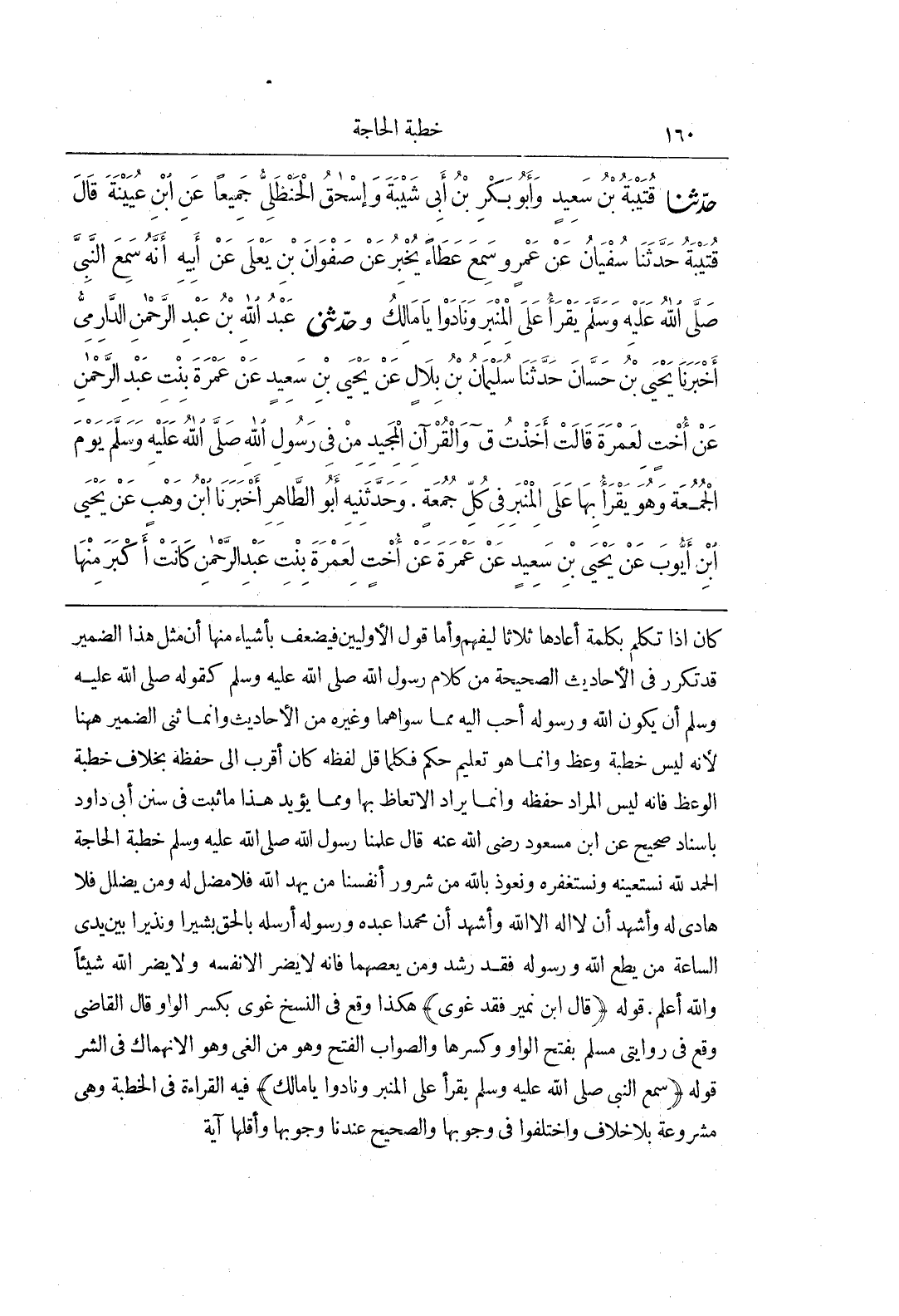 كَانَ إِذَا تَكَلَّمَ بِكَلِمَةٍ أَعَادَهَا ثَلَاثًا لِيُفْهَمَ وَأَمَّا قَوْلُ الْأُولَيَيْنِ فَيُضَعَّفُ بِأَشْيَاءَ مِنْهَا أَنَّ مِثْلَ هَذَا الضَّمِيرِ قَدْ تَكَرَّرَ فِي الْأَحَادِيثِ الصَّحِيحَةِ مِنْ كَلَامِ رَسُولِ اللَّهِ صَلَّى اللَّهُ عَلَيْهِ وَسَلَّمَ كَقَوْلِهِ صَلَّى اللَّهُ عَلَيْهِ وَسَلَّمَ أَنْ يَكُونَ اللَّهُ وَرَسُولُهُ أَحَبَّ إِلَيْهِ مِمَّا سِوَاهُمَا وَغَيْرِهِ مِنَ الْأَحَادِيثِ وَإِنَّمَا ثَنَّى الضَّمِيرَ ها هنا لِأَنَّهُ لَيْسَ خُطْبَةَ وَعْظٍ وَإِنَّمَا هُوَ تَعْلِيمُ حُكْمٍ فَكُلَّمَا قَلَّ لَفْظُهُ كَانَ أَقْرَبَ إِلَى حِفْظِهِ بِخِلَافِ خُطْبَةِ الْوَعْظِ فَإِنَّهُ لَيْسَ الْمُرَادُ حِفْظُهُ وَإِنَّمَا يُرَادُ الِاتِّعَاظُ بِهَا وَمِمَّا يُؤَيِّدُ هَذَا مَا ثَبَتَ فِي سُنَنِ أَبِي دَاوُدَ باسناد صحيح عن بن مَسْعُودٍ رَضِيَ اللَّهُ عَنْهُ قَالَ عَلَّمَنَا رَسُولُ اللَّهِ صَلَّى اللَّهُ عَلَيْهِ وَسَلَّمَ خُطْبَةَ الْحَاجَةِ الْحَمْدُ لِلَّهِ نَسْتَعِينُهُ وَنَسْتَغْفِرُهُ وَنَعُوذُ بِاللَّهِ مِنْ شُرُورِ أَنْفُسِنَا مَنْ يَهْدِ اللَّهُ فَلَا مُضِلَّ لَهُ وَمَنْ يُضْلِلْ فَلَا هَادِيَ لَهُ وَأَشْهَدُ أَنْ لَا إِلَهَ إِلَّا اللَّهُ وَأَشْهَدُ أَنَّ مُحَمَّدًا عَبْدُهُ وَرَسُولُهُ أَرْسَلَهُ بِالْحَقِّ بَشِيرًا وَنَذِيرًا بَيْنَ يَدَيِ السَّاعَةِ مَنْ يُطِعِ اللَّهَ وَرَسُولَهُ فَقَدْ رَشَدَ وَمَنْ يَعْصِهِمَا فَإِنَّهُ لَا يَضُرُّ إِلَّا نَفْسَهُ وَلَا يَضُرُّ اللَّهَ شَيْئًا وَاللَّهُ أعلم قوله قال بن نُمَيْرٍ فَقَدْ غَوِي هَكَذَا وَقَعَ فِي النُّسَخِ غَوِيَ بِكَسْرِ الْوَاوِ قَالَ الْقَاضِي وَقَعَ فِي رِوَايَتَيْ مُسْلِمٍ بِفَتْحِ الْوَاوِ وَكَسْرِهَا وَالصَّوَابُ الْفَتْحُ وَهُوَ مِنَ الْغَيِّ وَهُوَ الِانْهِمَاكُ فِي الشَّرِّ