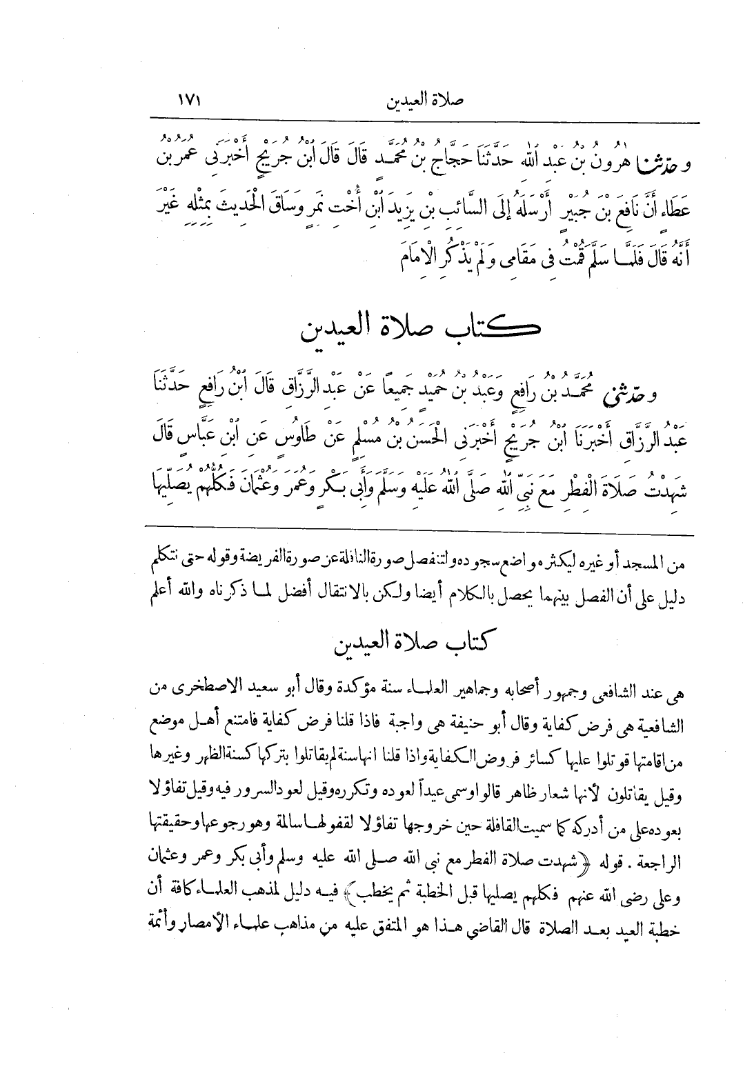 (كتاب صلاة العيدين هِيَ عِنْدَ الشَّافِعِيِّ وَجُمْهُورِ أَصْحَابِهِ وَجَمَاهِيرِ الْعُلَمَاءِ سُنَّةٌ مُؤَكَّدَةٌ وَقَالَ أَبُو سَعِيدٍ الْإِصْطَخْرِيُّ مِنَ الشَّافِعِيَّةِ هِيَ فَرْضُ كِفَايَةٍ وَقَالَ أَبُو حَنِيفَةَ هِيَ وَاجِبَةٌ فَإِذَا قُلْنَا فَرْضُ كِفَايَةٍ فَامْتَنَعَ أَهْلُ مَوْضِعٍ مِنْ إِقَامَتِهَا قُوتِلُوا عَلَيْهَا كَسَائِرِ فُرُوضِ الْكِفَايَةِ وَإِذَا قُلْنَا إِنَّهَا سُنَّةٌ لَمْ يُقَاتَلُوا بِتَرْكِهَا كَسُنَّةِ الظُّهْرِ وَغَيْرِهَا وَقِيلَ يُقَاتَلُونَ لِأَنَّهَا شِعَارٌ ظَاهِرٌ قَالُوا وَسُمِّيَ عِيدًا لِعَوْدِهِ وَتَكَرُّرِهِ وَقِيلَ لِعَوْدِ السُّرُورِ فِيهِ وَقِيلَ تَفَاؤُلًا بِعَوْدِهِ عَلَى مَنْ أَدْرَكَهُ كَمَا سُمِّيَتِ الْقَافِلَةُ حِينَ خُرُوجِهَا تَفَاؤُلًا لِقُفُولِهَا سَالِمَةً وَهُوَ رُجُوعُهَا وَحَقِيقَتُهَا الرَّاجِعَةُ
