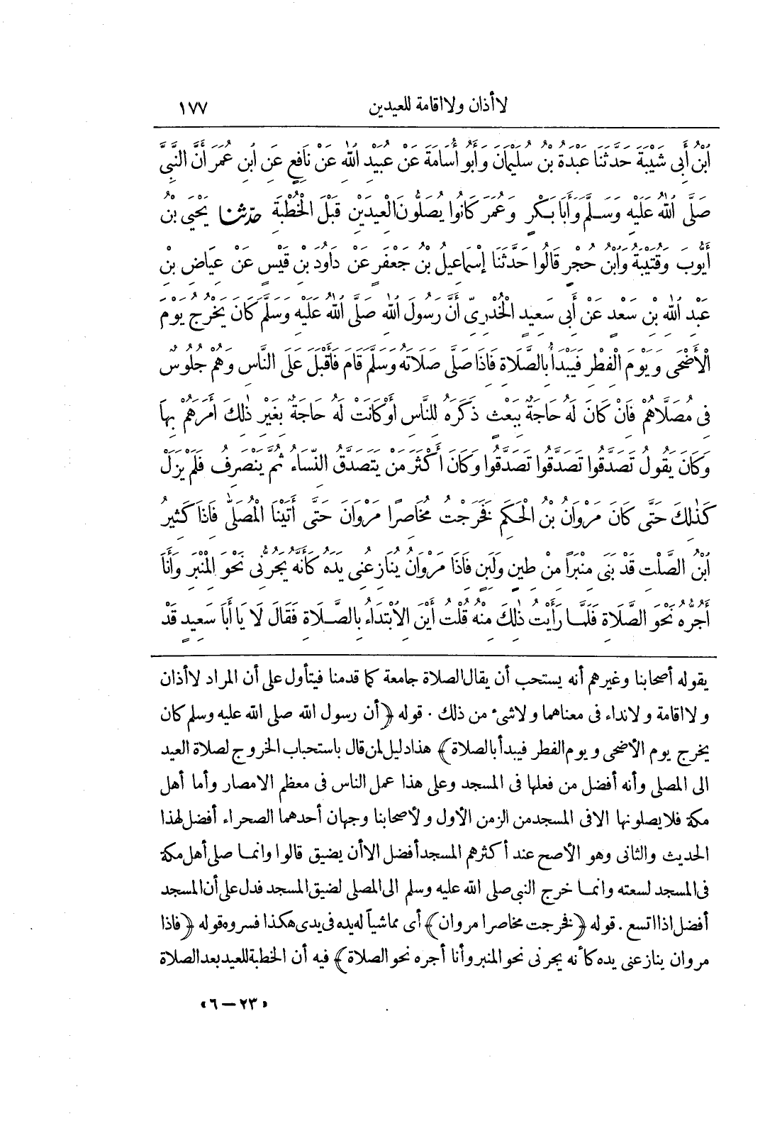 [889] قَوْلُهُ أَنَّ رَسُولَ اللَّهِ صَلَّى اللَّهُ عَلَيْهِ وسلم كَانَ يَخْرُجُ يَوْمَ الْأَضْحَى وَيَوْمَ الْفِطْرِ فَيَبْدَأُ بِالصَّلَاةِ هَذَا دَلِيلٌ لِمَنْ قَالَ بِاسْتِحْبَابِ الْخُرُوجِ لِصَلَاةِ الْعِيدِ إِلَى الْمُصَلَّى وَأَنَّهُ أَفْضَلُ مَنْ فَعَلَهَا فِي الْمَسْجِدِ وَعَلَى هَذَا عَمِلَ النَّاسُ فِي مُعْظَمِ الْأَمْصَارِ وَأَمَّا أَهْلُ مَكَّةَ فَلَا يُصَلُّونَهَا إِلَّا فِي الْمَسْجِدِ مِنَ الزَّمَنِ الْأَوَّلِ وَلِأَصْحَابِنَا وَجْهَانِ أَحَدُهُمَا الصَّحْرَاءُ أَفْضَلُ لِهَذَا الْحَدِيثِ وَالثَّانِي وَهُوَ الْأَصَحُّ عِنْدَ أَكْثَرِهِمُ الْمَسْجِدُ أَفْضَلُ إِلَّا أَنْ يَضِيقَ قَالُوا وَإِنَّمَا صَلَّى أَهْلُ مَكَّةَ فِي الْمَسْجِدِ لِسَعَتِهِ وَإِنَّمَا خَرَجَ النَّبِيُّ صَلَّى اللَّهُ عَلَيْهِ وَسَلَّمَ إِلَى الْمُصَلَّى لِضِيقِ الْمَسْجِدِ فَدَلَّ عَلَى أَنَّ الْمَسْجِدَ أَفْضَلُ إِذَا اتَّسَعَ قَوْلُهُ فَخَرَجْتُ مُخَاصِرًا مَرْوَانَ أَيْ مُمَاشِيًا لَهُ يَدُهُ فِي يَدَيَّ هَكَذَا فَسَّرُوهُ قَوْلُهُ فَإِذَا مَرْوَانُ يُنَازِعُنِي يَدَهُ كَأَنَّهُ يَجُرُّنِي نَحْوَ الْمِنْبَرِ وَأَنَا أَجُرُّهُ نَحْوَ الصَّلَاةِ فِيهِ أَنَّ الْخُطْبَةَ لِلْعِيدِ بَعْدَ الصَّلَاةِ