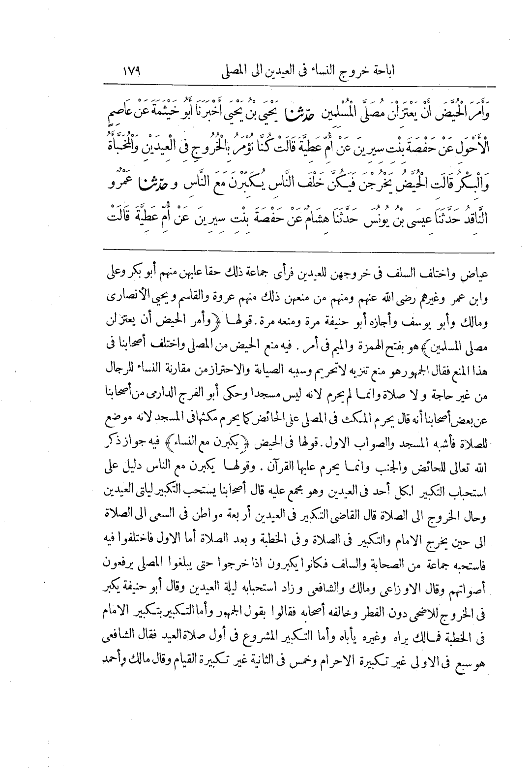 عِيَاضٌ وَاخْتَلَفَ السَّلَفُ فِي خُرُوجِهِنَّ لِلْعِيدَيْنِ فَرَأَى جَمَاعَةٌ ذَلِكَ حَقًّا عَلَيْهِنَّ مِنْهُمْ أَبُو بَكْرٍ وعلي وبن عُمَرَ وَغَيْرُهُمْ رَضِيَ اللَّهُ عَنْهُمْ وَمِنْهُمْ مَنْ مَنَعَهُنَّ ذَلِكَ مِنْهُمْ عُرْوَةُ وَالْقَاسِمُ وَيَحْيَى الْأَنْصَارِيُّ وَمَالِكٌ وَأَبُو يُوسُفَ وَأَجَازَهُ أَبُو حَنِيفَةَ مَرَّةً وَمَنَعَهُ مَرَّةً قَوْلُهَا وَأَمَرَ الْحُيَّضَ أَنْ يَعْتَزِلْنَ مُصَلَّى الْمُسْلِمِينَ هُوَ بِفَتْحِ الْهَمْزَةِ وَالْمِيمِ فِي أَمَرَ فِيهِ مَنْعُ الْحُيَّضِ مِنَ الْمُصَلَّى وَاخْتَلَفَ أَصْحَابُنَا فِي هَذَا الْمَنْعِ فَقَالَ الْجُمْهُورُ هُوَ مَنْعُ تَنْزِيهٍ لَا تَحْرِيمٍ وَسَبَبُهُ الصِّيَانَةُ وَالِاحْتِرَازُ مِنْ مُقَارَنَةِ النِّسَاءِ لِلرِّجَالِ مِنْ غَيْرِ حَاجَةٍ وَلَا صَلَاةٍ وَإِنَّمَا لَمْ يَحْرُمْ لِأَنَّهُ لَيْسَ مَسْجِدًا وَحَكَى أَبُو الْفَرَجِ الدَّارِمِيُّ مِنْ أَصْحَابِنَا عَنْ بَعْضِ أَصْحَابِنَا أَنَّهُ قَالَ يَحْرُمُ الْمُكْثُ فِي الْمُصَلَّى عَلَى الْحَائِضِ كَمَا يَحْرُمُ مُكْثُهَا فِي الْمَسْجِدِ لِأَنَّهُ مَوْضِعٌ لِلصَّلَاةِ فَأَشْبَهَ الْمَسْجِدَ وَالصَّوَابُ الْأَوَّلُ قَوْلُهَا فِي الْحَيْضِ يُكَبِّرْنَ مَعَ النِّسَاءِ فِيهِ جَوَازُ ذِكْرِ اللَّهِ تَعَالَى لِلْحَائِضِ وَالْجُنُبِ وَإِنَّمَا يَحْرُمُ عَلَيْهَا الْقُرْآنُ وَقَوْلُهَا يُكَبِّرْنَ مَعَ النَّاسِ دَلِيلٌ عَلَى اسْتِحْبَابِ التَّكْبِيرِ لِكُلِّ أَحَدٍ فِي الْعِيدَيْنِ وَهُوَ مُجْمَعٌ عَلَيْهِ قَالَ أَصْحَابُنَا يُسْتَحَبُّ التَّكْبِيرُ لَيْلَتَيِ الْعِيدَيْنِ وَحَالَ الْخُرُوجِ إِلَى الصَّلَاةِ قَالَ الْقَاضِي التَّكْبِيرُ فِي الْعِيدَيْنِ أَرْبَعَةُ مَوَاطِنَ فِي السَّعْيِ إِلَى الصَّلَاةِ إِلَى حِينَ يَخْرُجُ الْإِمَامُ وَالتَّكْبِيرُ فِي الصَّلَاةِ وَفِي الْخُطْبَةِ وَبَعْدَ الصَّلَاةِ أَمَّا الْأَوَّلُ فَاخْتَلَفُوا فِيهِ فَاسْتَحَبَّهُ جَمَاعَةٌ مِنَ الصَّحَابَةِ وَالسَّلَفِ فَكَانُوا يُكَبِّرُونَ إِذَا خَرَجُوا حَتَّى يَبْلُغُوا الْمُصَلَّى يَرْفَعُونَ أَصْوَاتَهُمْ وَقَالَ الْأَوْزَاعِيُّ وَمَالِكٌ وَالشَّافِعِيُّ وَزَادَ اسْتِحْبَابُهُ لَيْلَةَ الْعِيدَيْنِ وَقَالَ أَبُو حَنِيفَةَ يُكَبِّرُ فِي الْخُرُوجِ لِلْأَضْحَى دُونَ الْفِطْرِ وَخَالَفَهُ أَصْحَابُهُ فَقَالُوا بِقَوْلِ الْجُمْهُورِ وَأَمَّا التَّكْبِيرُ بِتَكْبِيرِ الْإِمَامِ فِي الْخُطْبَةِ فمالك يراه وغيره يأباه وأما التكبير المشروع فِي أَوَّلِ صَلَاةِ الْعِيدِ فَقَالَ الشَّافِعِيُّ هُوَ سَبْعٌ فِي الْأُولَى غَيْرَ تَكْبِيرَةِ الْإِحْرَامِ وَخَمْسٌ فِي الثَّانِيَةِ غَيْرَ تَكْبِيرَةِ الْقِيَامِ وَقَالَ مَالِكٌ وأحمد