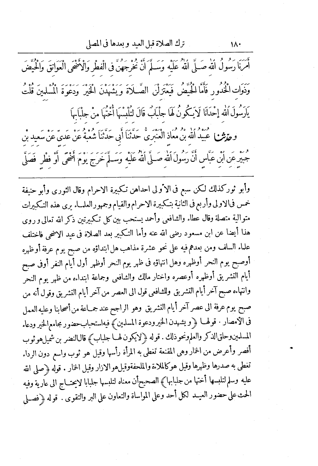 وَأَبُو ثَوْرٍ كَذَلِكَ لَكِنْ سَبْعٌ فِي الْأُولَى إِحْدَاهُنَّ تَكْبِيرَةُ الْإِحْرَامِ وَقَالَ الثَّوْرِيُّ وَأَبُو حَنِيفَةَ خَمْسٌ فِي الْأُولَى وَأَرْبَعٌ فِي الثَّانِيَةِ بِتَكْبِيرَةِ الْإِحْرَامِ وَالْقِيَامِ وَجُمْهُورُ الْعُلَمَاءِ يَرَى هَذِهِ التَّكْبِيرَاتِ مُتَوَالِيَةً مُتَّصِلَةً وَقَالَ عَطَاءٌ وَالشَّافِعِيُّ وَأَحْمَدُ يُسْتَحَبُّ بَيْنَ كُلِّ تَكْبِيرَتَيْنِ ذِكْرُ اللَّهِ تَعَالَى وَرُوِيَ هذا أيضا عن بن مَسْعُودٍ رَضِيَ اللَّهُ عَنْهُ وَأَمَّا التَّكْبِيرُ بَعْدَ الصَّلَاةِ فِي عِيدِ الْأَضْحَى فَاخْتَلَفَ عُلَمَاءُ السَّلَفِ وَمَنْ بَعْدَهُمْ فِيهِ عَلَى نَحْوِ عَشَرَةَ مَذَاهِبٍ هَلِ ابْتِدَاؤُهُ مِنْ صُبْحِ يَوْمِ عَرَفَةَ أَوْ ظُهْرِهِ أَوْ صُبْحِ يَوْمِ النَّحْرِ أَوْ ظُهْرِهِ وَهَلِ انْتِهَاؤُهُ فِي ظُهْرِ يَوْمِ النَّحْرِ أَوْ ظُهْرِ أَوَّلِ أَيَّامِ النَّفْرِ أَوْ فِي صُبْحِ أَيَّامِ التَّشْرِيقِ أَوْ ظُهْرِهِ أَوْ عَصْرِهِ وَاخْتَارَ مَالِكٌ وَالشَّافِعِيُّ وَجَمَاعَةٌ ابْتِدَاءَهُ مِنْ ظُهْرِ يَوْمِ النَّحْرِ وَانْتِهَاءَهُ صُبْحَ آخِرِ أَيَّامِ التَّشْرِيقِ وَلِلشَّافِعِيِّ قوله إلى الْعَصْرُ مِنْ آخِرِ أَيَّامِ التَّشْرِيقِ وَقَوْلٌ إِنَّهُ مِنْ صُبْحِ يَوْمِ عَرَفَةَ إِلَى عَصْرِ آخِرِ أَيَّامِ التَّشْرِيقِ وَهُوَ الرَّاجِحُ عِنْدَ جَمَاعَةٍ مِنْ أَصْحَابِنَا وَعَلَيْهِ الْعَمَلُ فِي الْأَمْصَارِ قَوْلُهَا وَيَشْهَدْنَ الْخَيْرَ وَدَعْوَةَ الْمُسْلِمِينَ فِيهِ اسْتِحْبَابُ حُضُورِ مَجَامِعِ الْخَيْرِ وَدُعَاءِ الْمُسْلِمِينَ وَحِلَقِ الذِّكْرِ وَالْعِلْمِ وَنَحْوِ ذلك قوله لَا يَكُونُ لَهَا جِلْبَابٌ قَالَ النَّضْرُ بْنُ شُمَيْلٍ هُوَ ثَوْبٌ أَقْصَرُ وَأَعْرَضُ مِنَ الْخِمَارِ وَهِيَ الْمِقْنَعَةُ تُغَطِّي بِهِ الْمَرْأَةُ رَأْسَهَا وَقِيلَ هُوَ ثَوْبٌ وَاسِعٌ دُونَ الرِّدَاءِ تُغَطِّي بِهِ صَدْرَهَا وَظَهْرَهَا وَقِيلَ هُوَ كَالْمَلَاءَةِ وَالْمِلْحَفَةِ وَقِيلَ هُوَ الْإِزَارُ وَقِيلَ الْخِمَارُ قَوْلُهُ صَلَّى اللَّهُ عَلَيْهِ وَسَلَّمَ لِتُلْبِسْهَا أُخْتُهَا مِنْ جِلْبَابِهَا الصَّحِيحُ أن معناه لتلبسها جلبابا لا يحتاج إلى عَارِيَةً وَفِيهِ الْحَثُّ عَلَى حُضُورِ الْعِيدِ لِكُلِّ أَحَدٍ وَعَلَى الْمُوَاسَاةِ وَالتَّعَاوُنِ عَلَى الْبِرِّ وَالتَّقْوَى