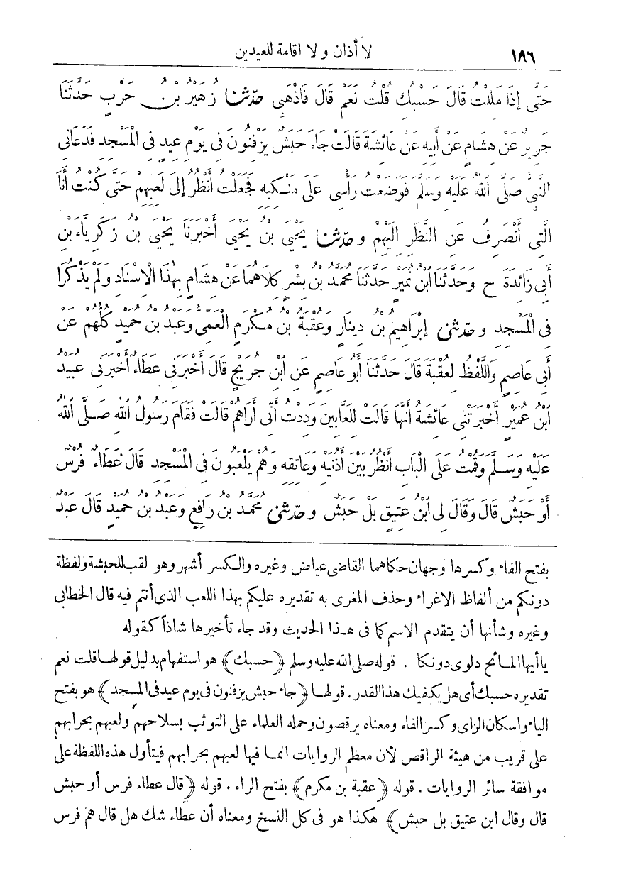 بِفَتْحِ الْفَاءِ وَكَسْرِهَا وَجْهَانِ حَكَاهُمَا الْقَاضِي عِيَاضٌ وَغَيْرُهُ وَالْكَسْرُ أَشْهَرُ وَهُوَ لَقَبٌ لِلْحَبَشَةِ وَلَفْظَةُ دُونَكُمْ مِنْ أَلْفَاظِ الْإِغْرَاءِ وَحَذَفَ الْمُغْرَى بِهِ تَقْدِيرُهُ عَلَيْكُمْ بِهَذَا اللَّعِبِ الَّذِي أَنْتُمْ فِيهِ قَالَ الْخَطَّابِيُّ وَغَيْرُهُ وَشَأْنُهَا أَنْ يَتَقَدَّمَ الِاسْمُ كَمَا فِي هَذَا الْحَدِيثِ وَقَدْ جَاءَ تَأْخِيرُهَا شَاذًّا كَقَوْلِهِ يَا أَيُّهَا الْمَائِحُ دَلْوِي دُونَكَا قَوْلُهُ صَلَّى اللَّهُ عَلَيْهِ وَسَلَّمَ حَسْبُكِ هُوَ اسْتِفْهَامٌ بِدَلِيلِ قَوْلِهَا قُلْتُ نَعَمْ تَقْدِيرُهُ حَسْبُكِ أَيْ هَلْ يَكْفِيكِ هَذَا الْقَدْرُ قَوْلُهَا جَاءَ حَبَشٌ يَزْفِنُونَ فِي يَوْمِ عِيدٍ فِي الْمَسْجِدِ هُوَ بِفَتْحِ الْيَاءِ وَإِسْكَانِ الزَّايِ وَكَسْرِ الْفَاءِ وَمَعْنَاهُ يَرْقُصُونَ وَحَمَلَهُ الْعُلَمَاءُ عَلَى التَّوَثُّبِ بِسِلَاحِهِمْ وَلَعِبِهِمْ بِحِرَابِهِمْ عَلَى قَرِيبٍ مِنْ هَيْئَةِ الرَّاقِصِ لِأَنَّ مُعْظَمَ الرِّوَايَاتِ إِنَّمَا فِيهَا لَعِبهِمْ بِحِرَابِهِمْ فَيُتَأَوَّلُ هَذِهِ اللَّفْظَةُ عَلَى مُوَافَقَةِ سَائِرِ الرِّوَايَاتِ قَوْلُهُ عُقْبَةُ بْنُ مُكْرَمٍ بِفَتْحِ الرَّاءِ قَوْلُهُ قَالَ عَطَاءٌ فُرْسٌ أَوْ حَبَشٌ قَالَ وَقَالَ بن عَتِيقٍ بَلْ حَبَشٌ هَكَذَا هُوَ فِي كُلِّ النُّسَخِ وَمَعْنَاهُ أَنَّ عَطَاءً شَكَّ هَلْ قَالَ هم فرس