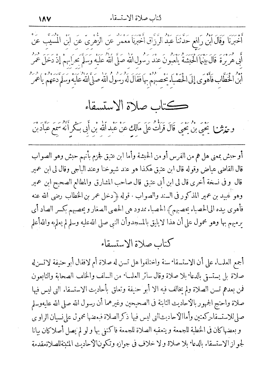 (كتاب صلاة الاستسقاء أَجْمَعَ الْعُلَمَاءُ عَلَى أَنَّ الِاسْتِسْقَاءَ سُنَّةٌ وَاخْتَلَفُوا هَلْ تُسَنُّ لَهُ صَلَاةٌ أَمْ لَا فَقَالَ أَبُو حَنِيفَةَ لَا تُسَنُّ لَهُ صَلَاةٌ بَلْ يُسْتَسْقَى بِالدُّعَاءِ بِلَا صَلَاةٍ وَقَالَ سَائِرُ الْعُلَمَاءِ مِنَ السَّلَفِ وَالْخَلَفِ الصَّحَابَةُ وَالتَّابِعُونَ فَمَنْ بَعْدَهُمْ تُسَنُّ الصَّلَاةُ وَلَمْ يُخَالِفْ فِيهِ إِلَّا أَبُو حَنِيفَةَ وَتَعَلَّقَ بِأَحَادِيثِ الِاسْتِسْقَاءِ الَّتِي لَيْسَ فِيهَا صَلَاةٌ وَاحْتَجَّ الْجُمْهُورُ بِالْأَحَادِيثِ الثَّابِتَةِ فِي الصَّحِيحَيْنِ وَغَيْرِهِمَا أَنَّ رَسُولَ اللَّهِ صَلَّى اللَّهُ عَلَيْهِ وَسَلَّمَ صَلَّى لِلِاسْتِسْقَاءِ رَكْعَتَيْنِ وَأَمَّا الْأَحَادِيثُ الَّتِي لَيْسَ فِيهَا ذِكْرُ الصَّلَاةِ فَبَعْضُهَا مَحْمُولٌ عَلَى نِسْيَانِ الرَّاوِي وَبَعْضُهَا كَانَ فِي الْخُطْبَةِ لِلْجُمُعَةِ وَيَتَعَقَّبُهُ الصَّلَاةُ لِلْجُمُعَةِ فَاكْتَفَى بِهَا وَلَوْ لَمْ يُصَلِّ أَصْلًا كَانَ بَيَانًا لِجَوَازِ الِاسْتِسْقَاءِ بِالدُّعَاءِ بِلَا صَلَاةٍ وَلَا خِلَافَ فِي جَوَازِهِ وَتَكُونُ الْأَحَادِيثُ الْمُثْبِتَةُ لِلصَّلَاةِ مُقَدَّمَةً)