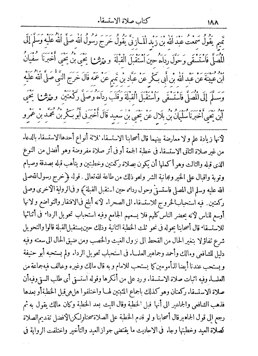 [894] قَوْلُهُ خَرَجَ رَسُولُ اللَّهِ صَلَّى اللَّهُ عَلَيْهِ وَسَلَّمَ إِلَى الْمُصَلَّى فَاسْتَسْقَى وَحَوَّلَ رِدَاءَهُ حِينَ اسْتَقْبَلَ الْقِبْلَةَ وَفِي الرِّوَايَةِ الْأُخْرَى وَصَلَّى رَكْعَتَيْنِ فِيهِ اسْتِحْبَابُ الْخُرُوجِ لِلِاسْتِسْقَاءِ إِلَى الصَّحْرَاءِ لِأَنَّهُ أَبْلَغُ فِي الِافْتِقَارِ وَالتَّوَاضُعِ وَلِأَنَّهَا أَوْسَعُ لِلنَّاسِ لِأَنَّهُ يَحْضُرُ النَّاسُ كُلُّهُمْ فَلَا يَسَعُهُمُ الجامع وفيه اسْتِحْبَابِ تَحْوِيلِ الرِّدَاءِ فِي أَثْنَائِهَا لِلِاسْتِسْقَاءِ قَالَ أَصْحَابُنَا يُحَوِّلُهُ فِي نَحْوِ ثُلُثِ الْخُطْبَةِ الثَّانِيَةِ وَذَلِكَ حِينَ يَسْتَقْبِلُ الْقِبْلَةَ قَالُوا وَالتَّحْوِيلُ شُرِعَ تَفَاؤُلًا بِتَغَيُّرِ الْحَالِ مِنَ الْقَحْطِ إِلَى نُزُولِ الْغَيْثِ وَالْخِصْبِ وَمِنْ ضِيقِ الْحَالِ إِلَى سَعَتِهِ وَفِيهِ دَلِيلٌ لِلشَّافِعِيِّ وَمَالِكٍ وَأَحْمَدَ وَجَمَاهِيرِ الْعُلَمَاءِ فِي اسْتِحْبَابِ تَحْوِيلِ الرِّدَاءِ وَلَمْ يَسْتَحِبَّهُ أَبُو حَنِيفَةَ وَيُسْتَحَبُّ عِنْدَنَا أَيْضًا لِلْمَأْمُومِينَ كَمَا يُسْتَحَبُّ لِلْإِمَامِ وَبِهِ قَالَ مَالِكٌ وَغَيْرُهُ وَخَالَفَ فِيهِ جَمَاعَةٌ مِنَ الْعُلَمَاءِ وَفِيهِ إِثْبَاتُ صَلَاةِ الِاسْتِسْقَاءِ وَرَدٌّ عَلَى مَنْ أَنْكَرَهَا وَقَوْلُهُ اسْتَسْقَى أَيْ طَلَبَ السَّقْيَ وَفِيهِ أَنَّ صَلَاةَ الِاسْتِسْقَاءِ رَكْعَتَانِ وَهُوَ كَذَلِكَ بِإِجْمَاعِ الْمُثْبِتِينَ لَهَا وَاخْتَلَفُوا هَلْ هِيَ قَبْلَ الْخُطْبَةِ أَوْ بَعْدَهَا فَذَهَبَ الشَّافِعِيُّ وَالْجَمَاهِيرُ إِلَى أَنَّهَا قَبْلَ الْخُطْبَةِ وَقَالَ اللَّيْثُ بَعْدَ الْخُطْبَةِ وَكَانَ مَالِكٌ يَقُولُ بِهِ ثُمَّ رَجَعَ إِلَى قَوْلِ الْجَمَاهِيرِ قَالَ أَصْحَابُنَا وَلَوْ قَدَّمَ الْخُطْبَةَ عَلَى الصَّلَاةِ صَحَّتَا وَلَكِنَّ الْأَفْضَلَ تَقْدِيمُ الصَّلَاةِ كَصَلَاةِ الْعِيدِ وَخُطْبَتِهَا وَجَاءَ فِي الْأَحَادِيثِ مَا يَقْتَضِي جَوَازَ الْعِيدِ وَالتَّأْخِيرِ وَاخْتَلَفَتِ الرواية في