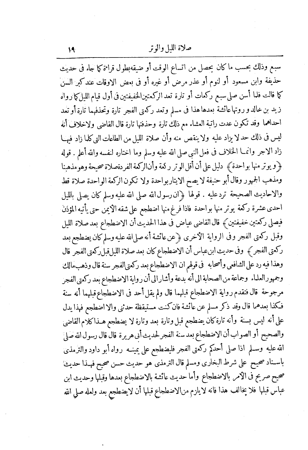 [736] قَوْلُهَا أَنَّ رَسُولَ اللَّهِ صَلَّى اللَّهُ عَلَيْهِ وَسَلَّمَ كَانَ يُصَلِّي بِاللَّيْلِ إِحْدَى عَشْرَةَ رَكْعَةً يُوتِرُ مِنْهَا بِوَاحِدَةٍ فَإِذَا فَرَغَ مِنْهَا اضْطَجَعَ عَلَى شِقِّهِ الْأَيْمَنِ حَتَّى يَأْتِيهِ الْمُؤَذِّنُ فَيُصَلِّي رَكْعَتَيْنِ خَفِيفَتَيْنِ قَالَ الْقَاضِي عِيَاضٌ فِي هَذَا الْحَدِيثِ أَنَّ الِاضْطِجَاعَ بَعْدَ صَلَاةِ اللَّيْلِ وَقَبْلَ رَكْعَتَيِ الْفَجْرِ وَفِي الرِّوَايَةِ الْأُخْرَى عَنْ عَائِشَةَ أَنَّهُ صَلَّى اللَّهُ عَلَيْهِ وَسَلَّمَ كَانَ يَضْطَجِعُ بَعْدَ رَكْعَتَيِ الْفَجْرِ وفي حديث بن عَبَّاسٍ أَنَّ الِاضْطِجَاعَ كَانَ بَعْدَ صَلَاةِ اللَّيْلِ قَبْلَ رَكْعَتَيِ الْفَجْرِ قَالَ وَهَذَا فِيهِ رَدٌّ عَلَى الشَّافِعِيِّ وَأَصْحَابِهِ فِي قَوْلِهِمْ أَنَّ الِاضْطِجَاعَ بَعْدَ رَكْعَتَيِ الْفَجْرِ سُنَّةٌ قَالَ وَذَهَبَ مَالِكٌ وَجُمْهُورُ الْعُلَمَاءِ وَجَمَاعَةٌ مِنَ الصَّحَابَةِ إِلَى أَنَّهُ بِدْعَةٌ وَأَشَارَ إِلَى أَنَّ رِوَايَةَ الِاضْطِجَاعِ بَعْدَ رَكْعَتَيِ الْفَجْرِ مَرْجُوحَةٌ قَالَ فَتُقَدَّمُ رِوَايَةُ الِاضْطِجَاعِ قَبْلَهُمَا قَالَ وَلَمْ يَقُلْ أَحَدٌ فِي الِاضْطِجَاعِ قبلهما أنه سنة فكذا بعدهما قَالَ وَقَدْ ذَكَرَ مُسْلِمٌ عَنْ عَائِشَةَ فَإِنْ كُنْتُ مُسْتَيْقِظَةً حَدَّثَنِي وَإِلَّا اضْطَجَعَ فَهَذَا يَدُلُّ عَلَى أَنَّهُ لَيْسَ بِسُنَّةٍ وَأَنَّهُ تَارَةً كَانَ يَضْطَجِعُ قَبْلُ وَتَارَةً بَعْدُ وَتَارَةً لَا يَضْطَجِعُ هَذَا كَلَامُ الْقَاضِي وَالصَّحِيحُ أَوِ الصَّوَابُ أَنَّ الِاضْطِجَاعَ بَعْدَ سُنَّةِ الْفَجْرِ لِحَدِيثِ أَبِي هُرَيْرَةَ قَالَ قَالَ رَسُولُ اللَّهِ صَلَّى اللَّهُ عَلَيْهِ وَسَلَّمَ إِذَا صَلَّى أَحَدُكُمْ رَكْعَتَيِ الْفَجْرِ فَلْيَضْطَجِعْ عَلَى يَمِينِهِ رَوَاهُ أَبُو دَاوُدَ وَالتِّرْمِذِيُّ بِإِسْنَادٍ صَحِيحٍ عَلَى شَرْطِ الْبُخَارِيِّ وَمُسْلِمٍ قَالَ التِّرْمِذِيُّ هُوَ حَدِيثٌ حَسَنٌ صَحِيحٌ فَهَذَا حَدِيثٌ صَحِيحٌ صَرِيحٌ فِي الْأَمْرِ بِالِاضْطِجَاعِ وَأَمَّا حَدِيثُ عَائِشَةَ بالاضطجاع بعدها وقبلها وحديث بن عَبَّاسٍ قَبْلَهَا فَلَا يُخَالِفُ هَذَا فَإِنَّهُ لَا يلزم من الاضطجاع قبلها أن لا يضطجع بعد ولعله صل ى اللَّهُ عَلَيْهِ وَسَلَّمَ