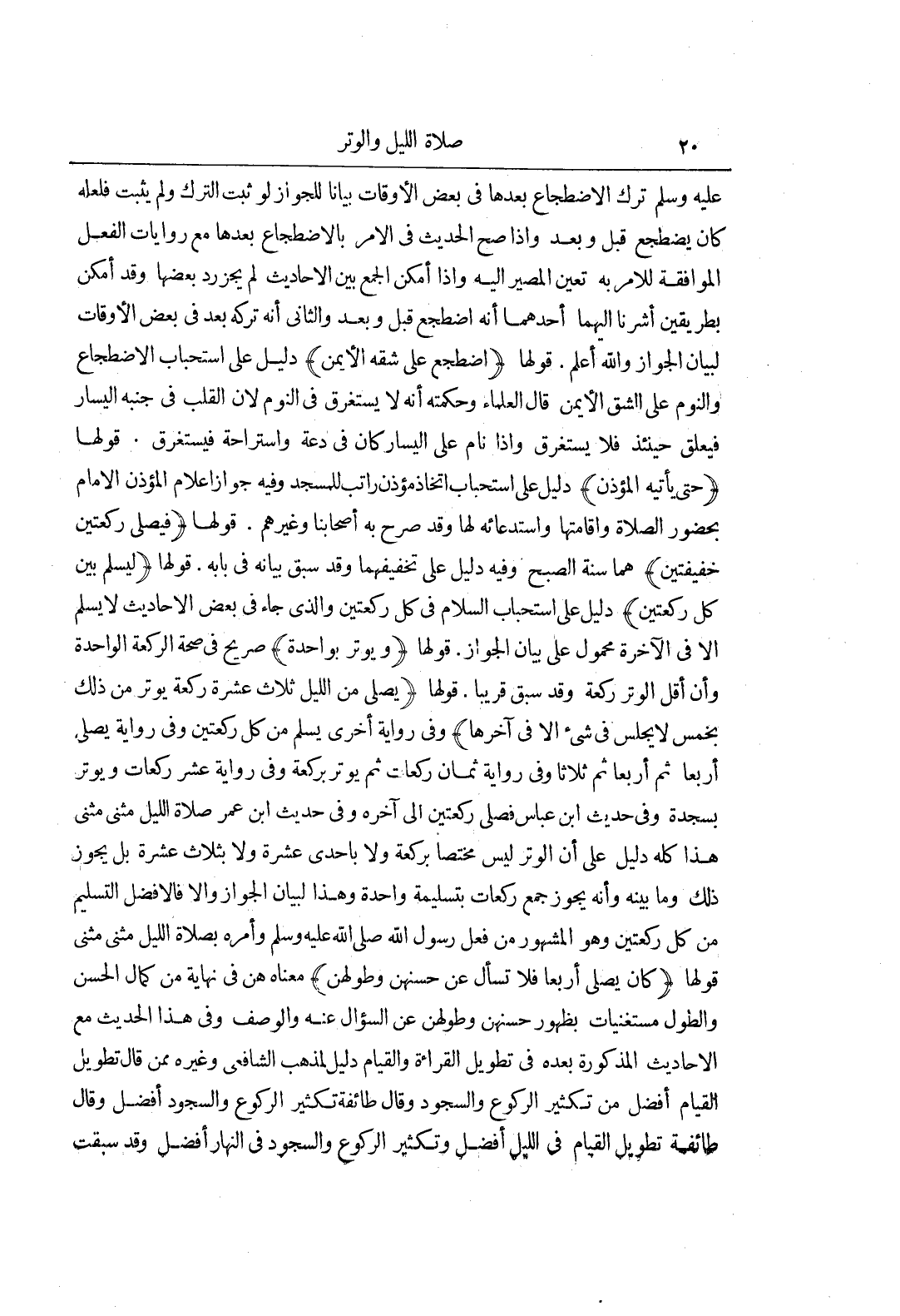 تَرَكَ الِاضْطِجَاعَ بَعْدَهَا فِي بَعْضِ الْأَوْقَاتِ بَيَانًا لِلْجَوَازِ لَوْ ثَبَتَ التَّرْكُ وَلَمْ يَثْبُتْ فَلَعَلَّهُ كَانَ يَضْطَجِعُ قَبْلُ وَبَعْدُ وَإِذَا صَحَّ الْحَدِيثُ فِي الْأَمْرِ بِالِاضْطِجَاعِ بَعْدَهَا مَعَ رِوَايَاتِ الْفِعْلِ الْمُوَافِقَةِ لِلْأَمْرِ بِهِ تَعَيَّنَ الْمَصِيرُ إِلَيْهِ وَإِذَا أَمْكَنَ الْجَمْعُ بَيْنَ الْأَحَادِيثِ لَمْ يَجُزْ رَدُّ بَعْضِهَا وَقَدْ أَمْكَنَ بِطَرِيقَيْنِ أَشَرْنَا إِلَيْهِمَا أَحَدُهُمَا أَنَّهُ اضْطَجَعَ قَبْلُ وَبَعْدُ وَالثَّانِي أَنَّهُ تَرَكَهُ بَعْدُ فِي بَعْضِ الْأَوْقَاتِ لِبَيَانِ الْجَوَازِ وَاللَّهُ أَعْلَمُ قَوْلُهَا اضْطَجَعَ عَلَى شِقِّهِ الْأَيْمَنِ دَلِيلٌ عَلَى اسْتِحْبَابِ الِاضْطِجَاعِ وَالنَّوْمِ عَلَى الشِّقِّ الْأَيْمَنِ قَالَ الْعُلَمَاءُ وَحِكْمَتُهُ أَنَّهُ لَا يَسْتَغْرِقُ فِي النَّوْمِ لِأَنَّ الْقَلْبَ فِي جَنْبِهِ الْيَسَارِ فَيَعْلَقُ حِينَئِذٍ فَلَا يَسْتَغْرِقُ وَإِذَا نَامَ عَلَى الْيَسَارِ كَانَ فِي دَعَةٍ وَاسْتِرَاحَةٍ فَيَسْتَغْرِقُ قَوْلُهَا حَتَّى يَأْتِيهِ الْمُؤَذِّنُ دَلِيلٌ عَلَى اسْتِحْبَابِ اتِّخَاذِ مُؤَذِّنٍ رَاتِبٍ لِلْمَسْجِدِ وَفِيهِ جَوَازُ إِعْلَامِ الْمُؤَذِّنِ الْإِمَامَ بِحُضُورِ الصَّلَاةِ وَإِقَامَتِهَا وَاسْتِدْعَائِهِ لَهَا وَقَدْ صَرَّحَ بِهِ أَصْحَابُنَا وَغَيْرُهُمْ قَوْلُهَا فَيُصَلِّي رَكْعَتَيْنِ خَفِيفَتَيْنِ هُمَا سُنَّةُ الصُّبْحِ وَفِيهِ دَلِيلٌ عَلَى تَخْفِيفِهِمَا وَقَدْ سَبَقَ بَيَانُهُ فِي بَابِهِ قَوْلُهَا لَيُسَلِّمُ بَيْنَ كُلِّ رَكْعَتَيْنِ دَلِيلٌ عَلَى اسْتِحْبَابِ السَّلَامِ فِي كُلِّ رَكْعَتَيْنِ وَالَّذِي جَاءَ فِي بَعْضِ الْأَحَادِيثِ لَا يُسَلِّمُ إِلَّا فِي الْآخِرَةِ مَحْمُولٌ عَلَى بَيَانِ الْجَوَازِ قَوْلُهَا وَيُوتِرُ بِوَاحِدَةٍ صَرِيحٌ فِي صِحَّةِ الرَّكْعَةِ الْوَاحِدَةِ وَأَنَّ أَقَلَّ الْوِتْرِ رَكْعَةٌ وَقَدْ سَبَقَ قَرِيبًا