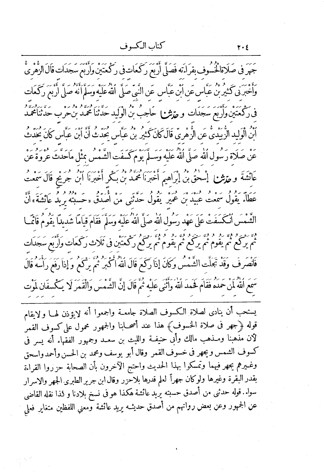 يُسْتَحَبُّ أَنْ يُنَادَى لِصَلَاةِ الْكُسُوفِ الصَّلَاةُ جَامِعَةٌ وَأَجْمَعُوا أَنَّهُ لَا يُؤَذَّنُ لَهَا وَلَا يُقَامُ قَوْلُهُ جَهَرَ فِي صَلَاةِ الْخُسُوفِ هَذَا عِنْدَ أَصْحَابِنَا وَالْجُمْهُورِ مَحْمُولٌ عَلَى كُسُوفِ الْقَمَرِ لِأَنَّ مَذْهَبَنَا وَمَذْهَبَ مَالِكٍ وَأَبِي حَنِيفَةَ وَاللَّيْثِ بْنِ سَعْدٍ وَجُمْهُورِ الْفُقَهَاءِ أَنَّهُ يُسِرُّ فِي كُسُوفِ الشَّمْسِ وَيَجْهَرُ فِي خُسُوفِ الْقَمَرِ وَقَالَ أَبُو يوسف ومحمد بن الحسن وأحمد واسحق وَغَيْرُهُمْ يَجْهَرُ فِيهِمَا وَتَمَسَّكُوا بِهَذَا الْحَدِيثِ وَاحْتَجَّ الْآخَرُونَ بِأَنَّ الصَّحَابَةَ حَزَرُوا الْقِرَاءَةَ بِقَدْرِ الْبَقَرَةِ وغيرها ولو كان جهرا لعلم قدرها بلا حزر وقال بن جَرِيرٍ الطَّبَرِيُّ الْجَهْرُ وَالْإِسْرَارُ سَوَاءٌ قَوْلُهُ حَدَّثَنِي مَنْ أُصَدِّقُ حَسِبْتُهُ يُرِيدُ عَائِشَةَ هَكَذَا هُوَ فِي نُسَخِ بِلَادِنَا وَكَذَا نَقَلَهُ الْقَاضِي عَنِ الْجُمْهُورِ وَعَنْ بَعْضِ رُوَاتِهِمْ مَنْ أُصَدِّقُ حَدِيثَهُ يُرِيدُ عَائِشَةَ وَمَعْنَى اللَّفْظَيْنِ مُتَغَايِرٌ فَعَلَى