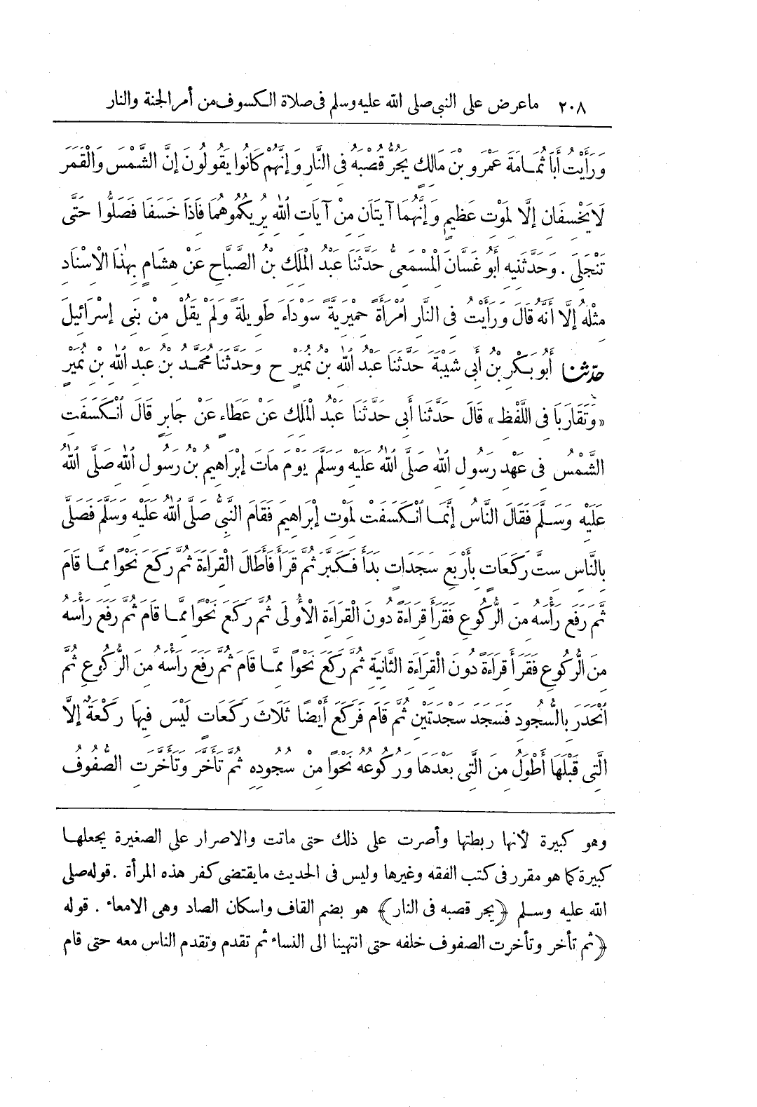 وَهُوَ كَبِيرَةٌ لِأَنَّهَا رَبَطَتْهَا وَأَصَرَّتْ عَلَى ذَلِكَ حَتَّى مَاتَتْ وَالْإِصْرَارُ عَلَى الصَّغِيرَةِ يَجْعَلُهَا كَبِيرَةً كَمَا هُوَ مُقَرَّرٌ فِي كُتُبِ الْفِقْهِ وَغَيْرِهَا وَلَيْسَ فِي الْحَدِيثِ مَا يَقْتَضِي كُفْرَ هَذِهِ الْمَرْأَةِ قَوْلُهُ صَلَّى اللَّهُ عَلَيْهِ وَسَلَّمَ يَجُرُّ قُصْبَهُ فِي النَّارِ هُوَ بِضَمِّ الْقَافِ وَإِسْكَانِ الصَّادِ وَهِيَ الْأَمْعَاءُ قَوْلُهُ ثُمَّ تَأَخَّرَ وَتَأَخَّرَتِ الصُّفُوفُ خَلْفَهُ حَتَّى انْتَهَيْنَا إِلَى النِّسَاءِ ثُمَّ تَقَدَّمَ وَتَقَدَّمَ النَّاسُ مَعَهُ حَتَّى قَامَ