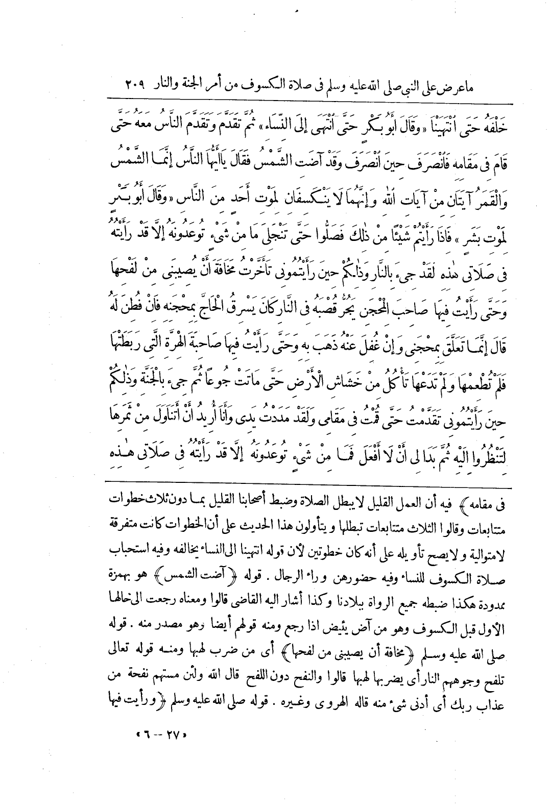 فِي مَقَامِهِ فِيهِ أَنَّ الْعَمَلَ الْقَلِيلَ لَا يُبْطِلُ الصَّلَاةَ وَضَبَطَ أَصْحَابُنَا الْقَلِيلَ بِمَا دُونَ ثَلَاثِ خُطُوَاتٍ مُتَتَابِعَاتٍ وَقَالُوا الثَّلَاثُ مُتَتَابِعَاتٍ تُبْطِلُهَا وَيَتَأَوَّلُونَ هَذَا الْحَدِيثَ عَلَى أَنَّ الْخُطُوَاتِ كَانَتْ مُتَفَرِّقَةً لَا مُتَوَالِيَةً وَلَا يَصِحُّ تَأْوِيلُهُ عَلَى أَنَّهُ كَانَ خُطْوَتَيْنِ لِأَنَّ قَوْلَهُ انْتَهَيْنَا إِلَى النِّسَاءِ يُخَالِفُهُ وَفِيهِ اسْتِحْبَابُ صَلَاةِ الْكُسُوفِ لِلنِّسَاءِ وَفِيهِ حُضُورُهُنَّ وَرَاءَ الرِّجَالِ قَوْلُهُ آضَتِ الشَّمْسُ هُوَ بِهَمْزَةٍ مَمْدُودَةٍ هَكَذَا ضَبَطَهُ جَمِيعُ الرُّوَاةِ بِبِلَادِنَا وَكَذَا أَشَارَ إِلَيْهِ الْقَاضِي قَالُوا وَمَعْنَاهُ رَجَعَتْ إِلَى حَالِهَا الْأَوَّلِ قَبْلَ الْكُسُوفِ وَهُوَ مِنْ آضَ يَئِيضُ إِذَا رَجَعَ وَمِنْهُ قَوْلُهُمْ أَيْضًا وَهُوَ مَصْدَرٌ مِنْهُ قَوْلُهُ صَلَّى اللَّهُ عَلَيْهِ وَسَلَّمَ مَخَافَةَ أَنْ يُصِيبَنِي مِنْ لَفْحِهَا أَيْ مِنْ ضَرْبِ لَهَبِهَا وَمِنْهُ قَوْلُهُ تَعَالَى تلفح وجوههم النار أَيْ يَضْرِبُهَا لَهَبُهَا قَالُوا وَالنَّفْحُ دُونَ اللَّفْحِ قال الله ... ولئن مستهم نفحة من عذاب ربك أَيْ أَدْنَى شَيْءٍ مِنْهُ قَالَهُ الْهَرَوِيُّ وَغَيْرُهُ قَوْلُهُ صَلَّى اللَّهُ عَلَيْهِ وَسَلَّمَ وَرَأَيْتُ فِيهَا