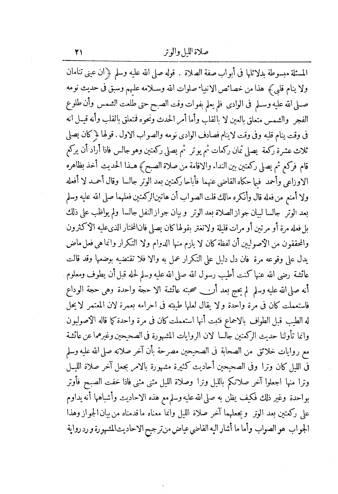 الْمَسْأَلَةُ مَبْسُوطَةً بِدَلَائِلِهَا فِي أَبْوَابِ صِفَةِ الصَّلَاةِ قوله صلى الله عليه وسلم إن عيني تَنَامَانِ وَلَا يَنَامُ قَلْبِي هَذَا مِنْ خَصَائِصِ الْأَنْبِيَاءِ صَلَوَاتُ اللَّهِ وَسَلَامُهُ عَلَيْهِمْ وَسَبَقَ فِي حَدِيثِ نَوْمِهِ صَلَّى اللَّهُ عَلَيْهِ وَسَلَّمَ فِي الْوَادِي فَلَمْ يَعْلَمْ بِفَوَاتِ وَقْتِ الصُّبْحِ حَتَّى طَلَعَتِ الشَّمْسُ وَأَنَّ طُلُوعَ الْفَجْرِ وَالشَّمْسِ مُتَعَلِّقٌ بِالْعَيْنِ لَا بِالْقَلْبِ وَأَمَّا أَمْرُ الْحَدَثِ وَنَحْوِهِ فَمُتَعَلِّقٌ بِالْقَلْبِ وَأَنَّهُ قِيلَ إِنَّهُ فِي وَقْتٍ يَنَامُ قَلْبُهُ وَفِي وَقْتٍ لَا يَنَامُ فَصَادَفَ الْوَادِي نَوْمَهُ وَالصَّوَابُ الْأَوَّلُ قَوْلُهَا كَانَ يُصَلِّي ثَلَاثَ عَشْرَةَ رَكْعَةً يُصَلِّي ثَمَانِ رَكَعَاتٍ ثُمَّ يُوتِرُ ثُمَّ يُصَلِّي رَكْعَتَيْنِ وَهُوَ جَالِسٌ فَإِذَا أَرَادَ أَنْ يَرْكَعَ قَامَ فَرَكَعَ ثُمَّ يُصَلِّي رَكْعَتَيْنِ بَيْنَ النِّدَاءِ وَالْإِقَامَةِ مِنْ صَلَاةِ الصُّبْحِ هَذَا الْحَدِيثُ أَخَذَ بِظَاهِرِهِ الْأَوْزَاعِيُّ وَأَحْمَدُ فِيمَا حَكَاهُ الْقَاضِي عَنْهُمَا فَأَبَاحَا رَكْعَتَيْنِ بَعْدَ الْوِتْرِ جَالِسًا وَقَالَ أَحْمَدُ لَا أَفْعَلُهُ وَلَا أَمْنَعُ مَنْ فَعَلَهُ قَالَ وَأَنْكَرَهُ مَالِكٌ قُلْتُ الصَّوَابُ أَنَّ هَاتَيْنِ الرَّكْعَتَيْنِ فَعَلَهُمَا صَلَّى اللَّهُ عَلَيْهِ وَسَلَّمَ بَعْدَ الْوِتْرِ جَالِسًا لِبَيَانِ جَوَازِ الصَّلَاةِ بَعْدَ الْوِتْرِ وَبَيَانِ جَوَازِ النَّفْلِ جَالِسًا وَلَمْ يُوَاظِبْ عَلَى ذَلِكَ بَلْ فَعَلَهُ مَرَّةً أَوْ مَرَّتَيْنِ أَوْ مَرَّاتٍ قَلِيلَةٍ وَلَا تَغْتَرَّ بِقَوْلِهَا كَانَ يُصَلِّي فَإِنَّ الْمُخْتَارَ الَّذِي عَلَيْهِ الْأَكْثَرُونَ وَالْمُحَقِّقُونَ مِنَ الْأُصُولِيِّينَ أَنَّ لَفْظَةَ كَانَ لَا يَلْزَمُ مِنْهَا الدَّوَامُ وَلَا التَّكْرَارُ وَإِنَّمَا هِيَ فِعْلٌ مَاضٍ يَدُلُّ عَلَى وُقُوعِهِ مَرَّةً فَإِنْ دَلَّ دَلِيلٌ عَلَى التَّكْرَارِ عُمِلَ بِهِ وَإِلَّا فَلَا تَقْتَضِيهِ بِوَضْعِهَا وَقَدْ قَالَتْ عَائِشَةُ رَضِيَ اللَّهُ عَنْهَا كُنْتُ أُطَيِّبَ رَسُولَ اللَّهِ صَلَّى اللَّهُ عَلَيْهِ وَسَلَّمَ لِحِلِّهِ قَبْلَ أَنْ يَطُوفَ وَمَعْلُومٌ أَنَّهُ صَلَّى اللَّهُ عَلَيْهِ وَسَلَّمَ لَمْ يَحُجَّ بَعْدَ أَنْ صَحِبَتْهُ عَائِشَةُ إِلَّا حَجَّةً وَاحِدَةً وَهِيَ حَجَّةُ الْوَدَاعِ فَاسْتَعْمَلَتْ كَانَ فِي مَرَّةٍ وَاحِدَةٍ وَلَا يُقَالُ لَعَلَّهَا طَيَّبَتْهُ فِي إِحْرَامِهِ بِعُمْرَةٍ لِأَنَّ الْمُعْتَمِرَ لَا يَحِلُّ لَهُ الطِّيبُ قَبْلَ الطَّوَافِ بِالْإِجْمَاعِ فَثَبَتَ أَنَّهَا اسْتَعْمَلَتْ كَانَ فِي مَرَّةٍ وَاحِدَةٍ كَمَا قَالَهُ الْأُصُولِيُّونَ وَإِنَّمَا تَأَوَّلْنَا حَدِيثَ الرَّكْعَتَيْنِ جَالِسًا لِأَنَّ الرِّوَايَاتِ الْمَشْهُورَةِ فِي الصَّحِيحَيْنِ وَغَيْرِهِمَا عَنْ عَائِشَةَ مَعَ رِوَايَاتِ خَلَائِقَ مِنَ الصَّحَابَةِ فِي الصَّحِيحَيْنِ مُصَرِّحَةٌ بِأَنَّ آخِرَ صَلَاتِهِ صَلَّى اللَّهُ عَلَيْهِ وَسَلَّمَ فِي اللَّيْلِ كَانَ وِتْرًا وَفِي الصَّحِيحَيْنِ أَحَادِيثُ كَثِيرَةٌ مَشْهُورَةٌ بِالْأَمْرِ بِجَعْلِ آخِرِ صَلَاةِ اللَّيْلِ وِتْرًا مِنْهَا اجْعَلُوا آخِرَ صَلَاتِكُمْ بِاللَّيْلِ وِتْرًا وصلاة اللَّيْلِ مَثْنَى مَثْنَى فَإِذَا خِفْتَ الصُّبْحَ فَأَوْتِرْ بِوَاحِدَةٍ وَغَيْرُ ذَلِكَ فَكَيْفَ يُظَنُّ بِهِ صَلَّى اللَّهُ عَلَيْهِ وَسَلَّمَ مَعَ هَذِهِ الْأَحَادِيثِ وَأَشْبَاهِهَا أَنَّهُ يُدَاوِمُ عَلَى رَكْعَتَيْنِ بَعْدَ الْوِتْرِ وَيَجْعَلُهُمَا آخِرَ صَلَاةِ اللَّيْلِ وَإِنَّمَا مَعْنَاهُ مَا قَدَّمْنَاهُ مِنْ بَيَانِ الْجَوَاز