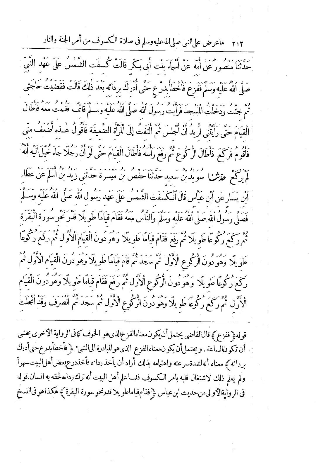 قَوْلُهُ فَفَزِعَ قَالَ الْقَاضِي يَحْتَمِلُ أَنْ يَكُونَ مَعْنَاهُ الْفَزَعُ الَّذِي هُوَ الْخَوْفُ كَمَا فِي الرِّوَايَةِ الْأُخْرَى يَخْشَى أَنْ تَكُونَ السَّاعَةَ وَيَحْتَمِلُ أَنْ يَكُونَ مَعْنَاهُ الْفَزَعُ الَّذِي هُوَ الْمُبَادَرَةُ إِلَى الشَّيْءِ فَأَخْطَأَ بِدِرْعٍ حَتَّى أُدْرِكَ بِرِدَائِهِ مَعْنَاهُ أَنَّهُ لِشِدَّةِ سُرْعَتِهِ وَاهْتِمَامِهِ بِذَلِكَ أَرَادَ أَنْ يَأْخُذَ رِدَاءَهُ فَأَخَذَ دِرْعَ بَعْضِ أَهْلِ الْبَيْتِ سَهْوًا وَلَمْ يَعْلَمْ ذَلِكَ لِاشْتِغَالِ قَلْبِهِ بِأَمْرِ الْكُسُوفِ فَلَمَّا عَلِمَ أَهْلُ الْبَيْتِ أَنَّهُ تَرَكَ رِدَاءَهُ لَحِقَهُ بِهِ إِنْسَانٌ