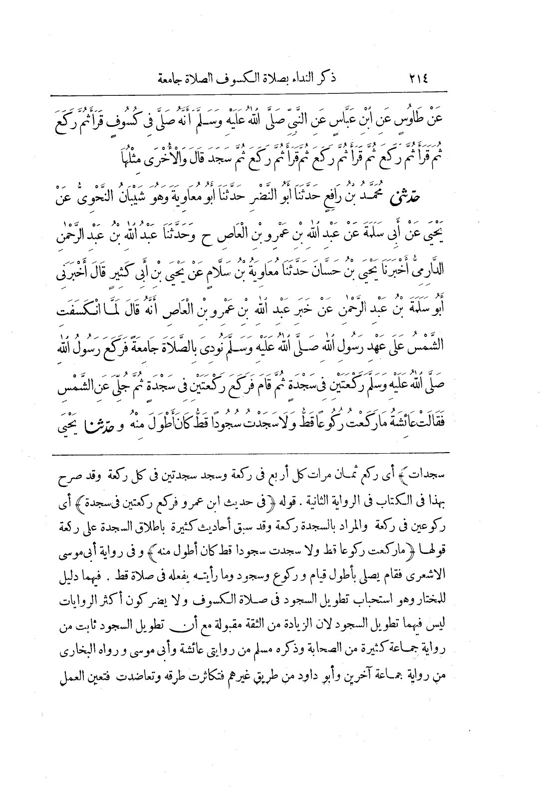 [910] قَوْلُهُ فِي حَدِيثِ بن عَمْرٍو فَرَكَعَ رَكْعَتَيْنِ فِي سَجْدَةٍ أَيْ رُكُوعَيْنِ فِي رَكْعَةٍ وَالْمُرَادُ بِالسَّجْدَةِ رَكْعَةٌ وَقَدْ سَبَقَ أَحَادِيثُ كَثِيرَةٌ بِإِطْلَاقِ السَّجْدَةِ عَلَى رَكْعَةٍ قَوْلُهَا مَا رَكَعْتُ رُكُوعًا قَطُّ وَلَا سَجَدْتُ سُجُودًا قَطُّ كَانَ أَطْوَلَ مِنْهُ وَفِي رِوَايَةِ أَبِي مُوسَى الْأَشْعَرِيِّ فَقَامَ يُصَلِّي بِأَطْوَلِ قِيَامٍ وَرُكُوعٍ وَسُجُودٍ وَمَا رَأَيْتُهُ يَفْعَلُهُ فِي صَلَاةٍ قَطُّ فِيهِمَا دَلِيلٌ لِلْمُخْتَارِ وَهُوَ اسْتِحْبَابُ تَطْوِيلِ السُّجُودِ فِي صَلَاةِ الْكُسُوفِ وَلَا يَضُرُّ كَوْنُ أَكْثَرِ الرِّوَايَاتِ لَيْسَ فِيهِمَا تَطْوِيلُ السُّجُودِ لِأَنَّ الزِّيَادَةَ مِنَ الثِّقَةِ مَقْبُولَةٌ مَعَ أَنَّ تَطْوِيلَ السُّجُودِ ثَابِتٌ مِنْ رِوَايَةِ جَمَاعَةٍ كَثِيرَةٍ مِنَ الصَّحَابَةِ وَذَكَرَهُ مُسْلِمٌ مِنْ رِوَايَتَيْ عَائِشَةَ وَأَبِي مُوسَى وَرَوَاهُ الْبُخَاريُّ مِنْ رِوَايَةِ جَمَاعَةٍ آخَرِينَ وَأَبُو داود من طريق غيرهم فتكاثرت طُرُقُهُ وَتَعَاضَدَتْ فَتَعَيَّنَ الْعَمَلُ