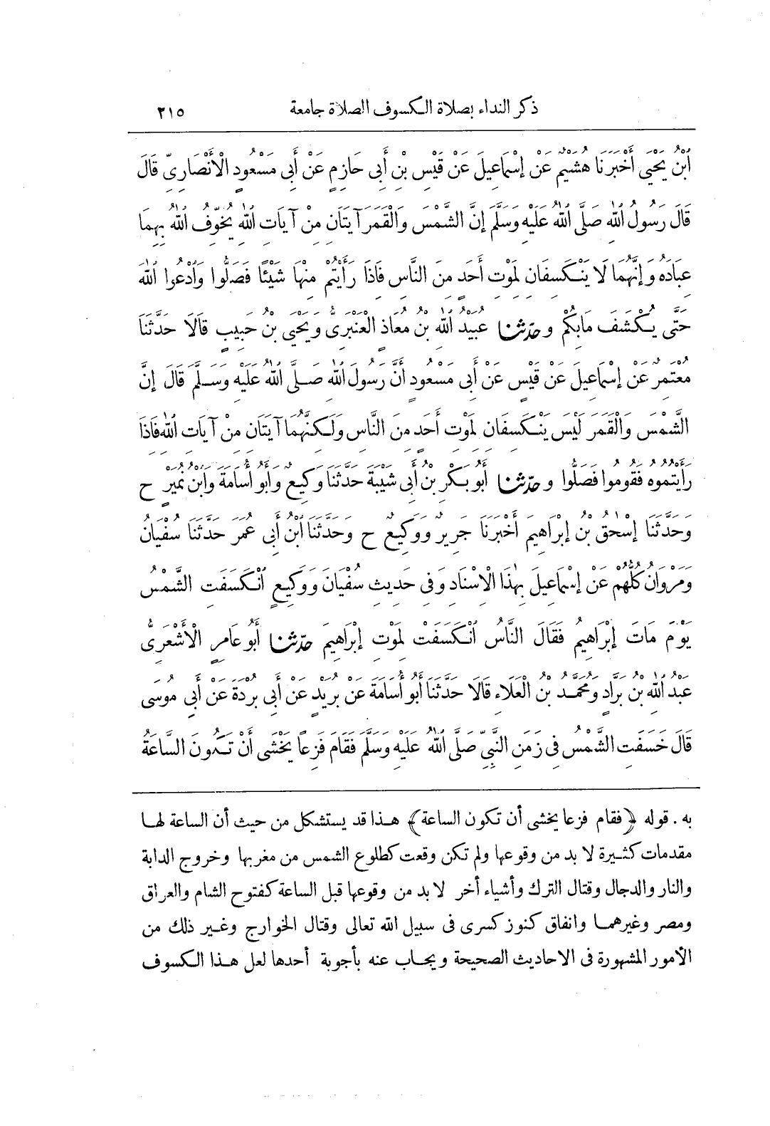 [912] قَوْلُهُ فَقَامَ فَزِعًا يَخْشَى أَنْ تَكُونَ السَّاعَةُ هَذَا قَدْ يُسْتَشْكَلُ مِنْ حَيْثُ أَنَّ السَّاعَةَ لَهَا مُقَدِّمَاتٌ كَثِيرَةٌ لَا بُدَّ مِنْ وُقُوعِهَا وَلَمْ تَكُنْ وَقَعَتْ كَطُلُوعِ الشَّمْسِ مِنْ مَغْرِبِهَا وَخُرُوجِ الدَّابَّةِ وَالنَّارِ وَالدَّجَّالِ وَقِتَالِ التُّرْكِ وَأَشْيَاءَ أُخَرَ لَا بُدَّ مِنْ وُقُوعِهَا قَبْلَ الساعة كفتوح الشام والعراق ومصر وغيرهما وَإِنْفَاقِ كُنُوزِ كِسْرَى فِي سَبِيلِ اللَّهِ تَعَالَى وَقِتَالِ الْخَوَارِجِ وَغَيْرِ ذَلِكَ مِنَ الْأُمُورِ الْمَشْهُورَةِ فِي الْأَحَادِيثِ الصَّحِيحَةِ وَيُجَابُ عَنْهُ بِأَجْوِبَةٍ أَحَدِهَا لعل هذا الكسوف