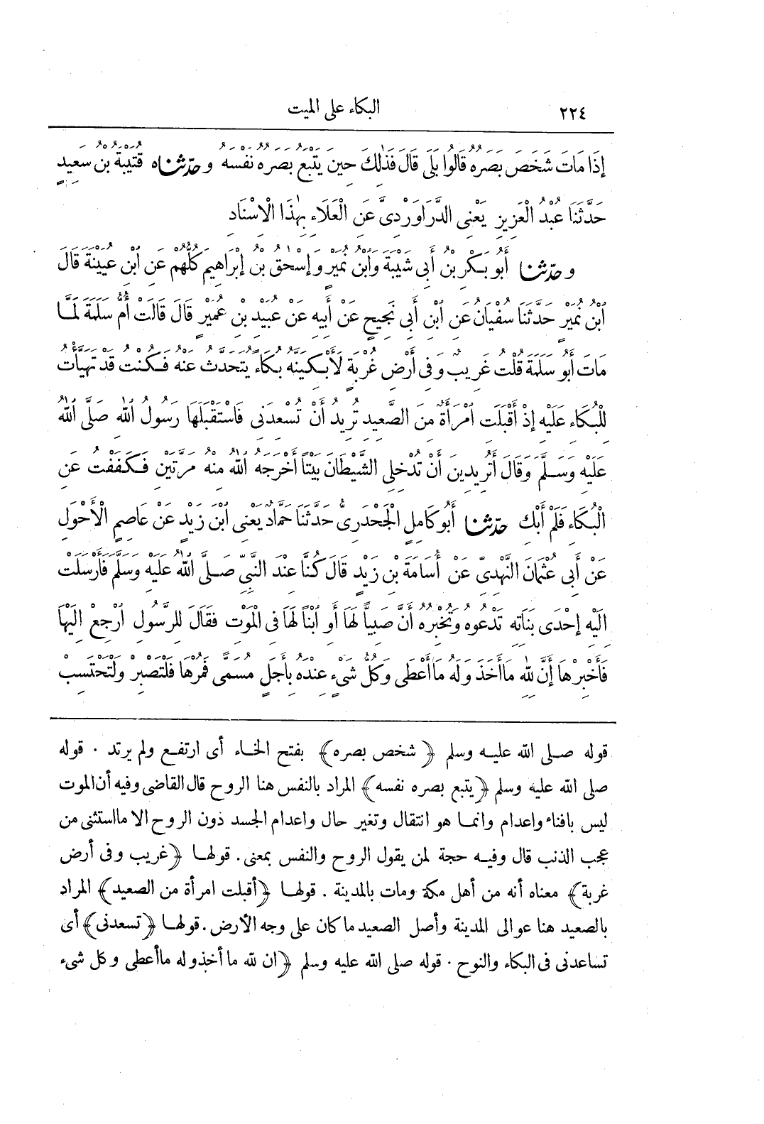 [922] قَوْلُهَا غَرِيبٌ وَفِي أَرْضِ غُرْبَةٍ مَعْنَاهُ أَنَّهُ مِنْ أَهْلِ مَكَّةَ وَمَاتَ بِالْمَدِينَةِ قَوْلُهَا أَقْبَلَتِ امْرَأَةٌ مِنَ الصَّعِيدِ الْمُرَادُ بِالصَّعِيدِ هُنَا عَوَالِي الْمَدِينَةِ وَأَصْلُ الصَّعِيدِ مَا كَانَ عَلَى وَجْهِ الْأَرْضِ قَوْلُهَا تُسْعِدُنِي أَيْ تُسَاعِدُنِي فِي الْبُكَاءِ وَالنَّوْحِ