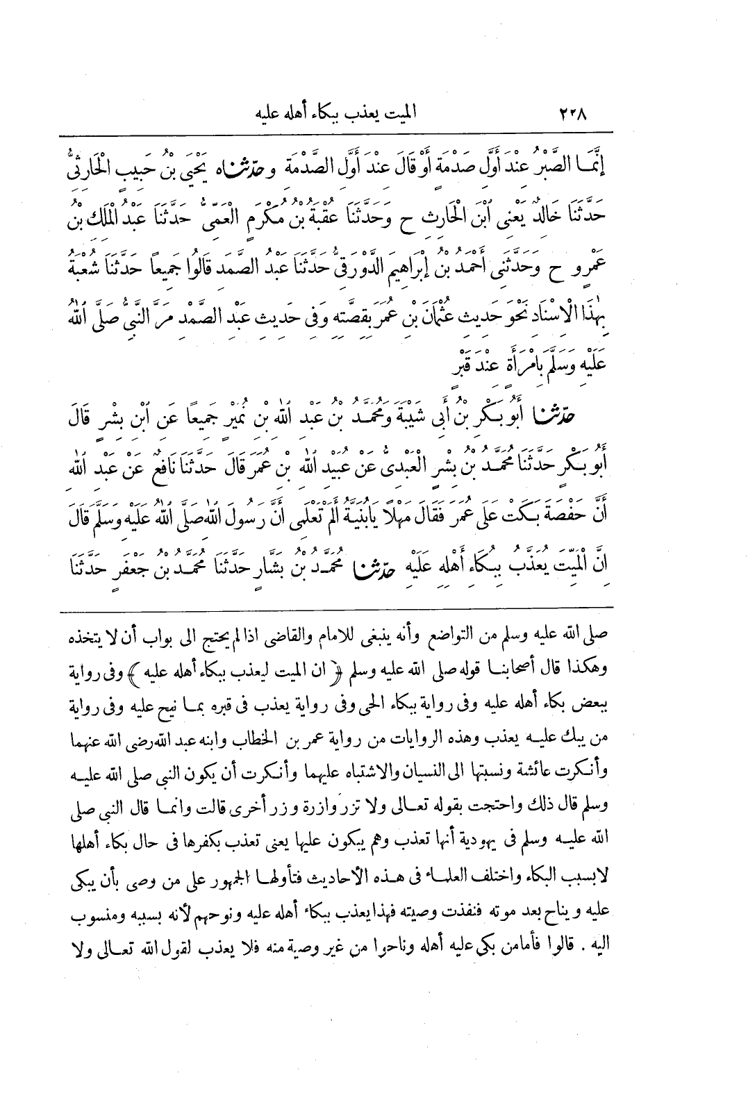 [927] قَوْلُهُ صَلَّى اللَّهُ عَلَيْهِ وَسَلَّمَ إِنَّ الْمَيِّتَ لَيُعَذَّبُ بِبُكَاءِ أَهْلِهِ عَلَيْهِ وَفِي رِوَايَةٍ بِبَعْضِ بُكَاءِ أَهْلِهِ عَلَيْهِ وَفِي رِوَايَةٍ بِبُكَاءِ الْحَيِّ وَفِي رِوَايَةٍ يُعَذَّبُ فِي قَبْرِهِ بِمَا نِيحَ عَلَيْهِ وَفِي رِوَايَةٍ مَنْ يَبْكِ عَلَيْهِ يُعَذَّبْ وَهَذِهِ الرِّوَايَاتُ مِنْ رِوَايَةِ عُمَرَ بْنِ الْخَطَّابِ وَابْنِهِ عَبْدِ اللَّهِ رَضِيَ اللَّهُ عَنْهُمَا وَأَنْكَرَتْ عَائِشَةُ وَنَسَبَتْهَا إِلَى النِّسْيَانِ وَالِاشْتِبَاهِ عَلَيْهِمَا وَأَنْكَرَتْ أَنْ يَكُونَ النَّبِيُّ صَلَّى اللَّهُ عَلَيْهِ وَسَلَّمَ قَالَ ذَلِكَ وَاحْتَجَّتْ بِقَوْلِهِ تَعَالَى وَلَا تَزِرُ وازرة وزر أخرى قَالَتْ وَإِنَّمَا قَالَ النَّبِيُّ صَلَّى اللَّهُ عَلَيْهِ وَسَلَّمَ فِي يَهُودِيَّةٍ أَنَّهَا تُعَذَّبُ وَهُمْ يَبْكُونَ عَلَيْهَا يَعْنِي تُعَذَّبُ بِكُفْرِهَا فِي حَالِ بُكَاءِ أَهْلِهَا لَا بِسَبَبِ الْبُكَاءِ وَاخْتَلَفَ الْعُلَمَاءُ فِي هَذِهِ الْأَحَادِيثِ فَتَأَوَّلَهَا الْجُمْهُورُ عَلَى مَنْ وَصَّى بِأَنْ يُبْكَى عَلَيْهِ وَيُنَاحَ بَعْدَ مَوْتِهِ فَنُفِّذَتْ وَصِيَّتُهُ فَهَذَا يُعَذَّبُ بِبُكَاءِ أَهْلِهِ عَلَيْهِ وَنَوْحِهِمْ لِأَنَّهُ بِسَبَبِهِ وَمَنْسُوبٌ إِلَيْهِ قَالُوا فَأَمَّا مَنْ بَكَى عَلَيْهِ أَهْلُهُ وَنَاحُوا مِنْ غَيْرِ وَصِيَّةٍ مِنْهُ فَلَا يُعَذَّبُ لِقَوْلِ اللَّهِ تَعَالَى وَلَا تزر وازرة وزر أخرى