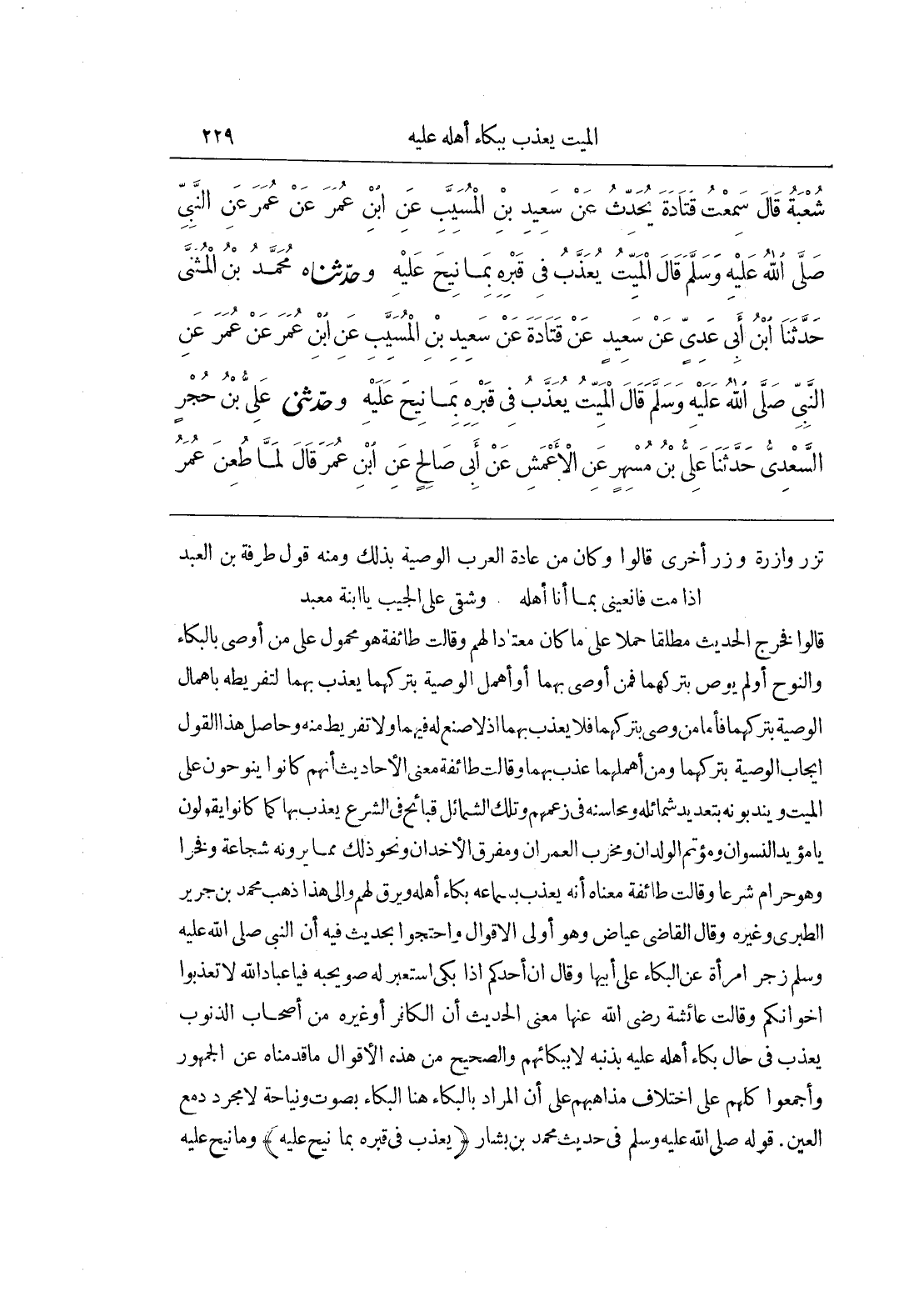 (قَالُوا فَخَرَجَ الْحَدِيثُ مُطْلَقًا حَمْلًا عَلَى مَا كَانَ مُعْتَادًا لَهُمْ وَقَالَتْ طَائِفَةٌ هُوَ مَحْمُولٌ عَلَى مَنْ أَوْصَى بِالْبُكَاءِ وَالنَّوْحِ أَوْ لَمْ يُوصِ بِتَرْكِهِمَا فَمَنْ أَوْصَى بِهِمَا أَوْ أهْمَلَ الْوَصِيَّةَ بِتَرْكِهِمَا يُعَذَّبُ بِهِمَا لِتَفْرِيطِهِ بِإِهْمَالِ الْوَصِيَّةِ بِتَرْكِهِمَا فَأَمَّا مَنْ وَصَّى بِتَرْكِهِمَا فَلَا يُعَذَّبُ بِهِمَا إِذْ لَا صُنْعَ لَهُ فِيهِمَا وَلَا تَفْرِيطَ مِنْهُ وَحَاصِلُ هَذَا الْقَوْلِ إِيجَابُ الْوَصِيَّةِ بِتَرْكِهِمَا وَمَنْ أَهْمَلَهُمَا عُذِّبَ بِهِمَا وَقَالَتْ طَائِفَةٌ مَعْنَى الْأَحَادِيثِ أَنَّهُمْ كَانُوا يَنُوحُونَ عَلَى الْمَيِّتِ وَيَنْدُبُونَهُ بِتَعْدِيدِ شَمَائِلِهِ وَمَحَاسِنِهِ فِي زَعْمِهِمْ وَتِلْكَ الشَّمَائِلُ قَبَائِحُ فِي الشَّرْعِ يعذب بها كما كانوا يقولون يا مؤيد النِّسْوَانِ وَمُؤَتِّمَ الْوِلْدَانِ وَمُخَرِّبَ الْعُمْرَانِ وَمُفَرِّقَ الْأَخْدَانِ وَنَحْوَ ذَلِكَ مِمَّا يَرَوْنَهُ شَجَاعَةً وَفَخْرًا وَهُوَ حَرَامٌ شَرْعًا وَقَالَتْ طَائِفَةٌ مَعْنَاهُ أَنَّهُ يُعَذَّبُ بِسَمَاعِهِ بُكَاءَ أَهْلِهِ وَيَرِقُّ لَهُمْ وَإِلَى هَذَا ذَهَبَ مُحَمَّدُ بْنُ جَرِيرٍ الطَّبَرِيُّ وَغَيْرُهُ وَقَالَ الْقَاضِي عِيَاضٌ وَهُوَ أَوْلَى الْأَقْوَالِ وَاحْتَجُّوا بِحَدِيثٍ فِيهِ أَنَّ النَّبِيَّ صَلَّى اللَّهُ عَلَيْهِ وَسَلَّمَ زَجَرَ امْرَأَةً عَنِ الْبُكَاءِ عَلَى أَبِيهَا وَقَالَ إِنَّ أَحَدَكُمْ إِذَا بَكَى اسْتَعْبَرَ لَهُ صُوَيْحِبُهُ فَيَا عِبَادَ اللَّهِ لَا تُعَذِّبُوا إِخْوَانَكُمْ وَقَالَتْ عَائِشَةُ رَضِيَ اللَّهُ عَنْهَا مَعْنَى الْحَدِيثِ أَنَّ الْكَافِرَ أَوْ غَيْرَهُ مِنْ أَصْحَابِ الذُّنُوبِ يُعَذَّبُ فِي حَالِ بُكَاءِ أَهْلِهِ عَلَيْهِ بِذَنْبِهِ لَا بِبُكَائِهِمْ وَالصَّحِيحُ مِنْ هَذِهِ الْأَقْوَالِ مَا قَدَّمْنَاهُ عَنِ الْجُمْهُورِ وَأَجْمَعُوا كُلُّهمْ عَلَى اخْتِلَافِ مَذَاهِبِهِمْ عَلَى أَنَّ الْمُرَادَ بِالْبُكَاءِ هُنَا الْبُكَاءُ بِصَوْتٍ ونياحة لا مجرد دمع العين قوله ص فِي حَدِيثِ مُحَمَّدِ بْنِ بَشَّارٍ يُعَذَّبُ فِي قبره بما نيح عليه وما نيح عليه)