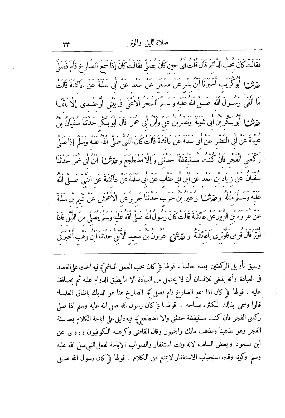 [743] قَوْلُهَا كَانَ رَسُولُ اللَّهِ صَلَّى اللَّهُ عَلَيْهِ وَسَلَّمَ إِذَا صَلَّى رَكْعَتَيِ الْفَجْرِ فَإِنْ كُنْتُ مُسْتَيْقِظَةً حَدَّثَنِي وَإِلَّا اضْطَجَعَ فِيهِ دَلِيلٌ عَلَى إِبَاحَةِ الْكَلَامِ بَعْدَ سُنَّةِ الْفَجْرِ وَهُوَ مَذْهَبُنَا وَمَذْهَبُ مَالِكٍ وَالْجُمْهُورِ وَقَالَ الْقَاضِي وَكَرِهَهُ الكوفيون وروى عن بن مَسْعُودٍ وَبَعْضِ السَّلَفِ لِأَنَّهُ وَقْتُ اسْتِغْفَارٍ وَالصَّوَابُ الْإِبَاحَةُ لِفِعْلِ النَّبِيِّ صَلَّى اللَّهُ عَلَيْهِ وَسَلَّمَ وَكَوْنُهُ وَقْتَ اسْتِحْبَابِ الِاسْتِغْفَارِ لَا يَمْنَعُ مِنَ الْكَلَامِ