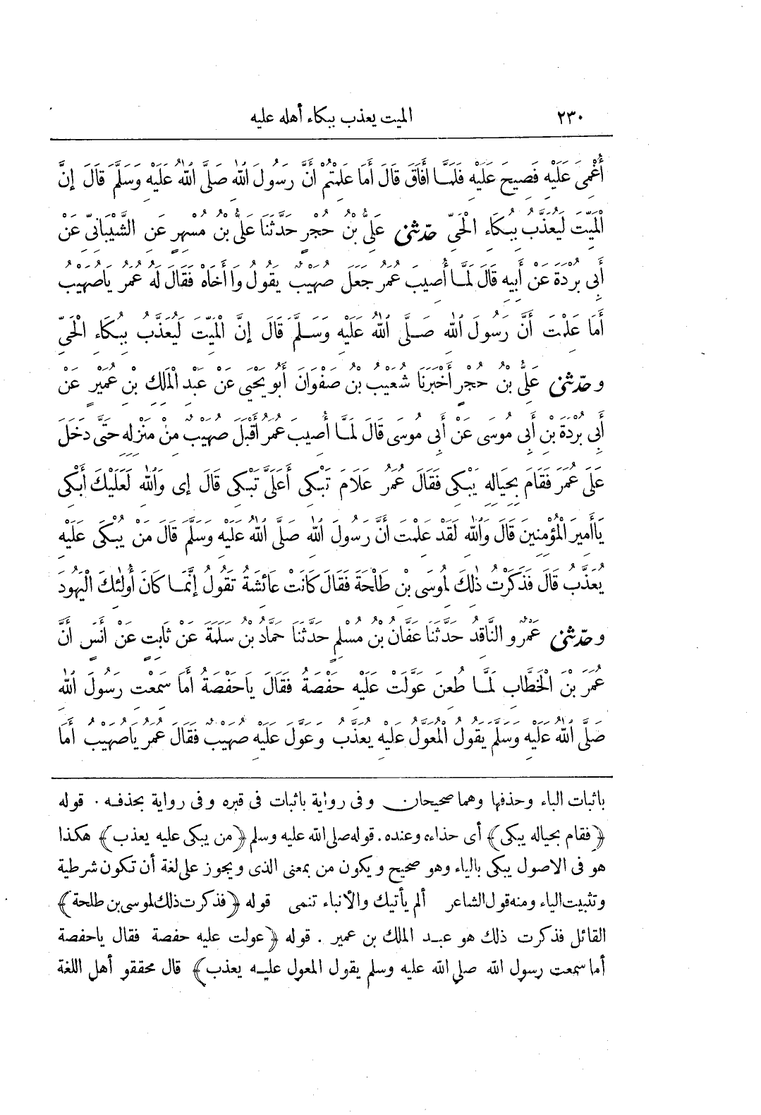 (قَوْلُهُ فَذَكَرْتُ ذَلِكَ لِمُوسَى بْنِ طَلْحَةَ الْقَائِلُ فَذَكَرْتُ ذَلِكَ هُوَ عَبْدُ الْمَلِكِ بْنُ عُمَيْرٍ قَوْلُهُ عَوَّلَتْ عَلَيْهِ حَفْصَةُ فَقَالَ يَا حَفْصَةُ أَمَا سَمِعْتِ رَسُولَ اللَّهِ صَلَّى اللَّهُ عَلَيْهِ وَسَلَّمَ يَقُولُ الْمُعَوَّلُ عَلَيْهِ يُعَذَّبُ قَالَ مُحَقِّقُو أهل اللغة)