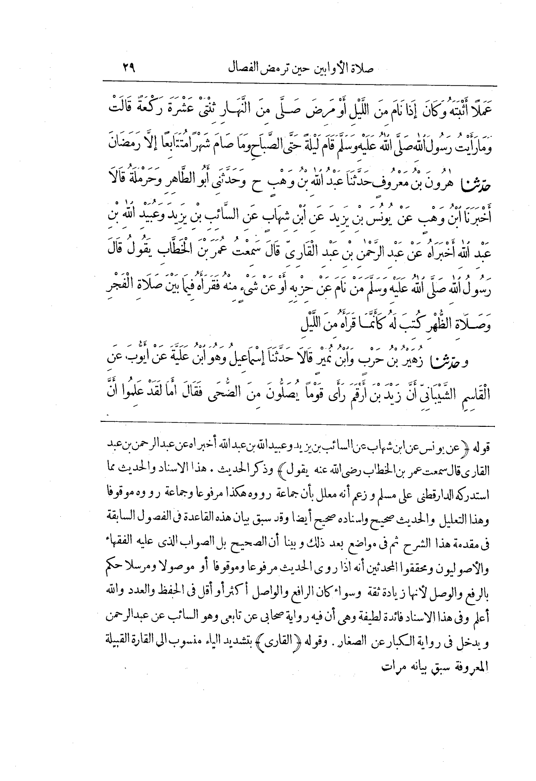 [747] عن يونس عن بن شهاب عن السائب بن يزيد وعبيد اللَّهِ بْنِ عَبْدِ اللَّهِ أَخْبَرَاهُ عَنْ عَبْدِ الرحمن بن عبد القارىء قَالَ سَمِعْتُ عُمَرَ بْنَ الْخَطَّابِ رَضِيَ اللَّهُ عَنْهُ يَقُولُ وَذَكَرَ الْحَدِيثَ هَذَا الْإِسْنَادُ وَالْحَدِيثُ مِمَّا اسْتَدْرَكَهُ الدَّارَقُطْنِيُّ عَلَى مُسْلِمٍ وَزَعَمَ أَنَّهُ مُعَلَّلٌ بِأَنَّ جَمَاعَةً رَوَوْهُ هَكَذَا مَرْفُوعًا وَجَمَاعَةً رَوَوْهُ مَوْقُوفًا وَهَذَا التَّعْلِيلُ وَالْحَدِيثُ صَحِيحٌ وَإِسْنَادُهُ صَحِيحٌ أَيْضًا وَقَدْ سَبَقَ بَيَانُ هَذِهِ الْقَاعِدَةِ فِي الْفُصُولِ السَّابِقَةِ فِي مُقَدِّمَةِ هَذَا الشَّرْحِ ثُمَّ فِي مَوَاضِعَ بَعْدَ ذَلِكَ وَبَيَّنَّا أَنَّ الصَّحِيحَ بَلِ الصَّوَابُ الَّذِي عَلَيْهِ الْفُقَهَاءُ وَالْأُصُولِيُّونَ ومحققوا الْمُحَدِّثِينَ أَنَّهُ إِذَا رُوِيَ الْحَدِيثُ مَرْفُوعًا وَمَوْقُوفًا أَوْ مَوْصُولًا وَمُرْسَلًا حُكِمَ بِالرَّفْعِ وَالْوَصْلِ لِأَنَّهَا زِيَادَةُ ثِقَةٍ وَسَوَاءٌ كَانَ الرَّافِعُ وَالْوَاصِلُ أَكْثَرَ أَوْ أقَلَّ فِي الْحِفْظِ وَالْعَدَدِ وَاللَّهُ أَعْلَمُ وَفِي هَذَا الْإِسْنَادِ فَائِدَةٌ لَطِيفَةٌ وَهِيَ أَنَّ فِيهِ رِوَايَةَ صَحَابِيٍّ عَنْ تَابِعِيٍّ وَهُوَ السَّائِبُ عَنْ عَبْدِ الرَّحْمَنِ وَيَدْخُلُ فِي رِوَايَةِ الْكِبَارِ عن الصغار وقوله القارىء بِتَشْدِيدِ الْيَاءِ مَنْسُوبٌ إِلَى الْقَارَةِ الْقَبِيلَةِ الْمَعْرُوفَةِ سبق بيانه مرات