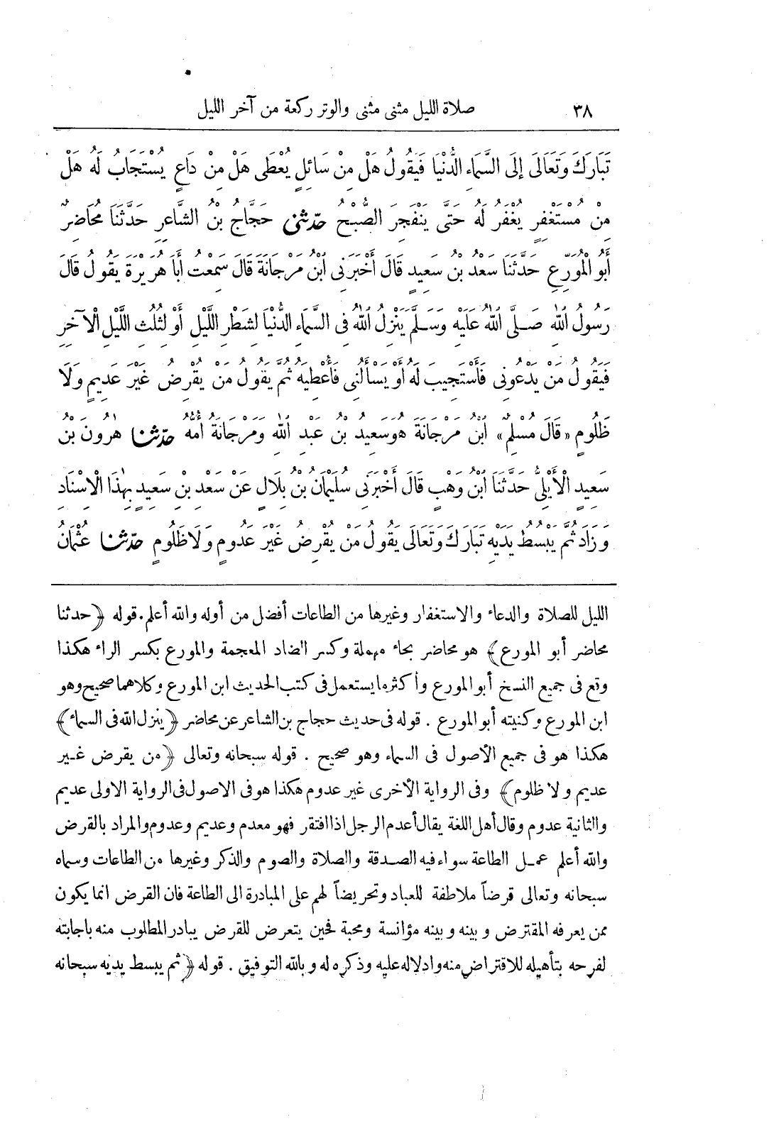 اللَّيْلِ لِلصَّلَاةِ وَالدُّعَاءِ وَالِاسْتِغْفَارِ وَغَيْرِهَا مِنَ الطَّاعَاتِ أفضل من أوله وَاللَّهُ أَعْلَمُ قَوْلُهُ حَدَّثَنَا مُحَاضِرٌ أَبُو الْمُوَرِّعِ هُوَ مُحَاضِرٌ بِحَاءٍ مُهْمَلَةٍ وَكَسْرِ الضَّادِ الْمُعْجَمَةِ وَالْمُوَرِّعُ بِكَسْرِ الرَّاءِ هَكَذَا وَقَعَ فِي جَمِيعِ النُّسَخِ أَبُو الْمُوَرِّعِ وَأَكْثَرُ مَا يُسْتَعْمَلُ فِي كتب الحديث بن المورع وكلاهما صحيح وهو بن الْمُوَرِّعِ وَكُنْيَتُهُ أَبُو الْمُوَرِّعِ قَوْلُهُ فِي حَدِيثِ حَجَّاجِ بْنِ الشَّاعِرِ عَنْ مُحَاضِرٍ يَنْزِلُ اللَّهُ فِي السَّمَاءِ هَكَذَا هُوَ فِي جَمِيعِ الْأُصُولِ فِي السَّمَاءِ وَهُوَ صَحِيحٌ قَوْلُهُ سُبْحَانَهُ وَتَعَالَى مَنْ يُقْرِضُ غَيْرَ عَدِيمٍ وَلَا ظَلُومٍ وَفِي الرِّوَايَةِ الْأُخْرَى غَيْرَ عَدُومٍ هَكَذَا هُوَ فِي الْأُصُولِ فِي الرِّوَايَةِ الْأُولَى عَدِيمٍ وَالثَّانِيَةِ عَدُومٍ وَقَالَ أَهْلُ اللُّغَةِ يُقَالُ أَعْدَمَ الرَّجُلُ إِذَا افْتَقَرَ فَهُوَ مُعْدِمٌ وَعَدِيمٌ وَعَدُومٌ وَالْمُرَادُ بِالْقَرْضِ وَاللَّهُ أَعْلَمُ عَمَلُ الطَّاعَةِ سَوَاءٌ فِيهِ الصَّدَقَةُ وَالصَّلَاةُ وَالصَّوْمُ وَالذِّكْرُ وَغَيْرُهَا مِنَ الطَّاعَاتِ وَسَمَّاهُ سُبْحَانَهُ وَتَعَالَى قَرْضًا مُلَاطَفَةً لِلْعِبَادِ وَتَحْرِيضًا لَهُمْ عَلَى الْمُبَادَرَةِ إِلَى الطَّاعَةِ فَإِنَّ الْقَرْضَ إِنَّمَا يَكُونُ مِمَّنْ يَعْرِفُهُ الْمُقْتَرِضُ وَبَيْنَهُ وَبَيْنَهُ مُؤَانَسَةٌ وَمَحَبَّةٌ فَحِينَ يَتَعَرَّضُ لِلْقَرْضِ يُبَادِرُ الْمَطْلُوبُ مِنْهُ بِإِجَابَتِهِ لِفَرَحِهِ بِتَأْهِيلِهِ لِلِاقْتِرَاضِ مِنْهُ وَإِدْلَالِهِ عَلَيْهِ وَذِكْرِهِ لَهُ وَبِاللَّهِ التَّوْفِيقُ قَوْلُهُ ثُمَّ يَبْسُطُ يديه سبحانه