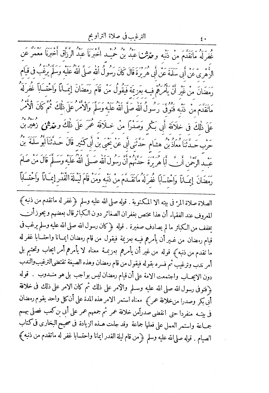 [760] قَوْلُهُ صَلَّى اللَّهُ عَلَيْهِ وَسَلَّمَ غُفِرَ لَهُ مَا تَقَدَّمَ مِنْ ذَنْبِهِ الْمَعْرُوفُ عِنْدَ الْفُقَهَاءِ أَنَّ هَذَا مُخْتَصٌّ بِغُفْرَانِ الصَّغَائِرِ دُونَ الْكَبَائِرِ قَالَ بَعْضُهُمْ وَيَجُوزُ أَنْ يُخَفِّفَ مِنَ الْكَبَائِرِ مَا لَمْ يُصَادِفْ صَغِيرَةً قَوْلُهُ كَانَ رَسُولُ اللَّهِ صَلَّى اللَّهُ عَلَيْهِ وَسَلَّمَ يُرَغِّبُ فِي قِيَامِ رَمَضَانَ مِنْ غَيْرِ أَنْ يَأْمُرَهُمْ فِيهِ بِعَزِيمَةٍ فَيَقُولُ مَنْ قَامَ رَمَضَانَ إِيمَانًا وَاحْتِسَابًا غُفِرَ لَهُ مَا تَقَدَّمَ مِنْ ذَنْبِهِ قَوْلُهُ مِنْ غَيْرِ أَنْ يَأْمُرَهُمْ بِعَزِيمَةٍ مَعْنَاهُ لَا يَأْمُرُهُمْ أَمْرَ إِيجَابٍ وَتَحْتِيمٍ بَلْ أَمْرَ نَدْبٍ وَتَرْغِيبٍ ثُمَّ فَسَّرَهُ بِقَوْلِهِ فَيَقُولُ مَنْ قَامَ رَمَضَانَ وَهَذِهِ الصِّيغَةُ تَقْتَضِي التَّرْغِيبَ وَالنَّدْبَ دُونَ الْإِيجَابِ وَاجْتَمَعَتِ الْأُمَّةُ عَلَى أَنَّ قِيَامَ رَمَضَانَ لَيْسَ بِوَاجِبٍ بَلْ هُوَ مَنْدُوبٌ قَوْلُهُ فَتُوُفِيَ رَسُولُ اللَّهِ صَلَّى اللَّهُ عَلَيْهِ وَسَلَّمَ وَالْأَمْرُ عَلَى ذَلِكَ ثُمَّ كَانَ الْأَمْرُ عَلَى ذَلِكَ فِي خِلَافَةِ أَبِي بَكْرٍ وَصَدْرًا مِنْ خِلَافَةِ عُمَرَ مَعْنَاهُ اسْتَمَرَّ الْأَمْرُ هَذِهِ الْمُدَّةَ عَلَى أَنَّ كُلَّ وَاحِدٍ يَقُومُ رَمَضَانَ فِي بَيْتِهِ منفردا حتى انقضى صدرا مِنْ خِلَافَةِ عُمَرَ ثُمَّ جَمَعَهُمْ عُمَرُ عَلَى أُبَيِّ بْنِ كَعْبٍ فَصَلَّى بِهِمْ جَمَاعَةً وَاسْتَمَرَّ الْعَمَلُ عَلَى فِعْلِهَا جَمَاعَةً وَقَدْ جَاءَتْ هَذِهِ الزِّيَادَةُ فِي صَحِيحِ الْبُخَارِيِّ فِي كِتَابِ الصِّيَامِ قَوْلُهُ صَلَّى اللَّهُ عَلَيْهِ وَسَلَّمَ مَنْ قَامَ لَيْلَةَ الْقَدْرِ إِيمَانًا وَاحْتِسَابًا غُفِرَ لَهُ مَا تَقَدَّمَ مِنْ ذَنْبِهِ